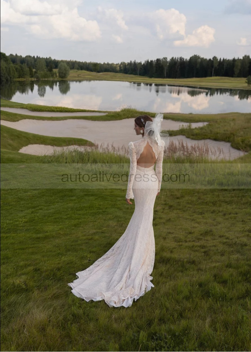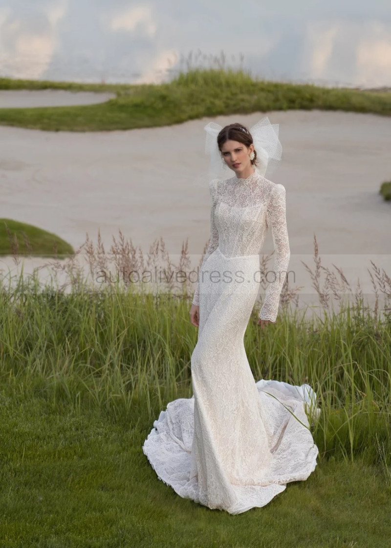 Long Sleeves Ivory Allover Lace Keyhole Back Wedding Dress