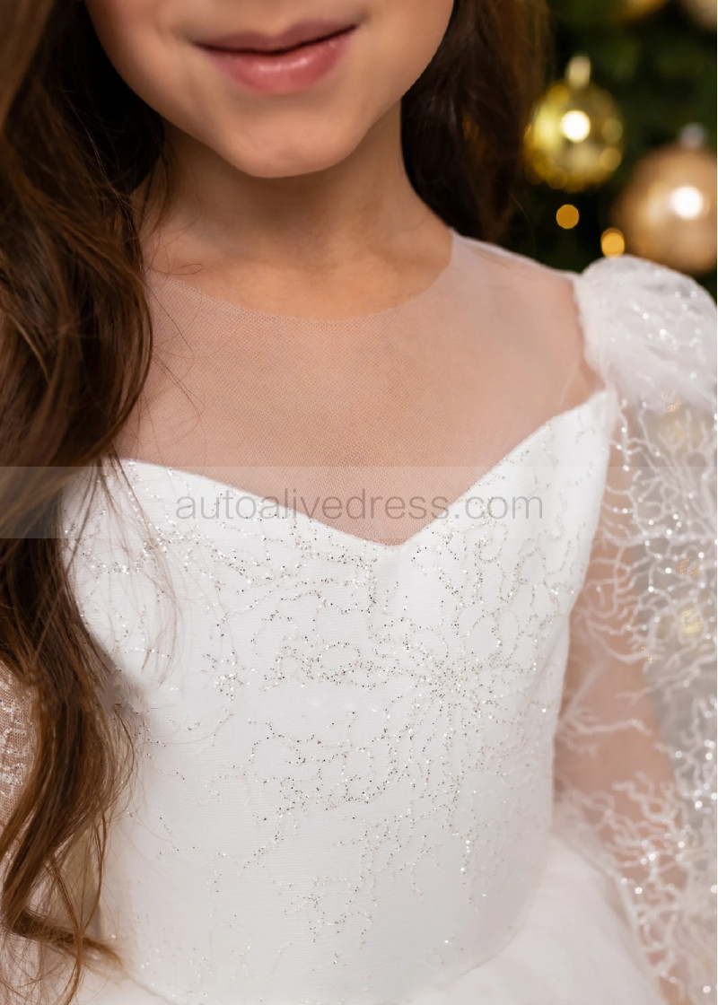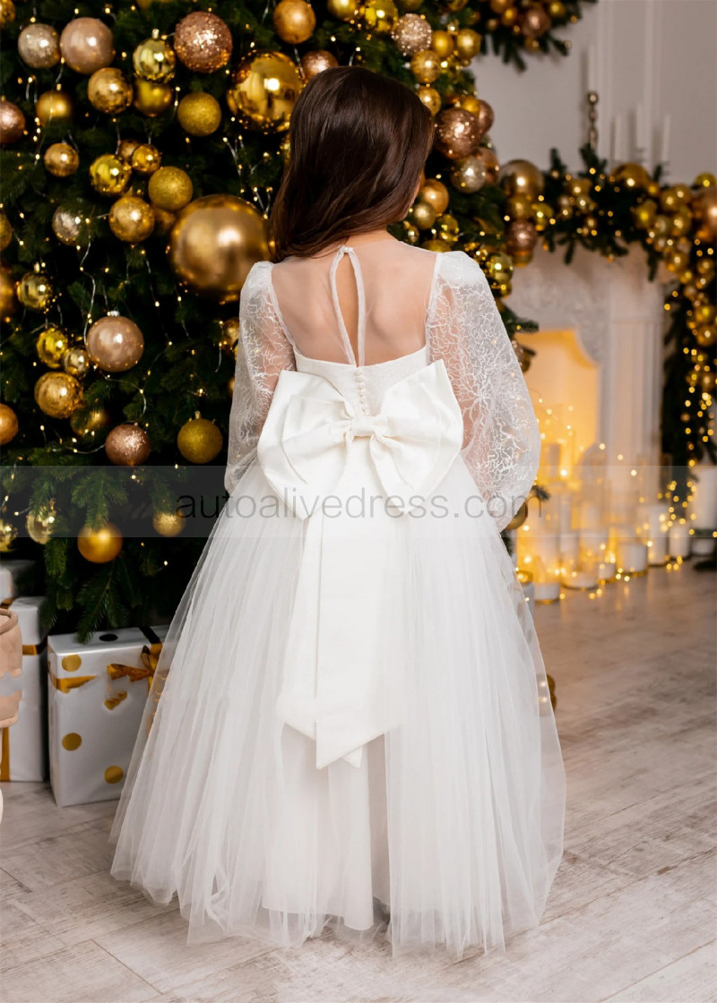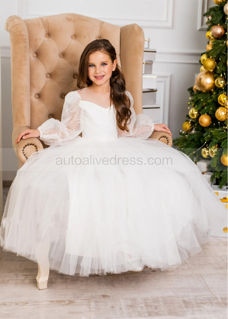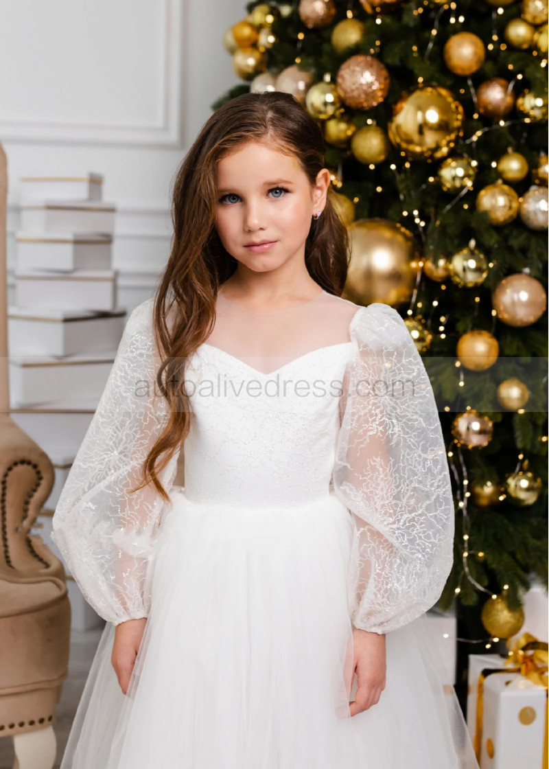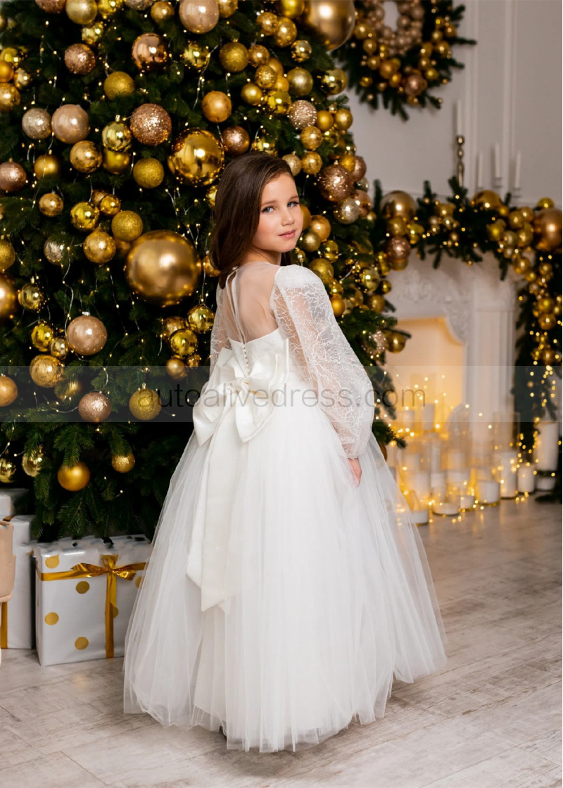 Long Sleeves Ivory Delicate Lace Tulle Flower Girl Dress