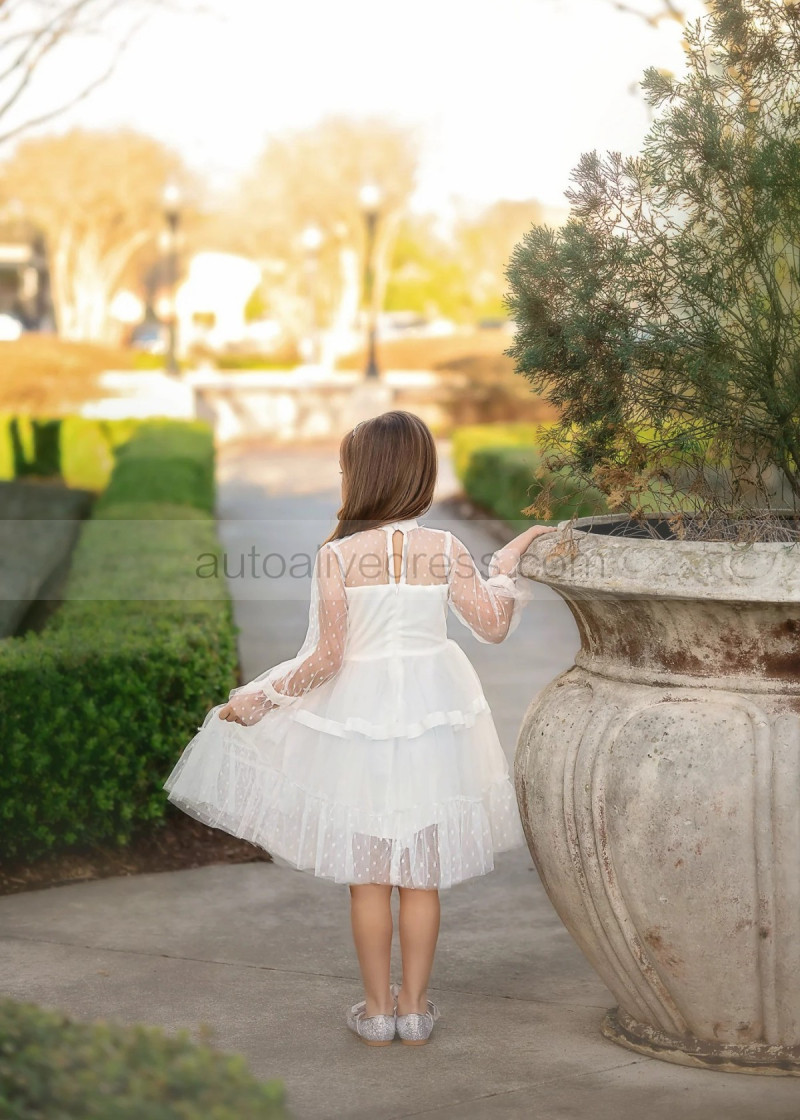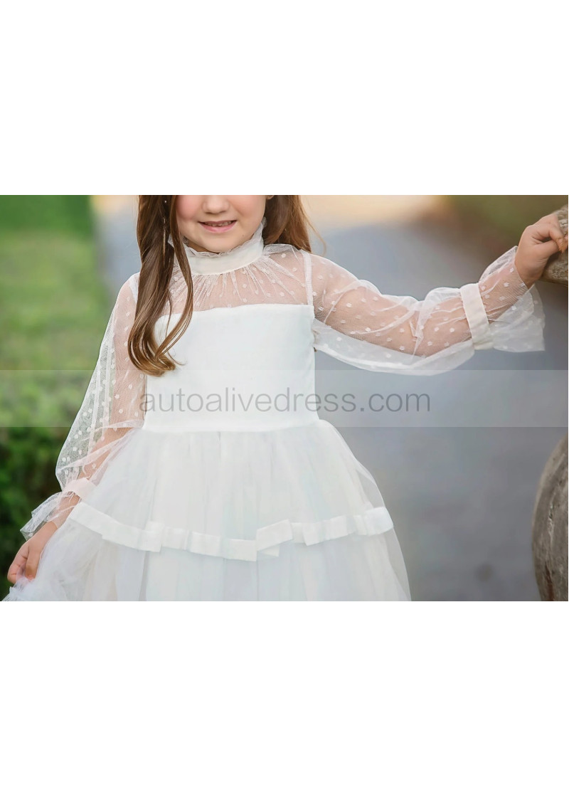 Long Sleeves Ivory Dotted Tulle Velvet Cute Flower Girl Dress