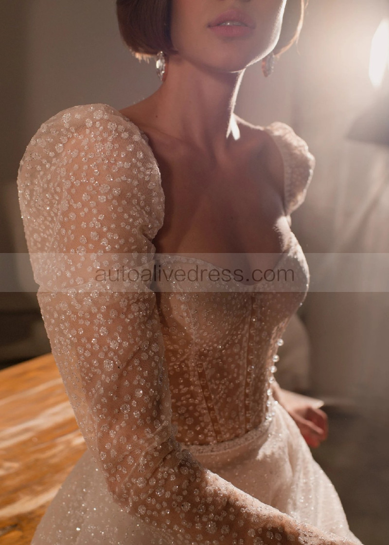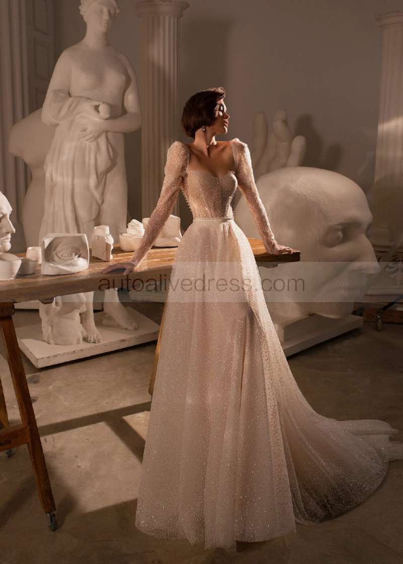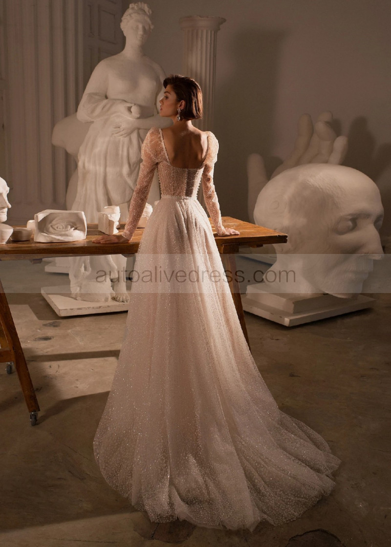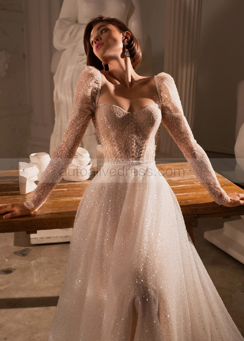 Long Sleeves Ivory Glitter Tulle Sparkly Wedding Dress