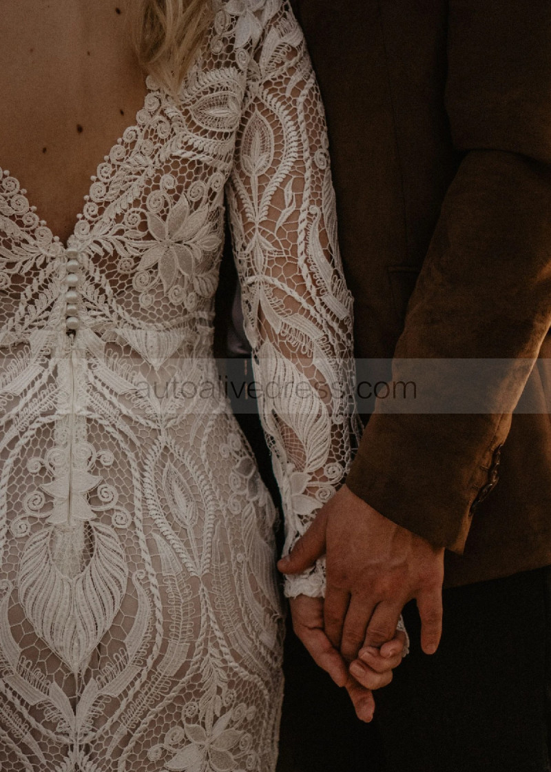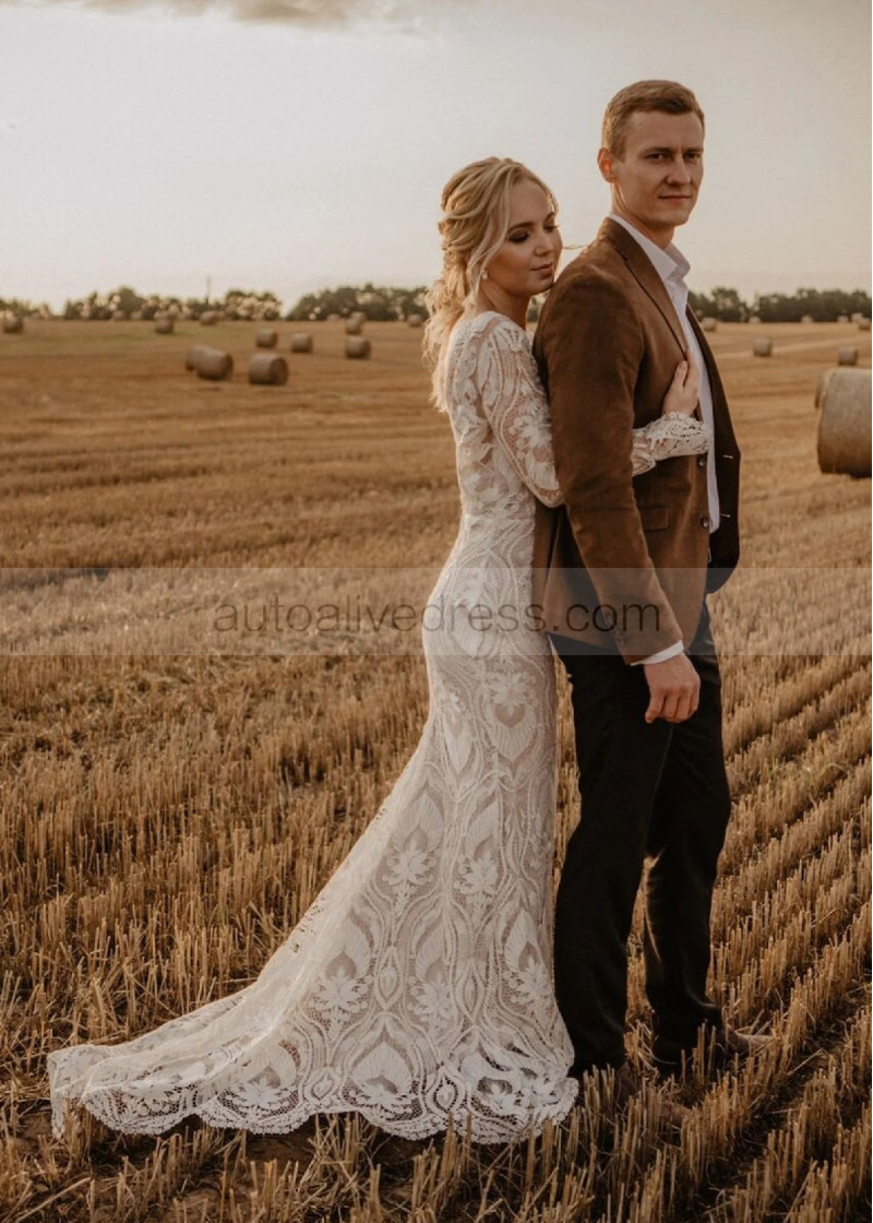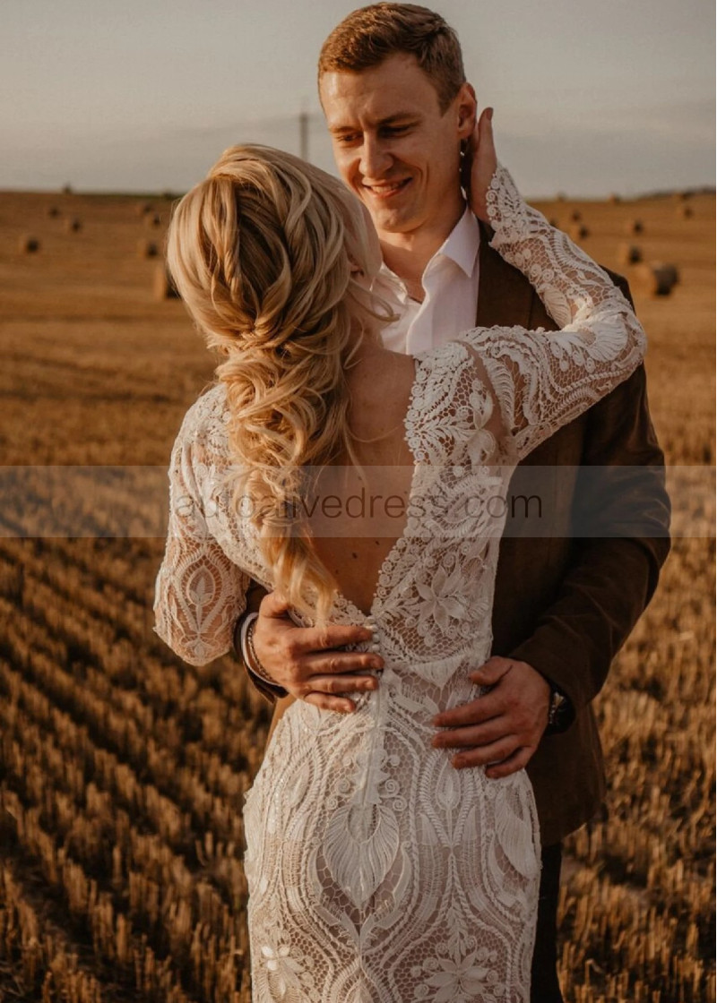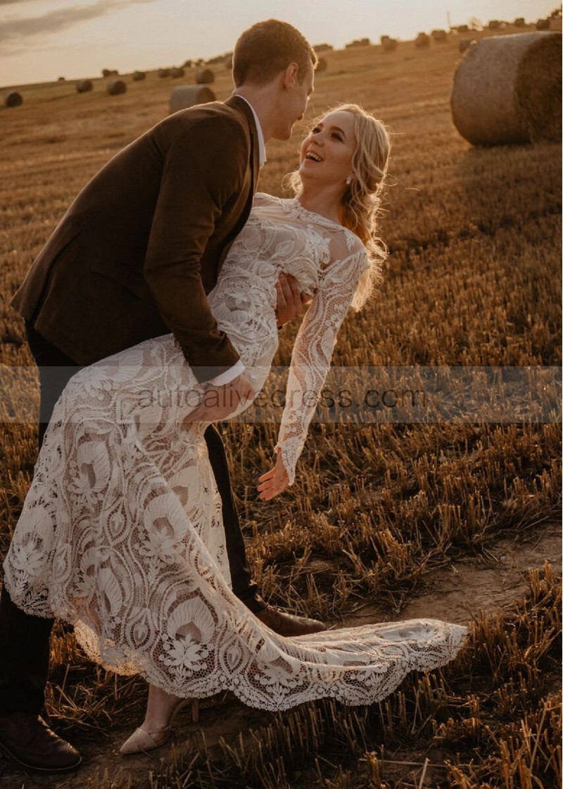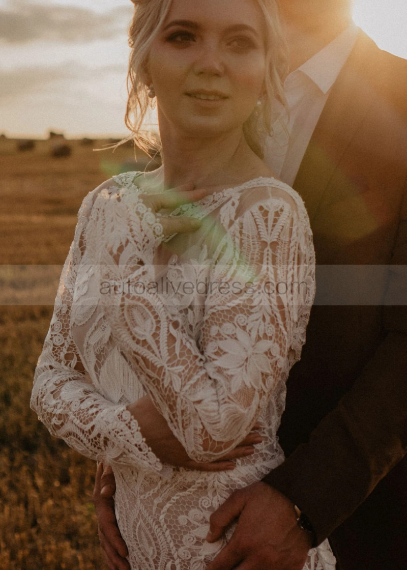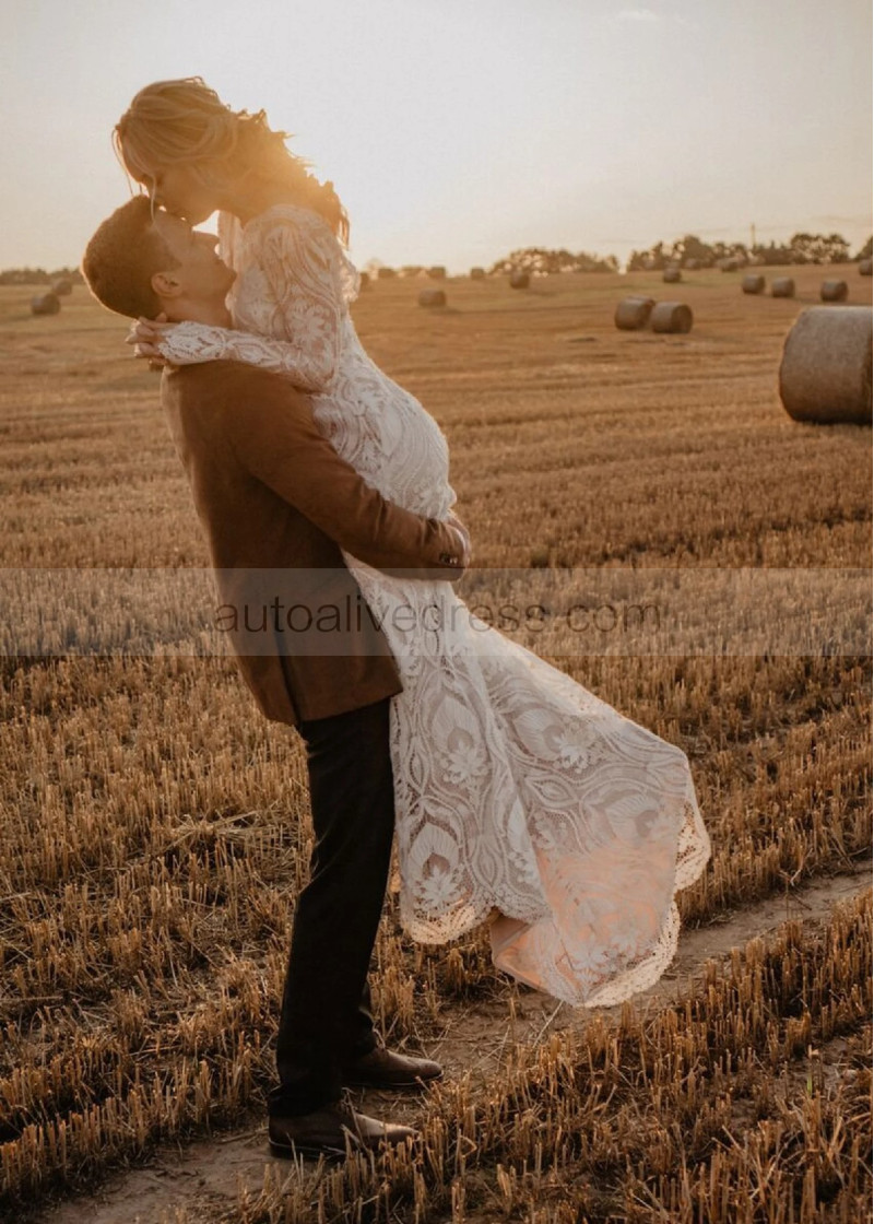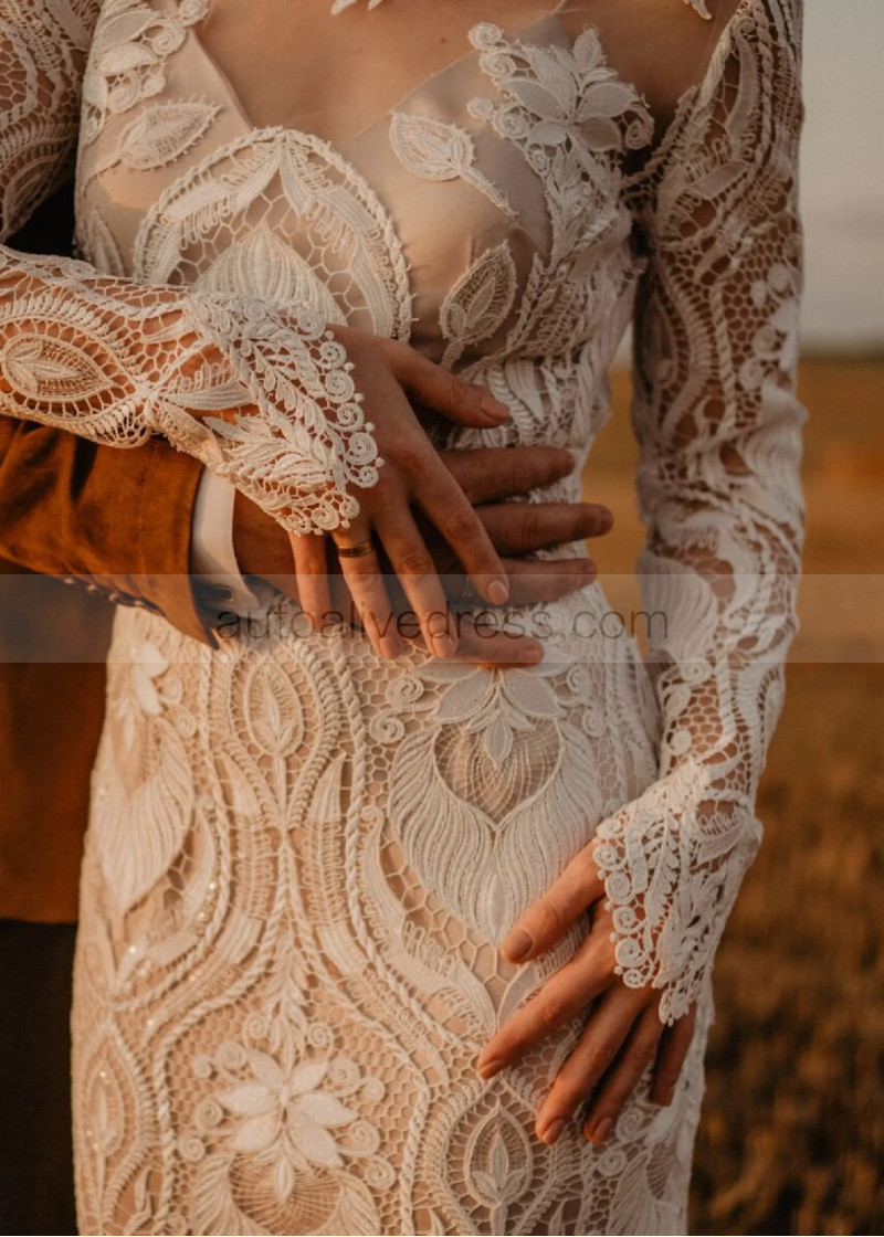 Long Sleeves Ivory Lace Bohemian Wedding Dress