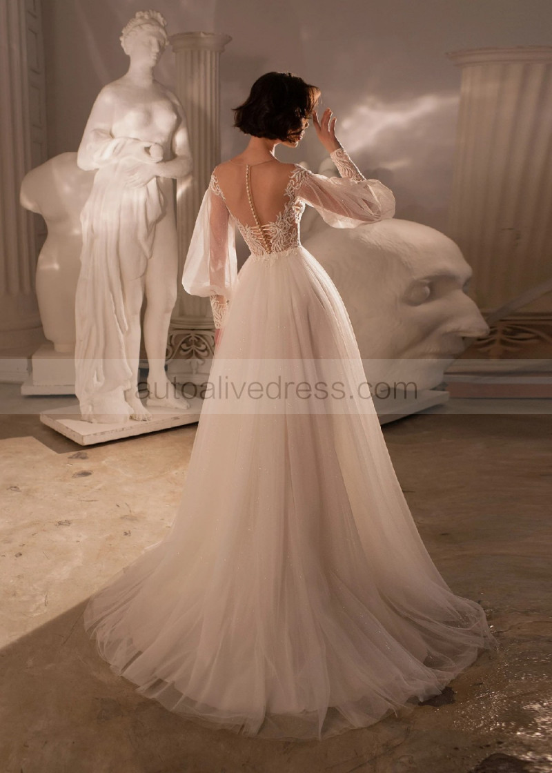 Long Sleeves Ivory Lace Dots Tulle Gorgeous Wedding Dress