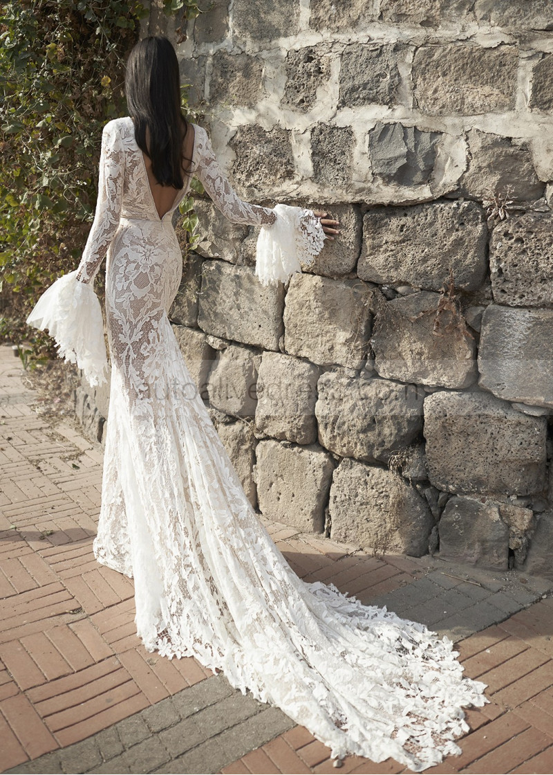 Long Sleeves Ivory Lace Tulle Bohemian Wedding Dress