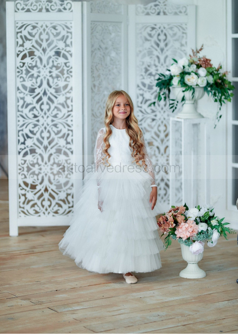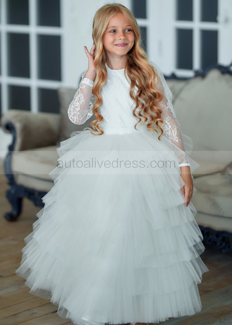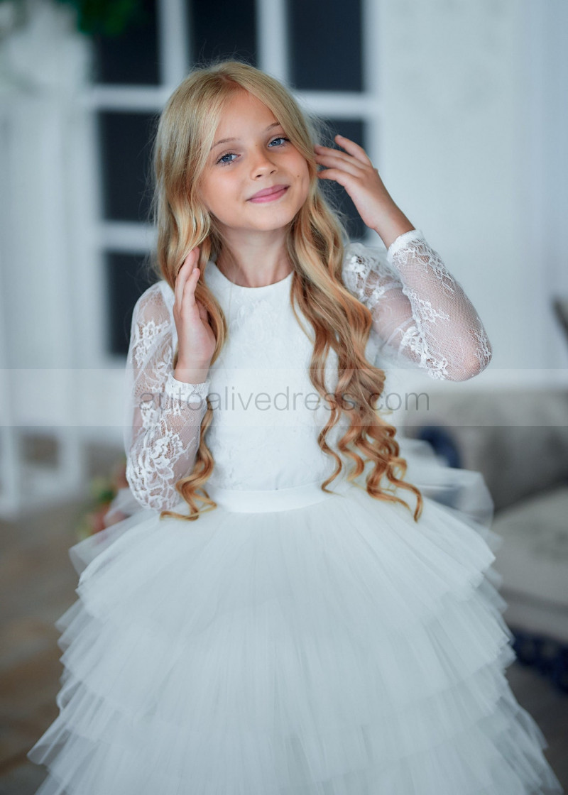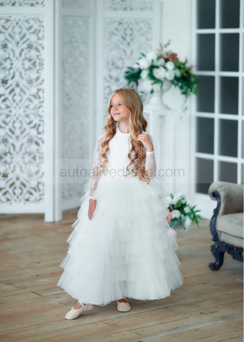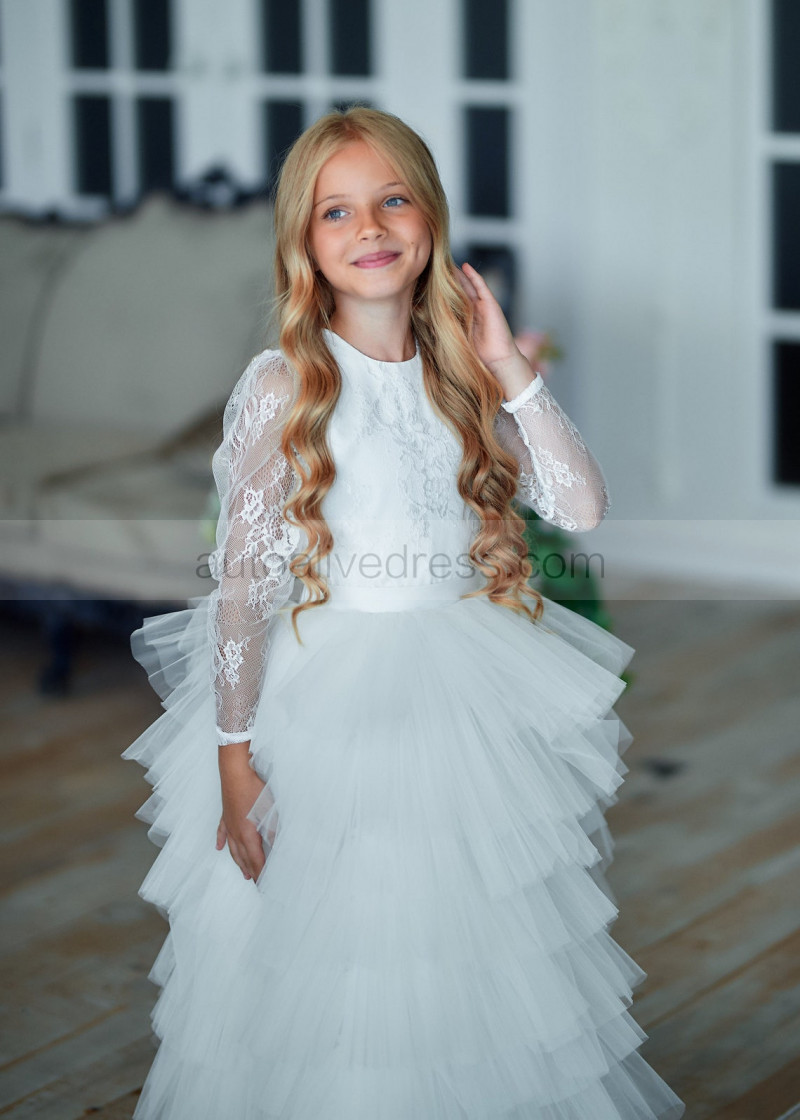 Long Sleeves Ivory Lace Tulle Ruffled Flower Girl Dress