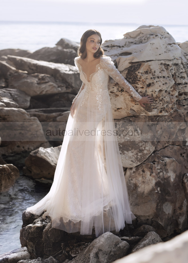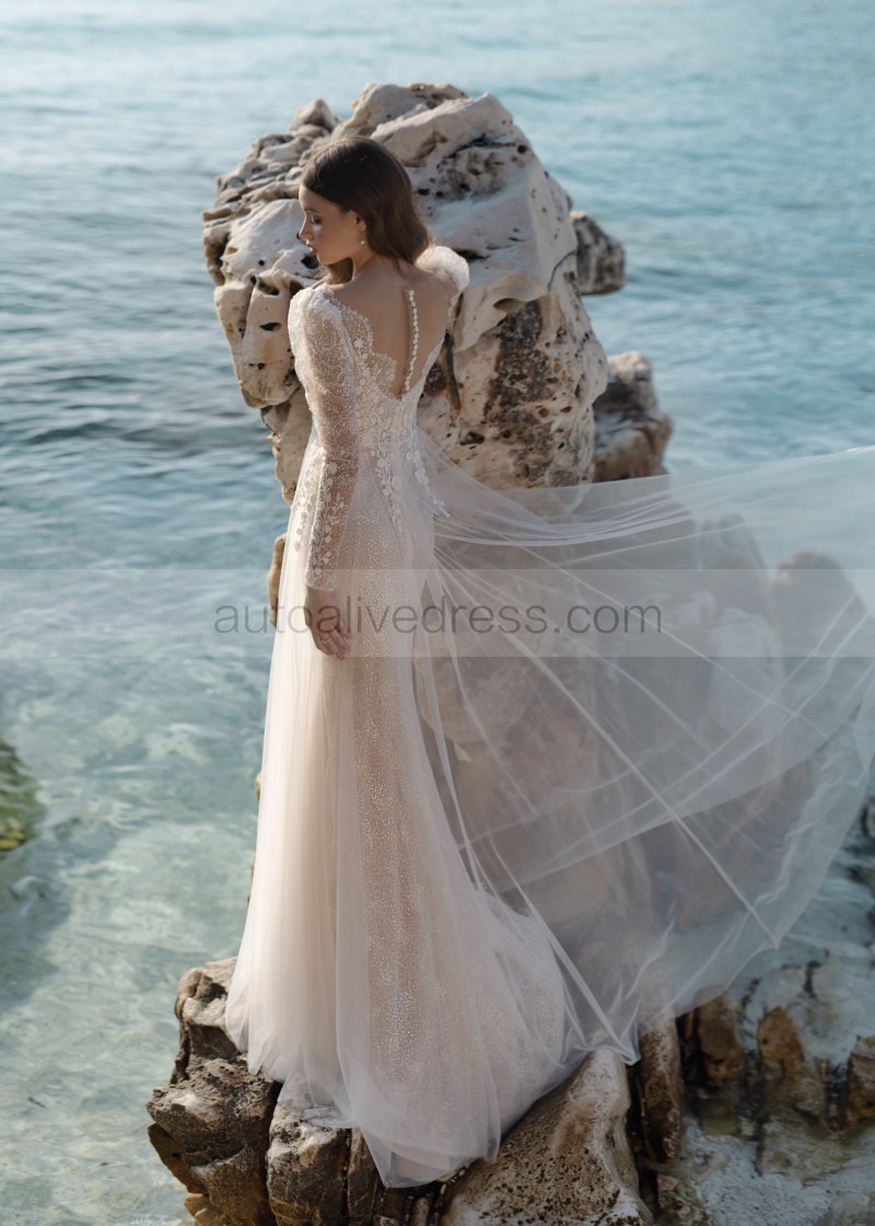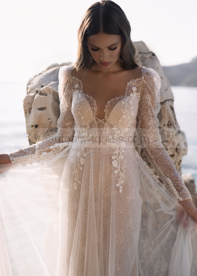 Long Sleeves Ivory Lace Tulle Sparkly Boho Beach Wedding Dress