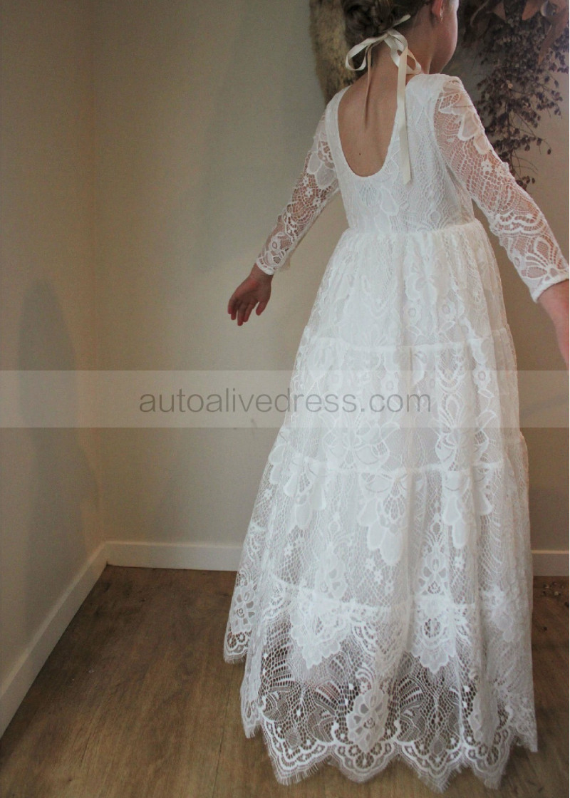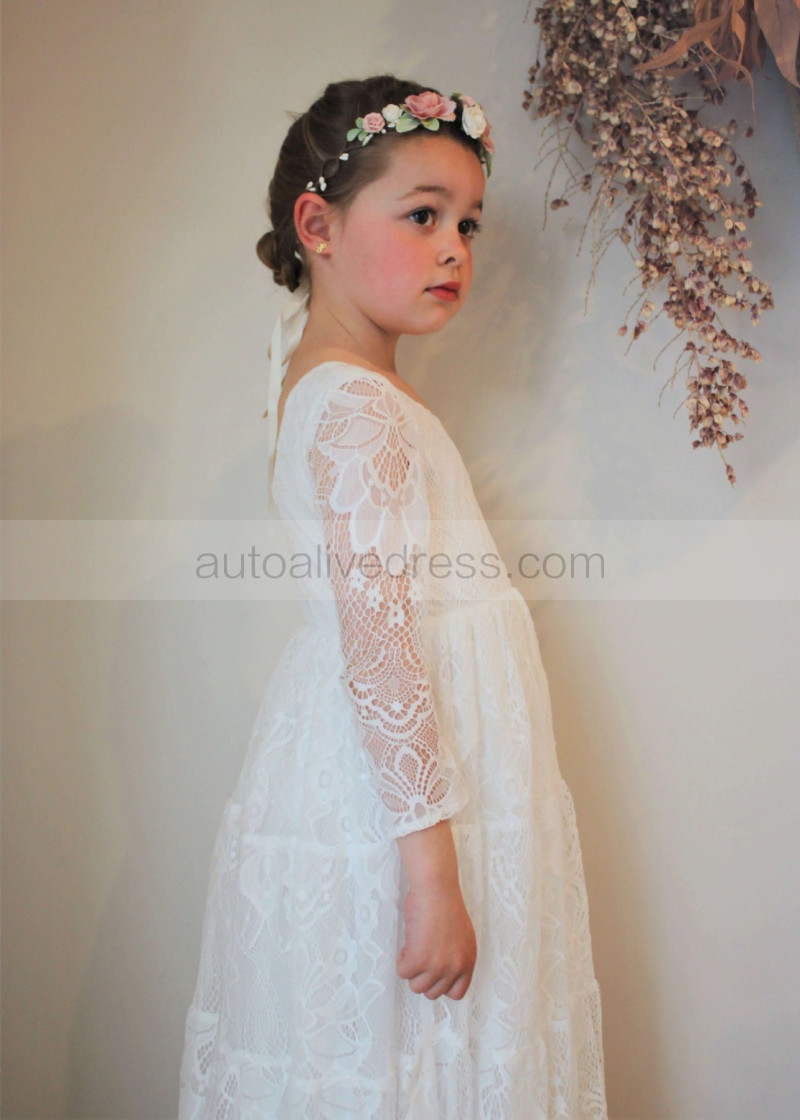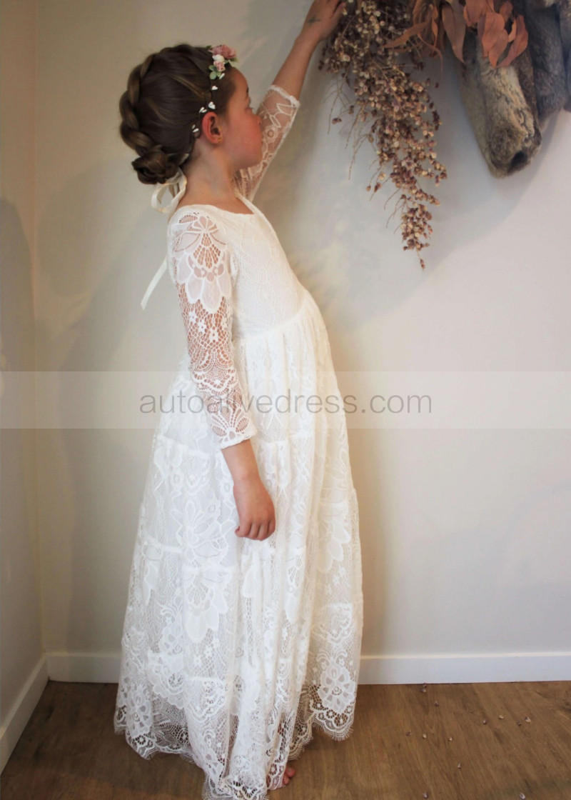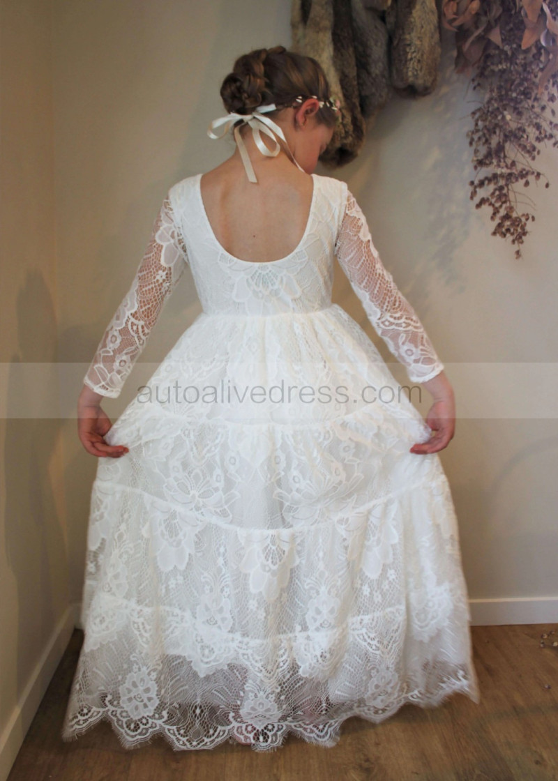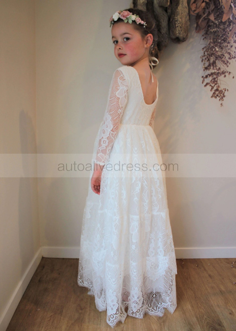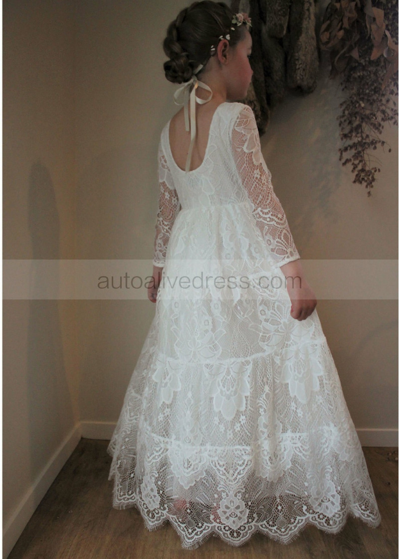 Long Sleeves Ivory Lace Vintage Flower Girl Dress