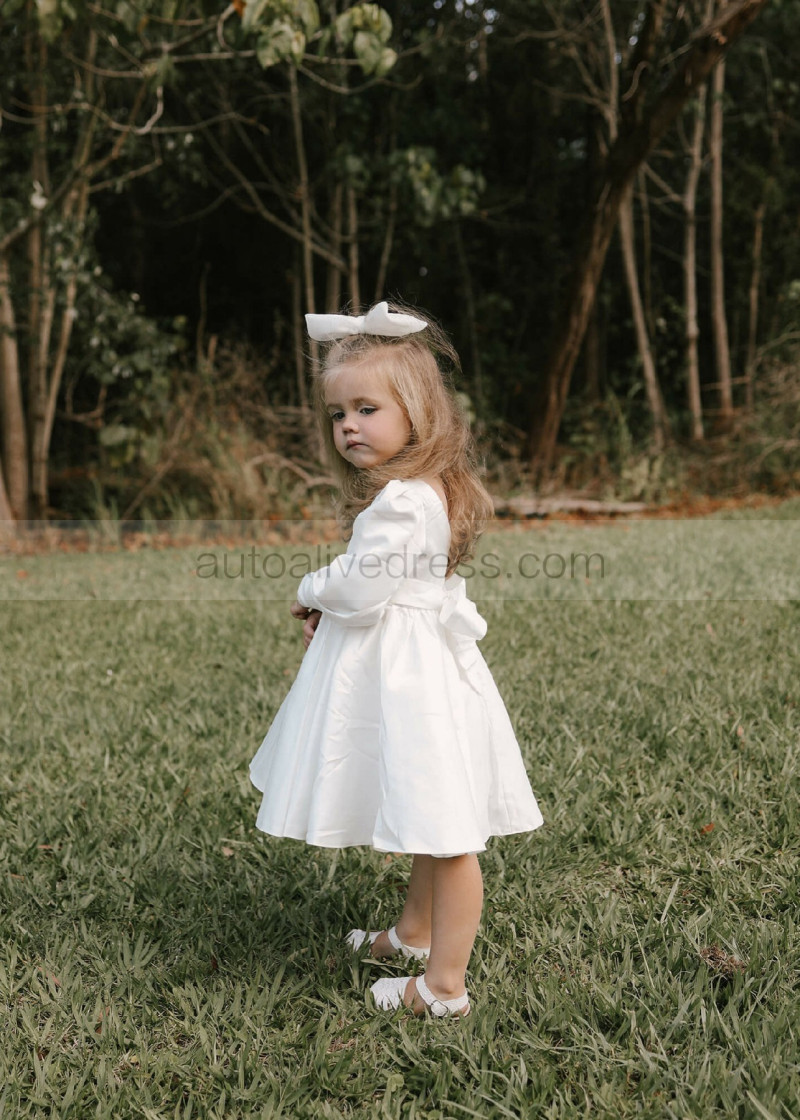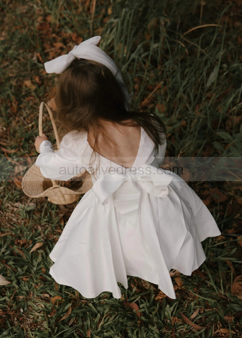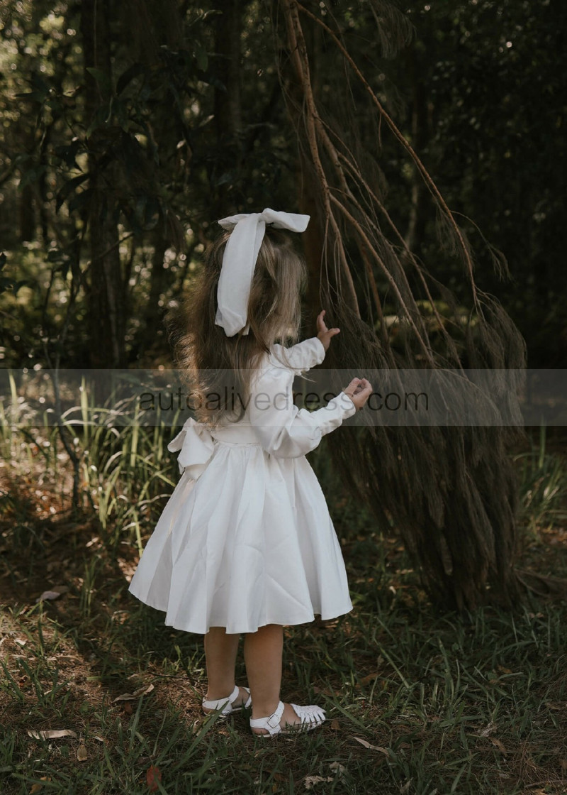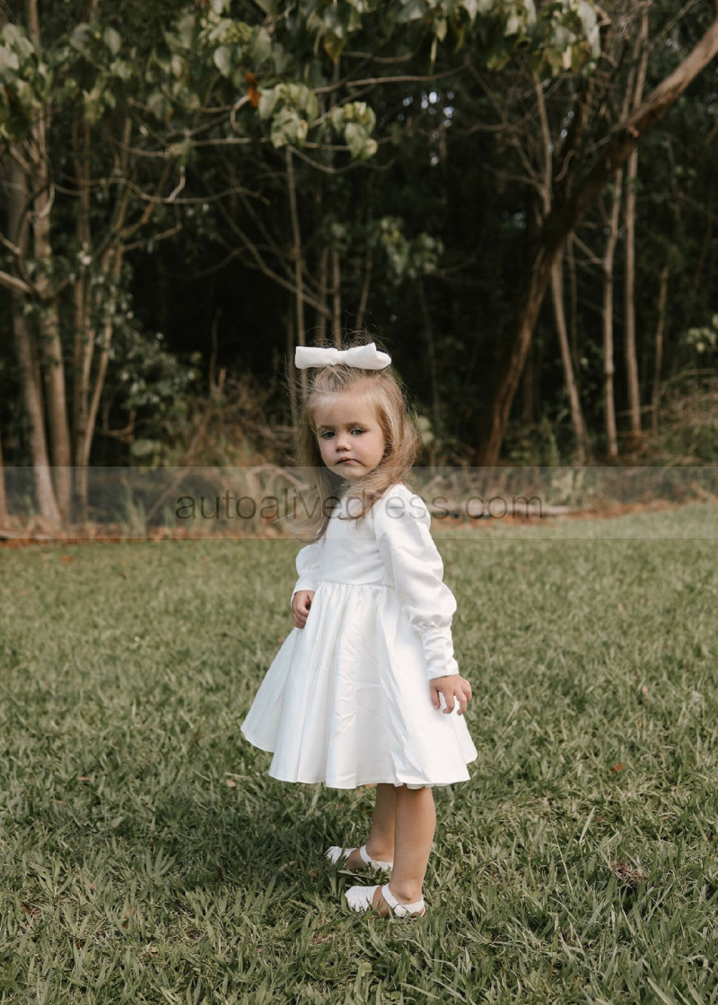 Long Sleeves Ivory Satin V Back Flower Girl Dress