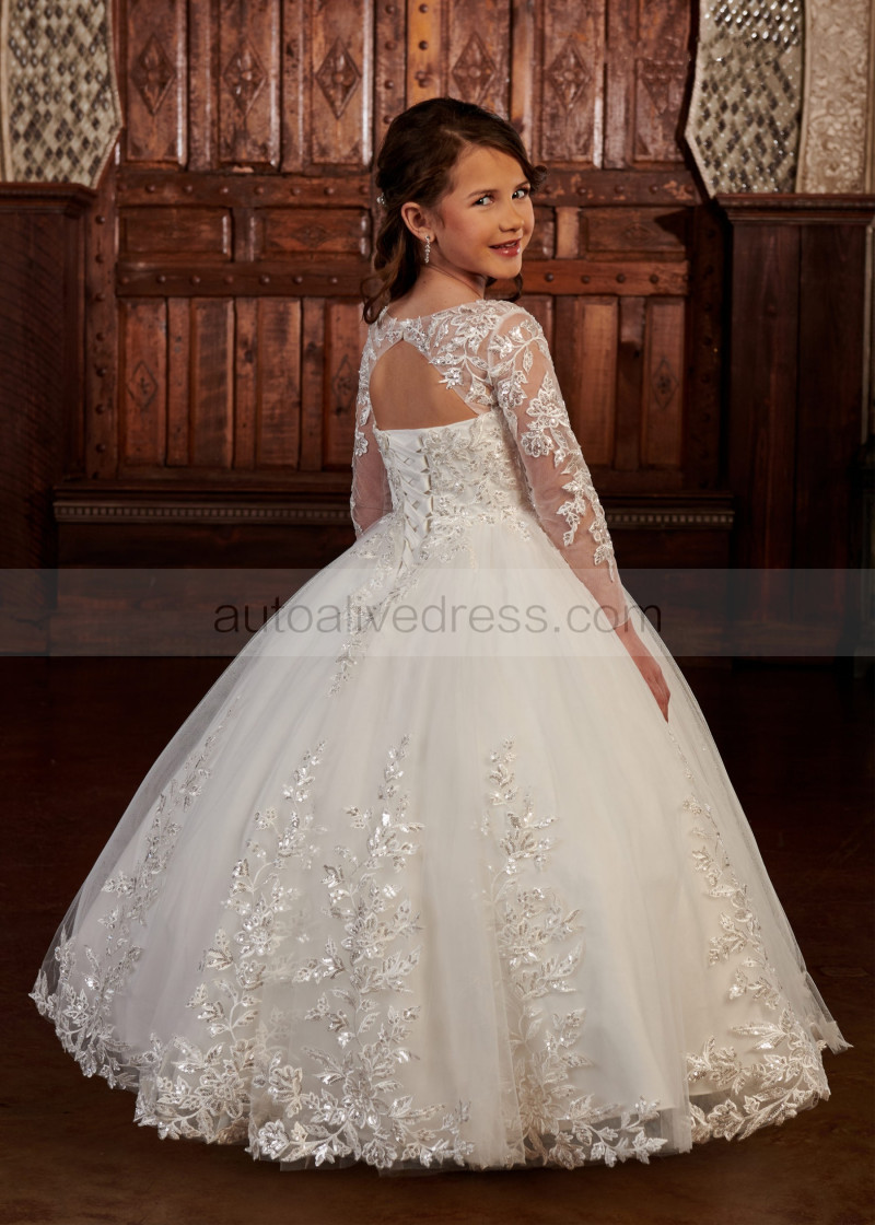 Long Sleeves Ivory Sequined Lace Applique Tulle Flower Girl Dress