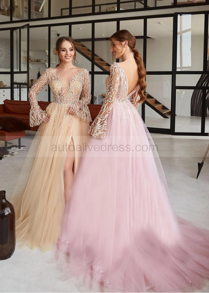 Long Sleeves Sequined Lace Tulle Sexy Slit Evening Dress