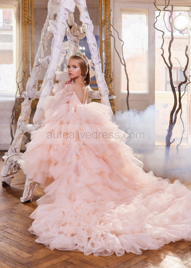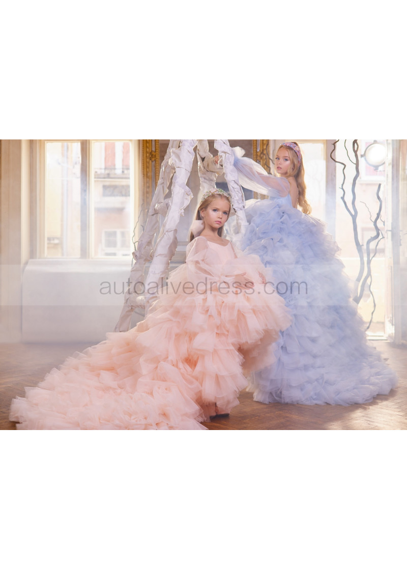 Long Sleeves Tulle Ruffled Crystal Buttons Back Flower Girl Dress