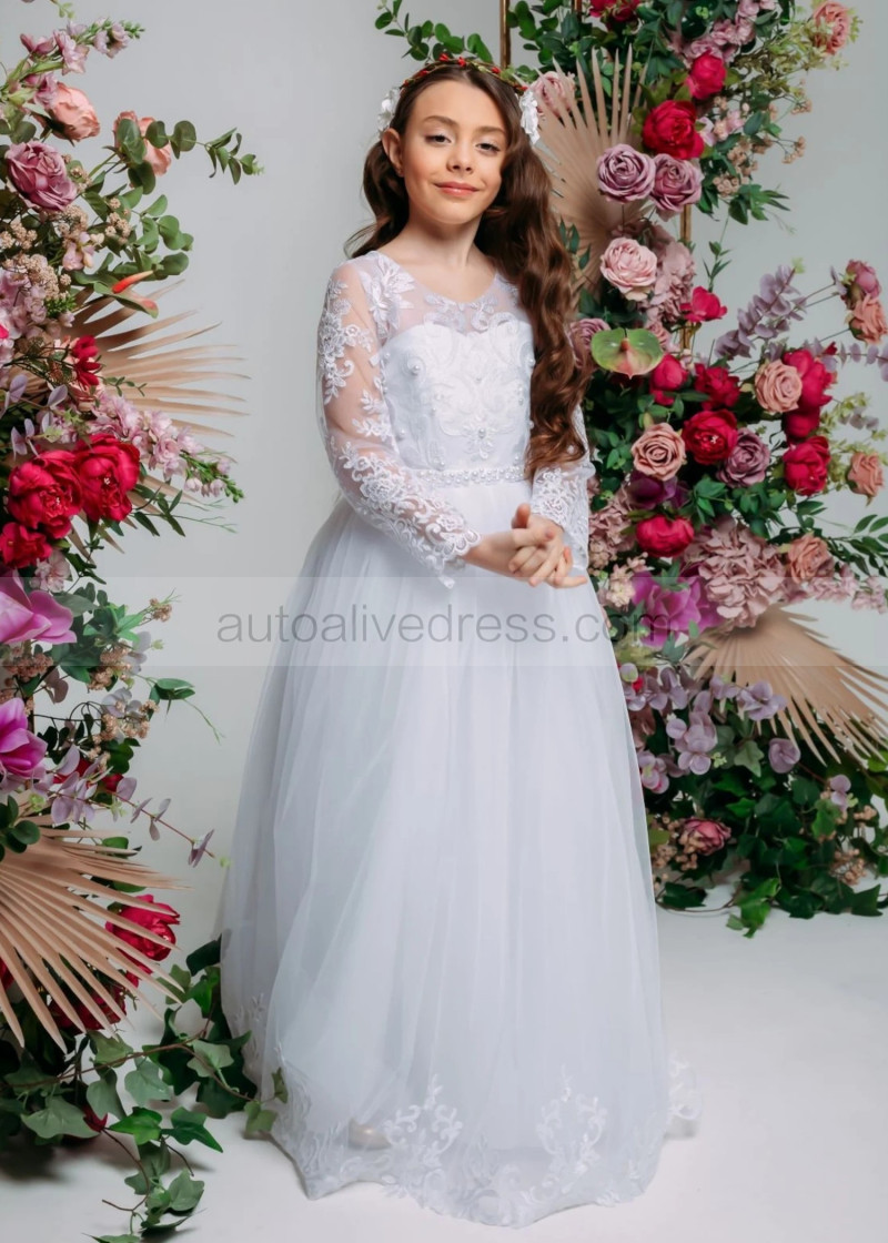 Long Sleeves White Lace Tulle V Back Flower Girl Dress