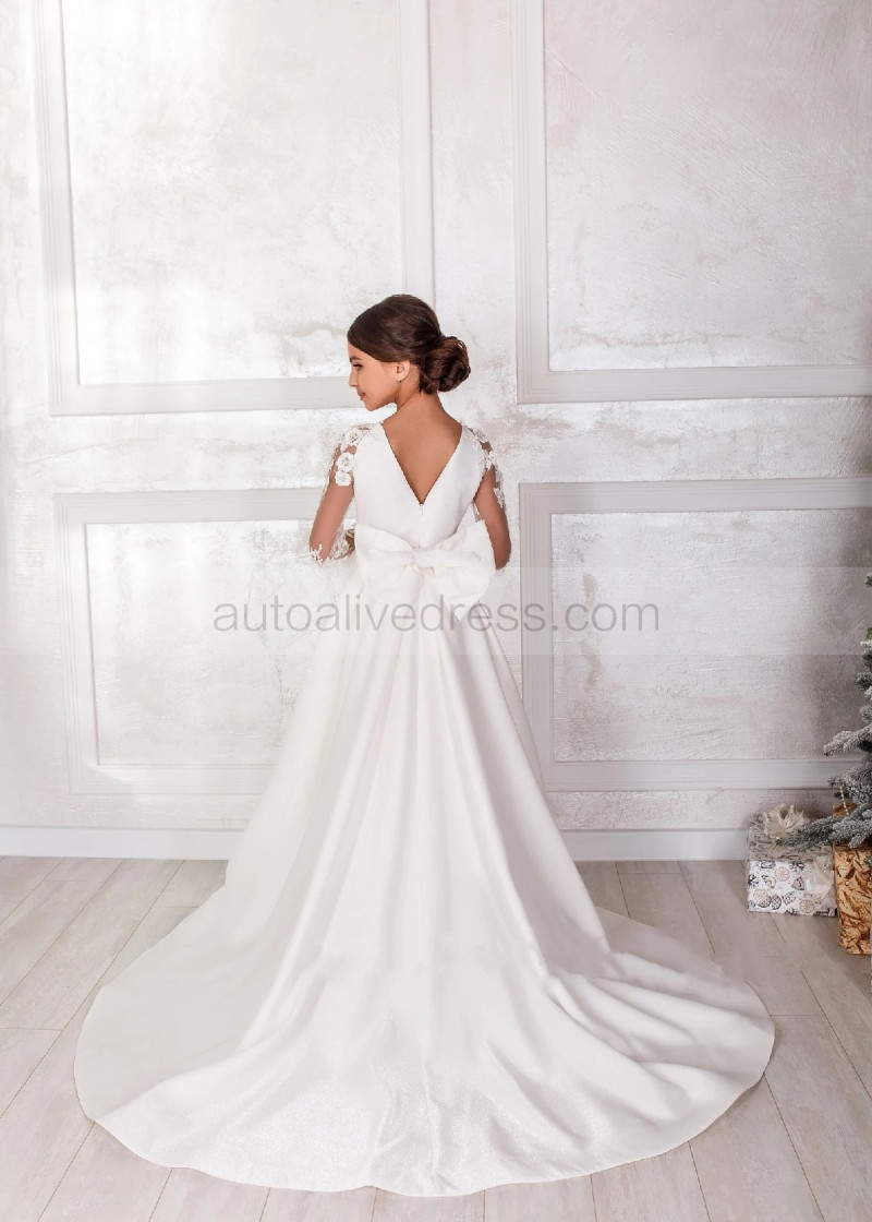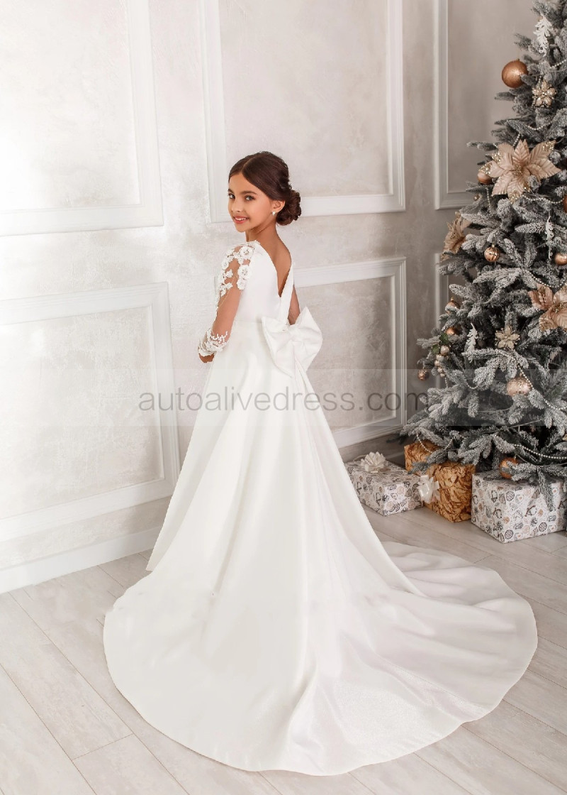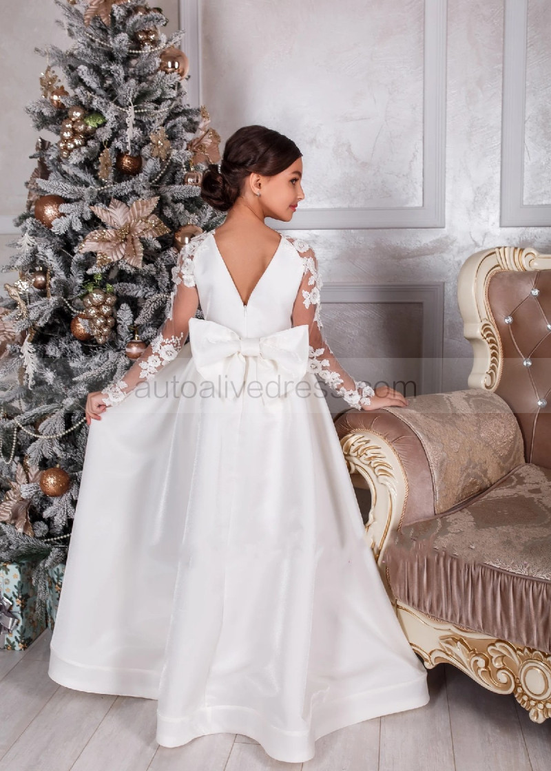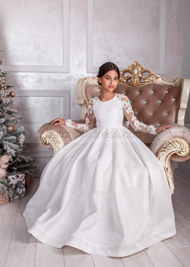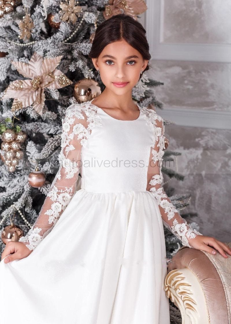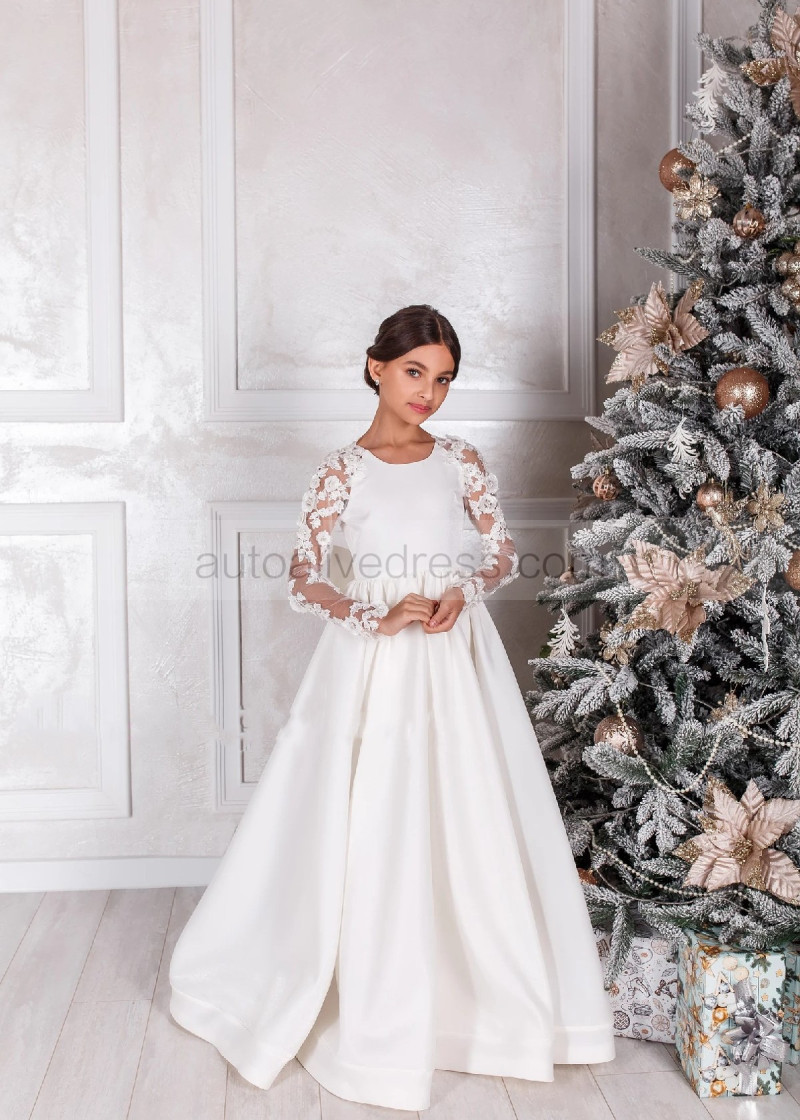 Long Sleeves Ivory Lace Satin Beaded Flower Girl Dress