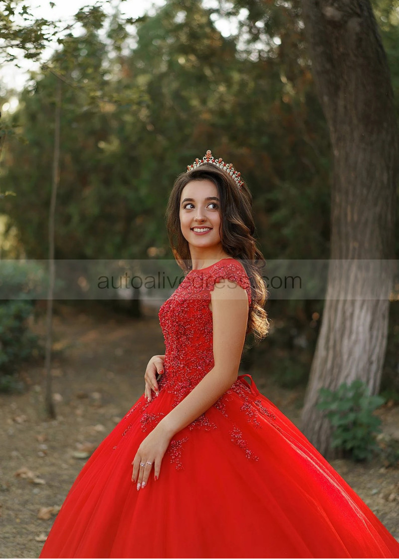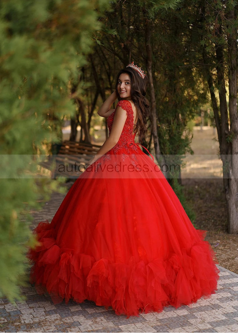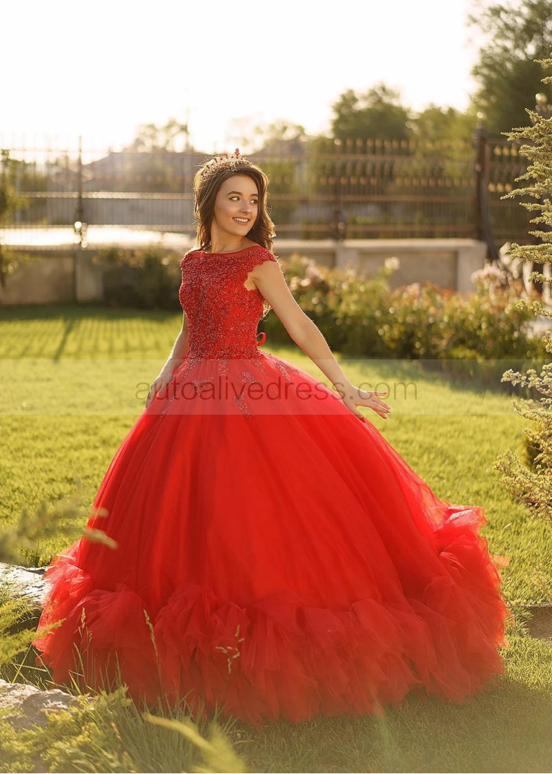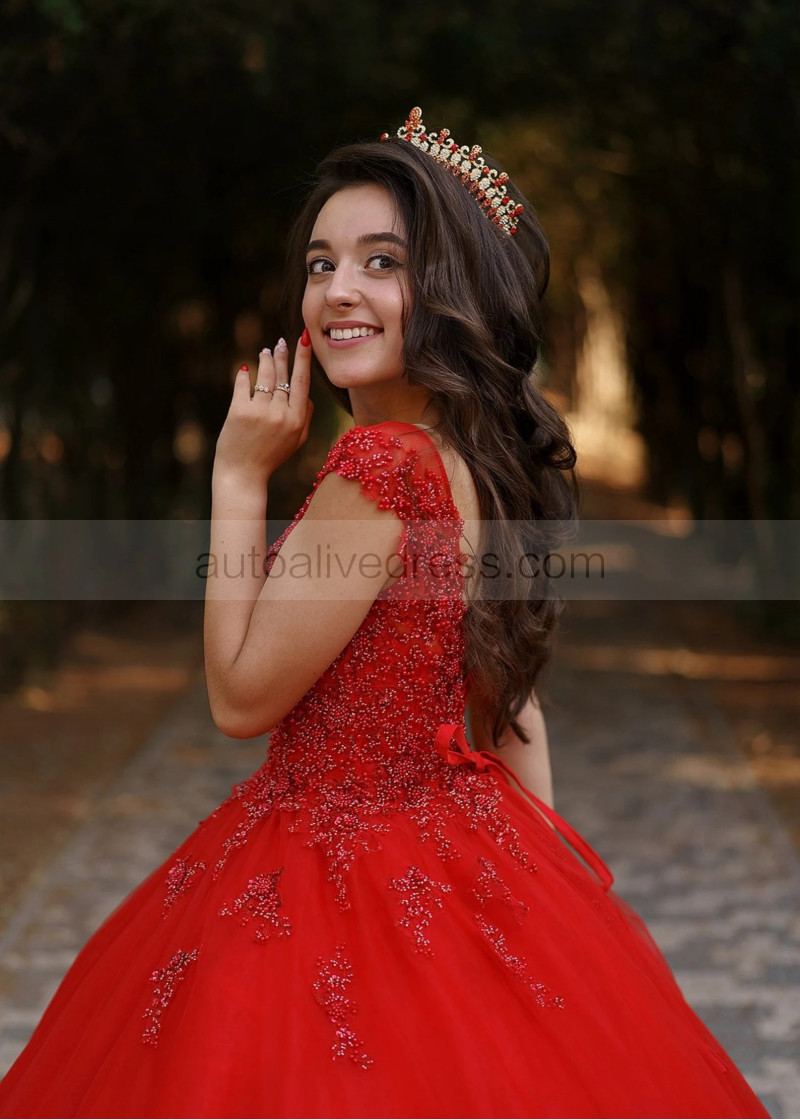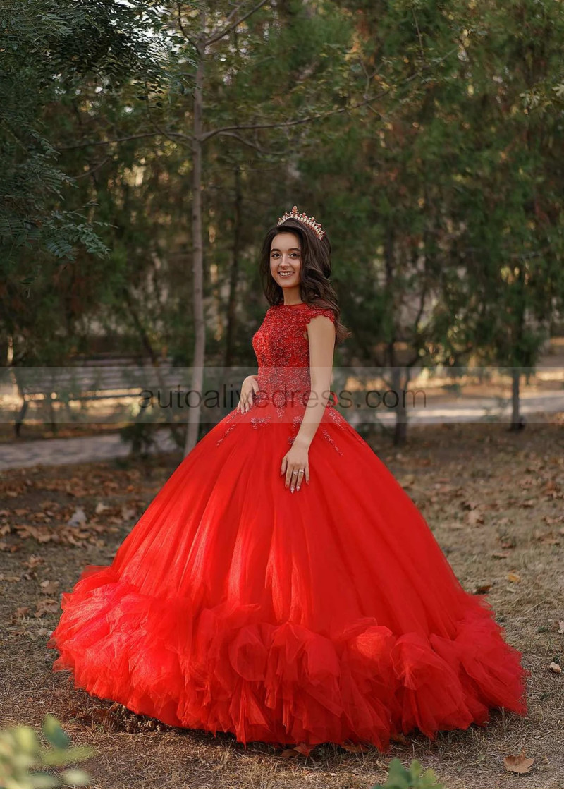 Luxury Beaded Red Lace Tulle Corset Back Evening Dress