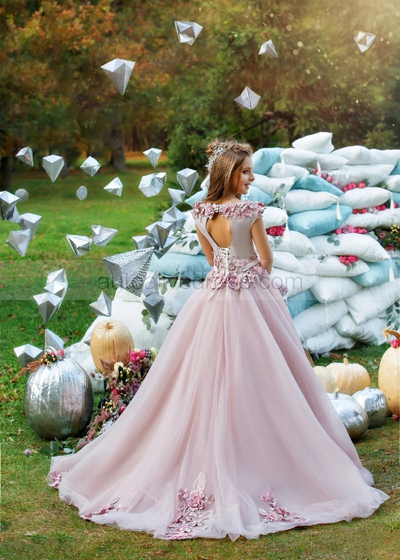 Mauve Pink Lace Tulle Pearl Beaded Flower Girl Dress Party Dress