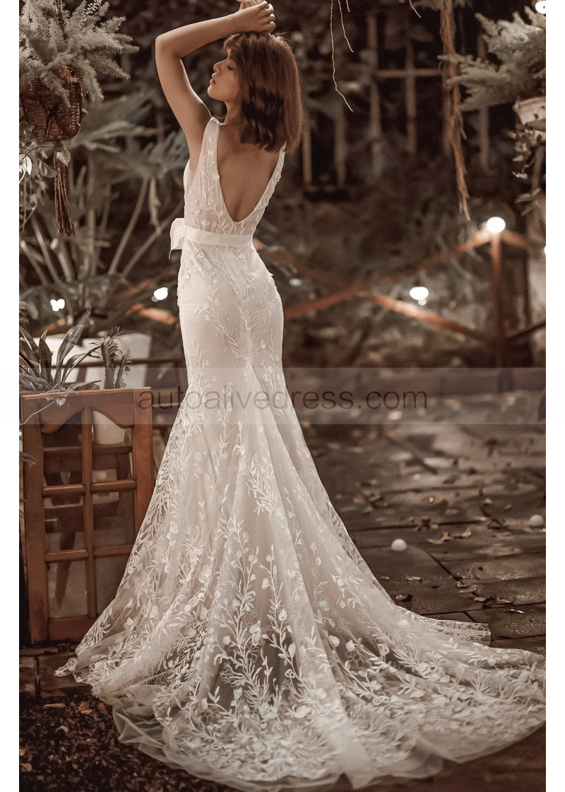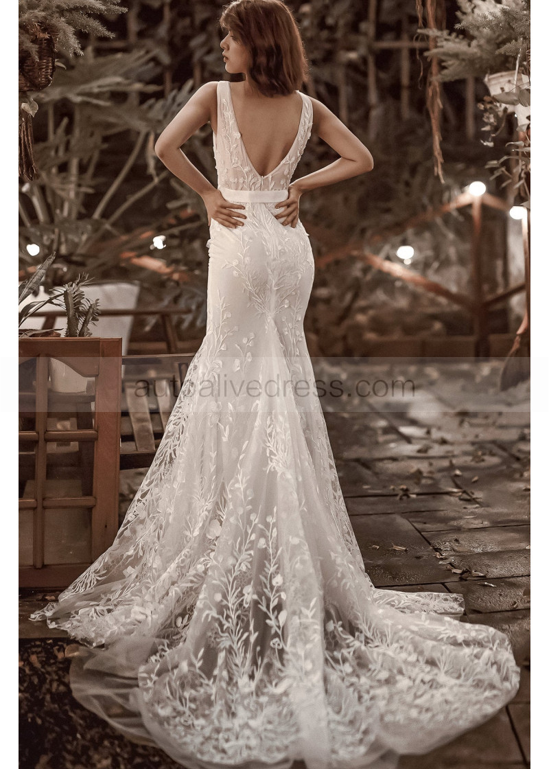 Mermaid Beaded Ivory Lace Tulle Wedding Dress With Nude Lining