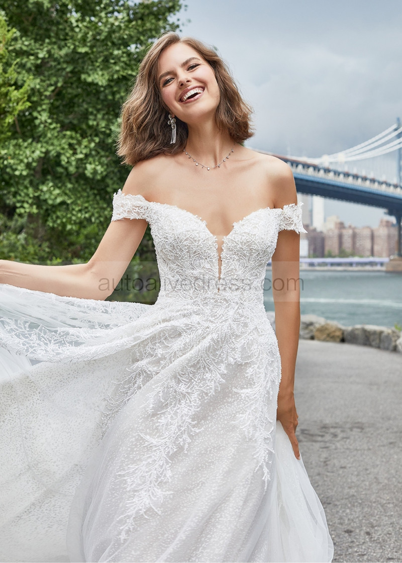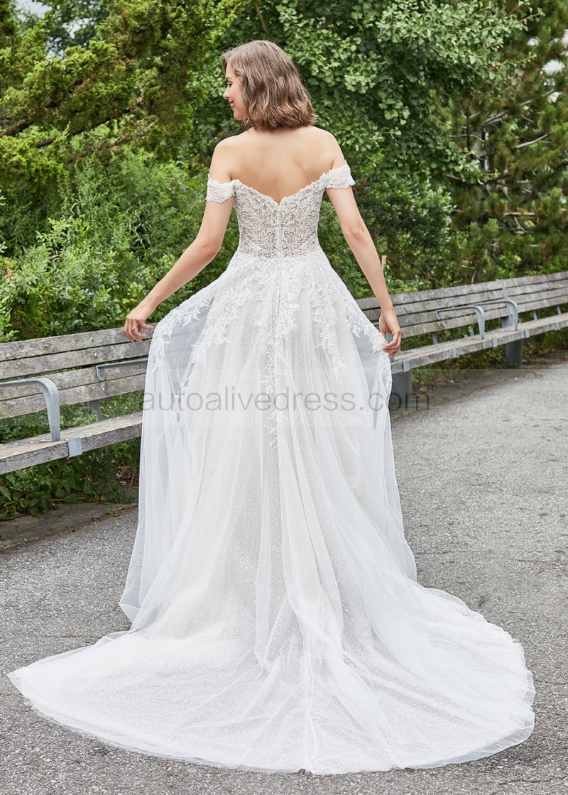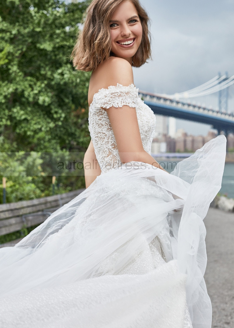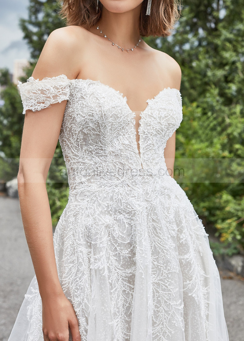 Off Shoulder Beaded Ivory Lace Tulle Sparkling Wedding Dress