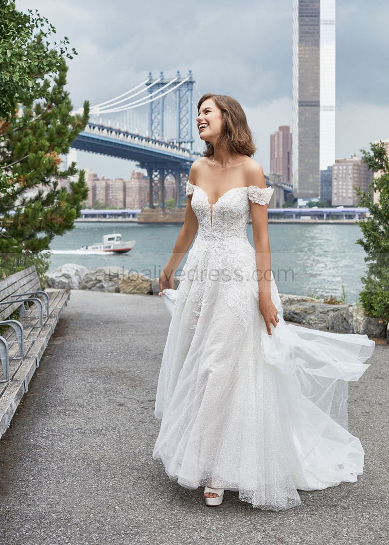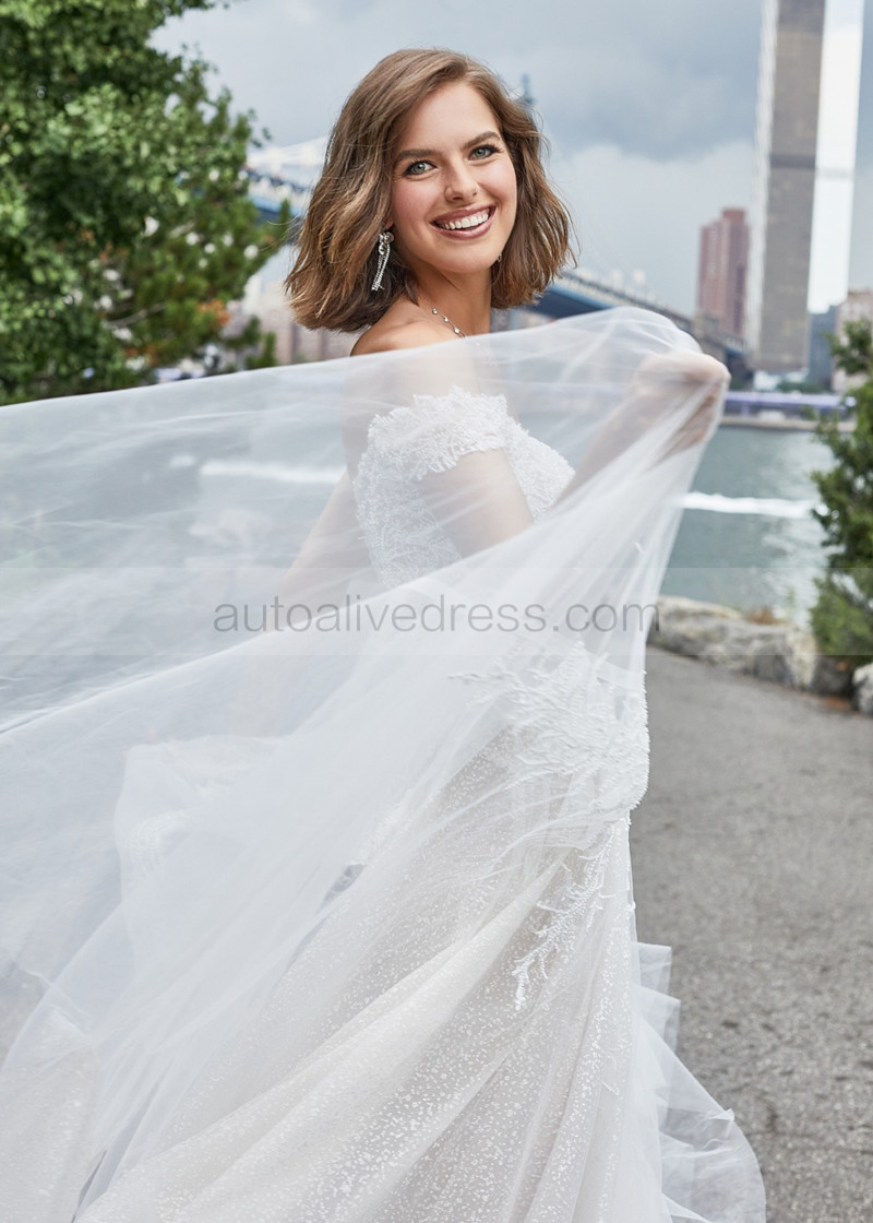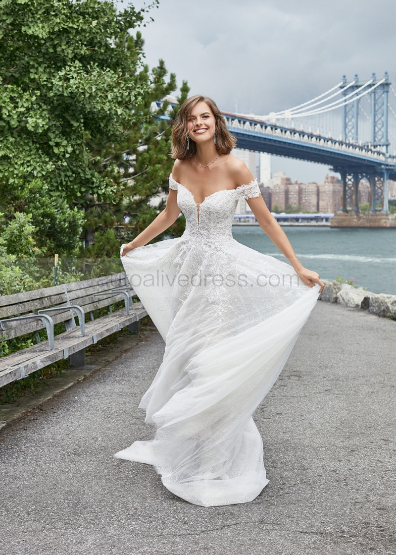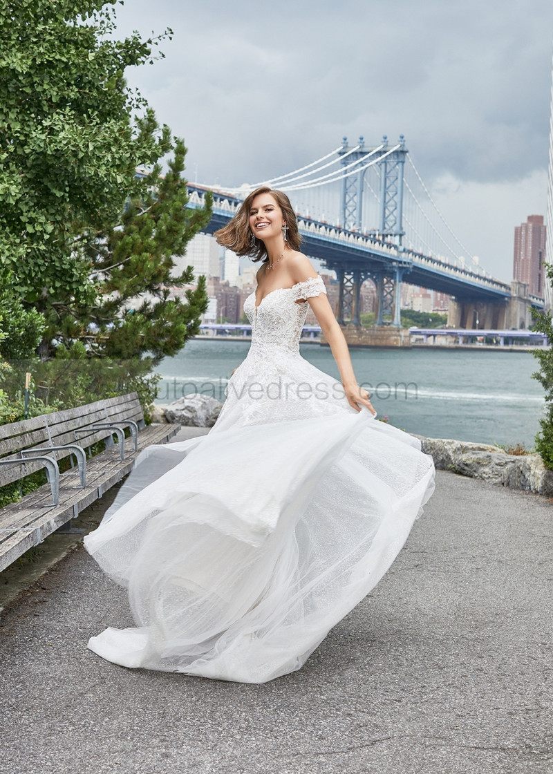 Off Shoulder Beaded Ivory Lace Tulle Sparkling Wedding Dress