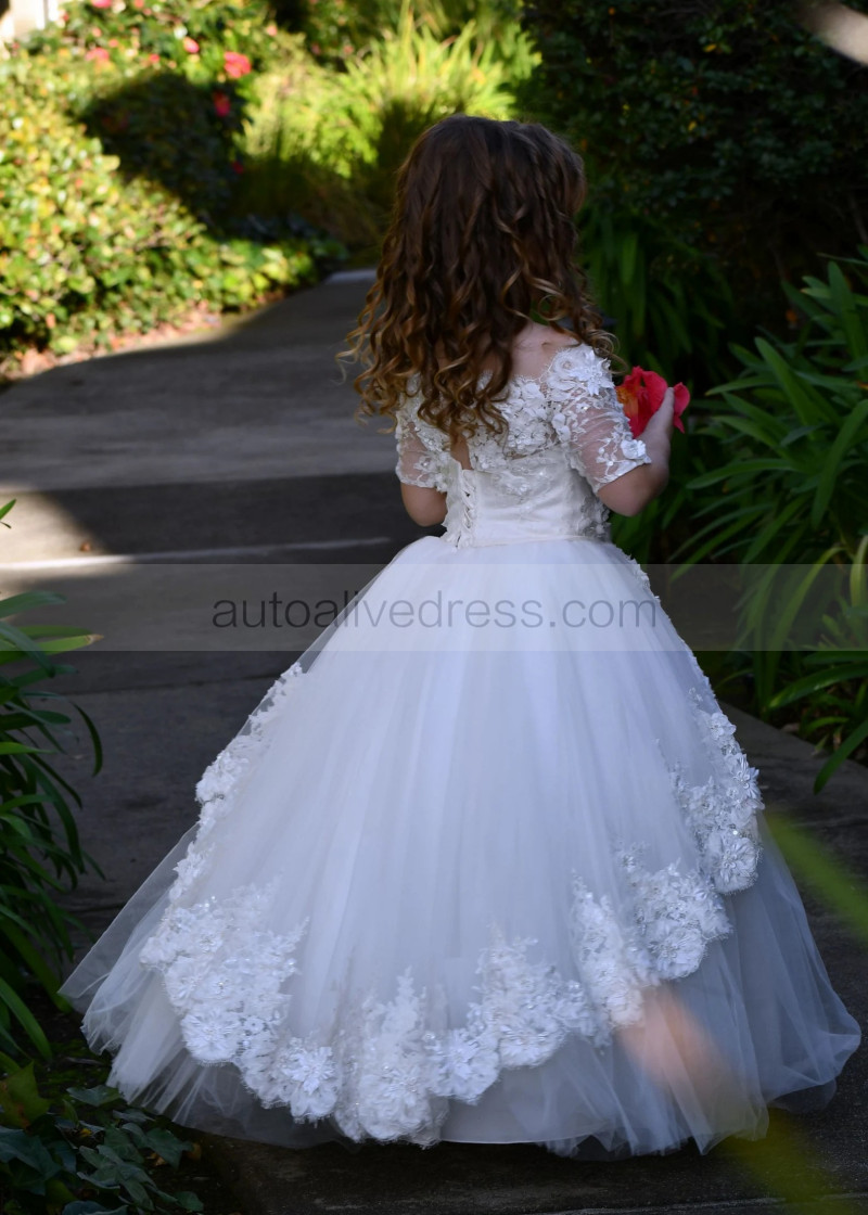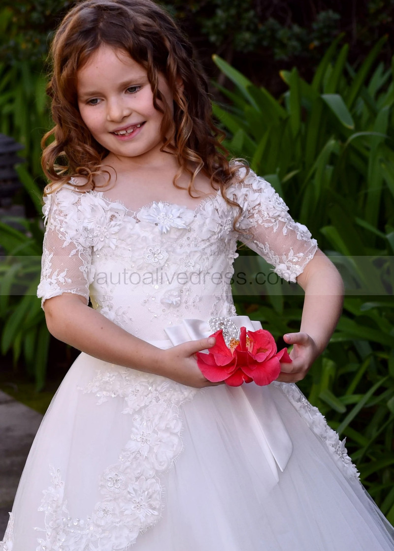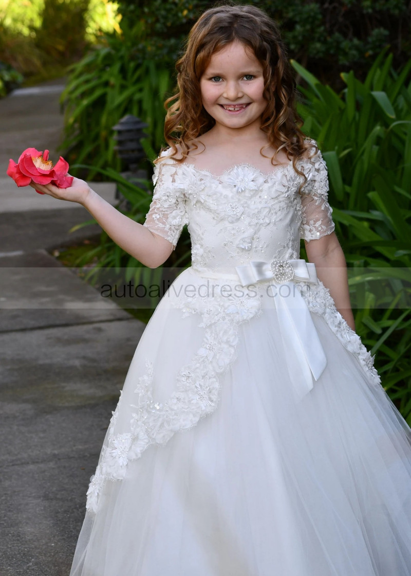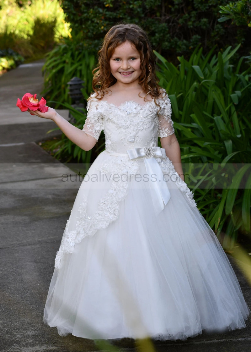 Off Shoulder Beaded Ivory Lace Tulle Stunning Flower Girl Dress