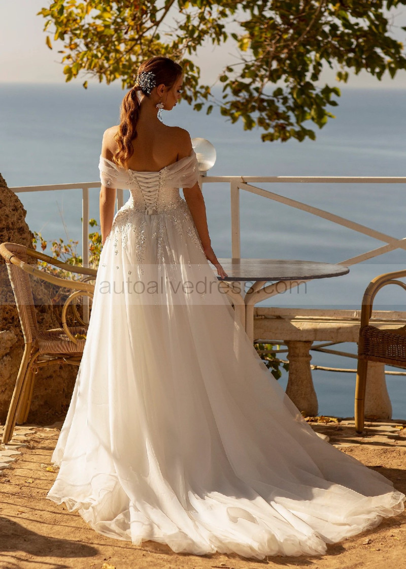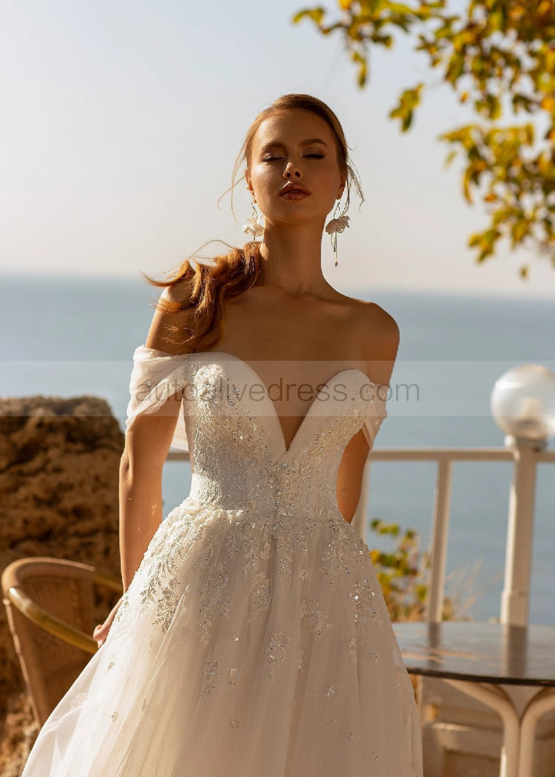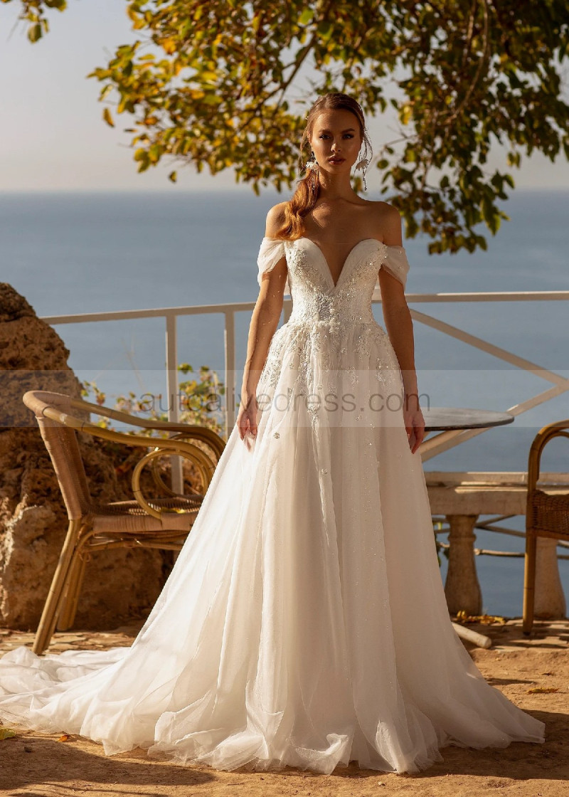 Off Shoulder Beaded Ivory Lace Tulle Timeless Wedding Dress