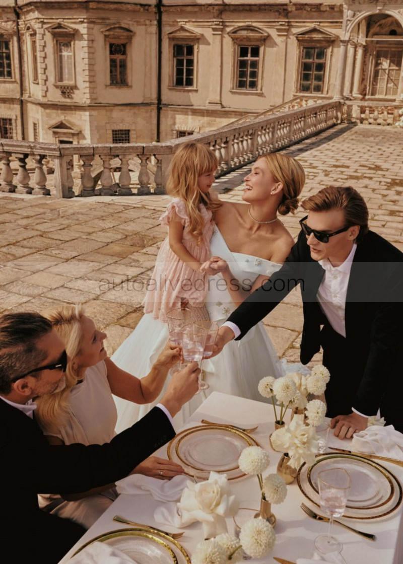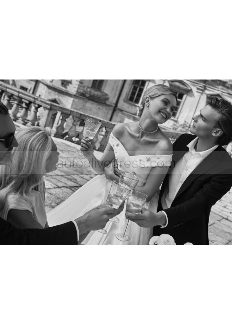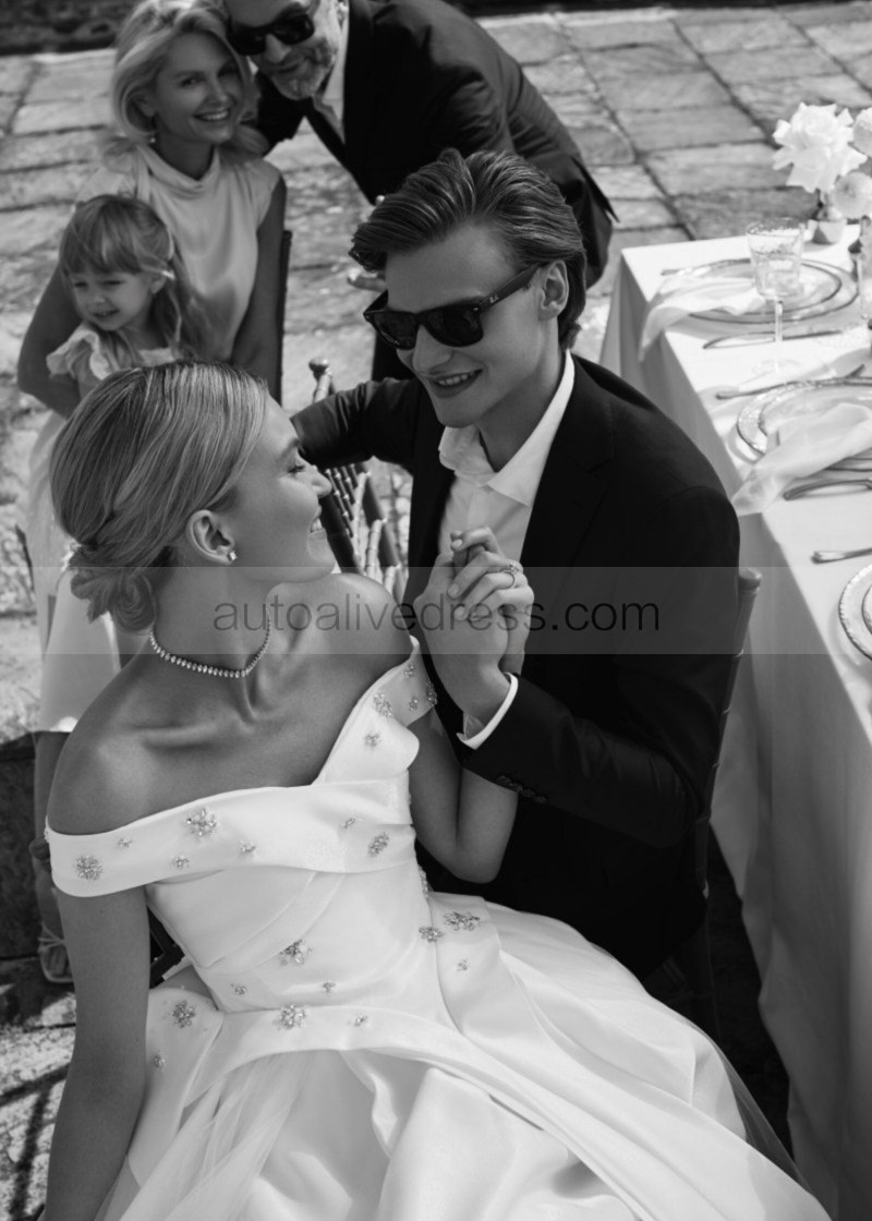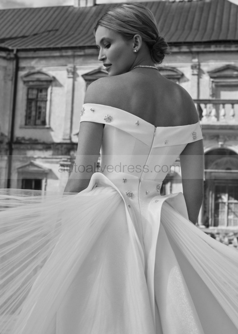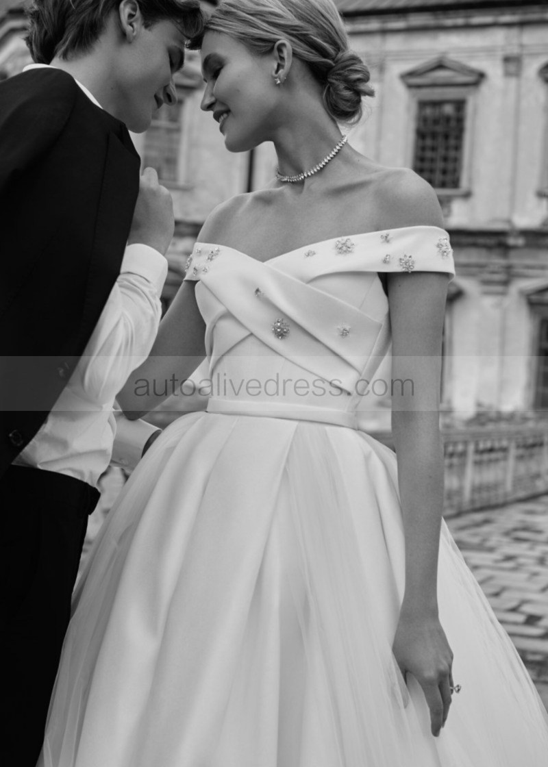 Off Shoulder Beaded Ivory Satin Tulle Vintage Wedding Dress