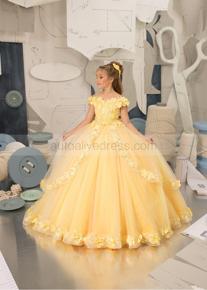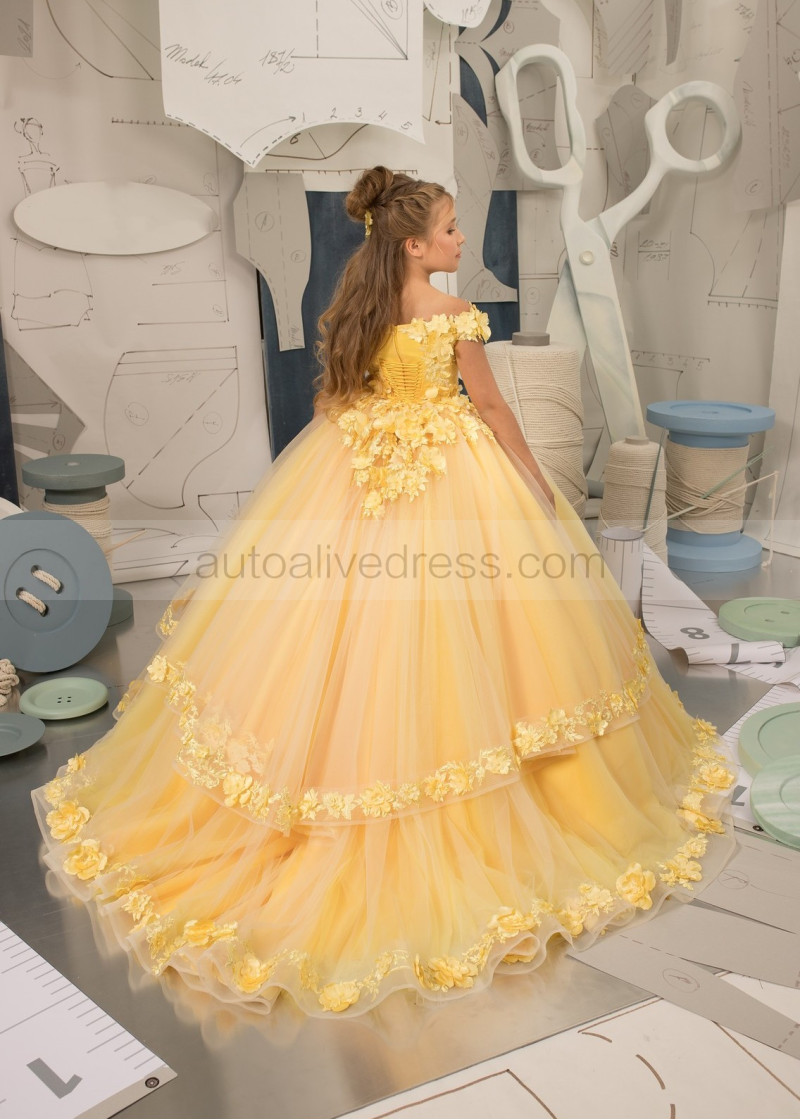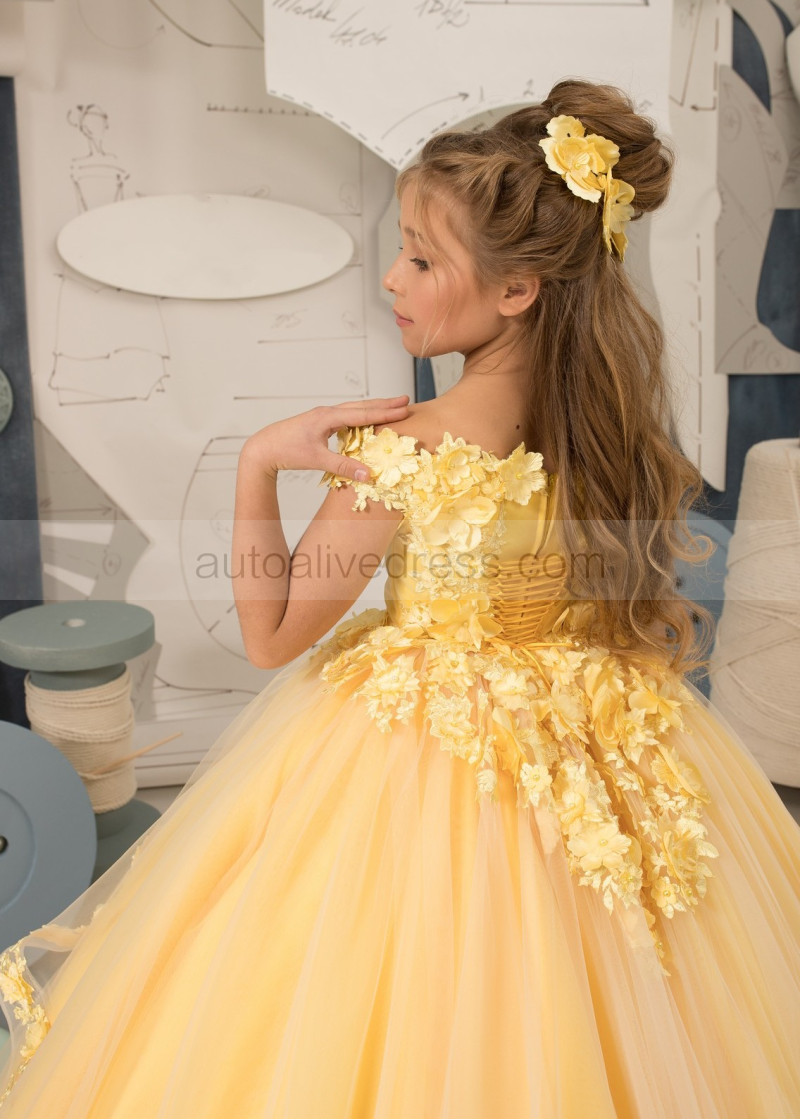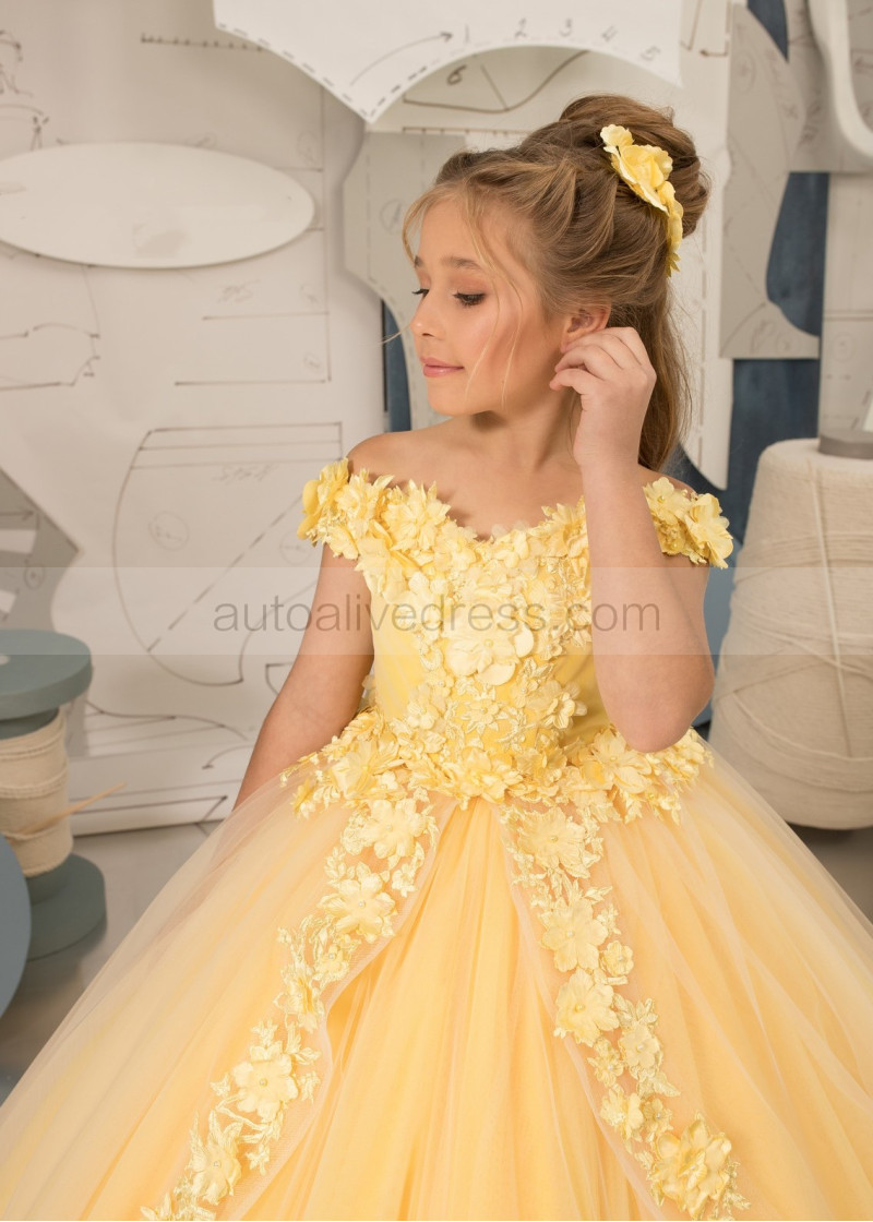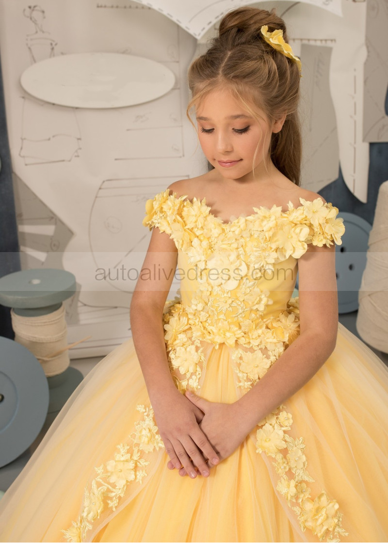 Off Shoulder Beaded Yellow 3D Lace Tulle Flower Girl Dress