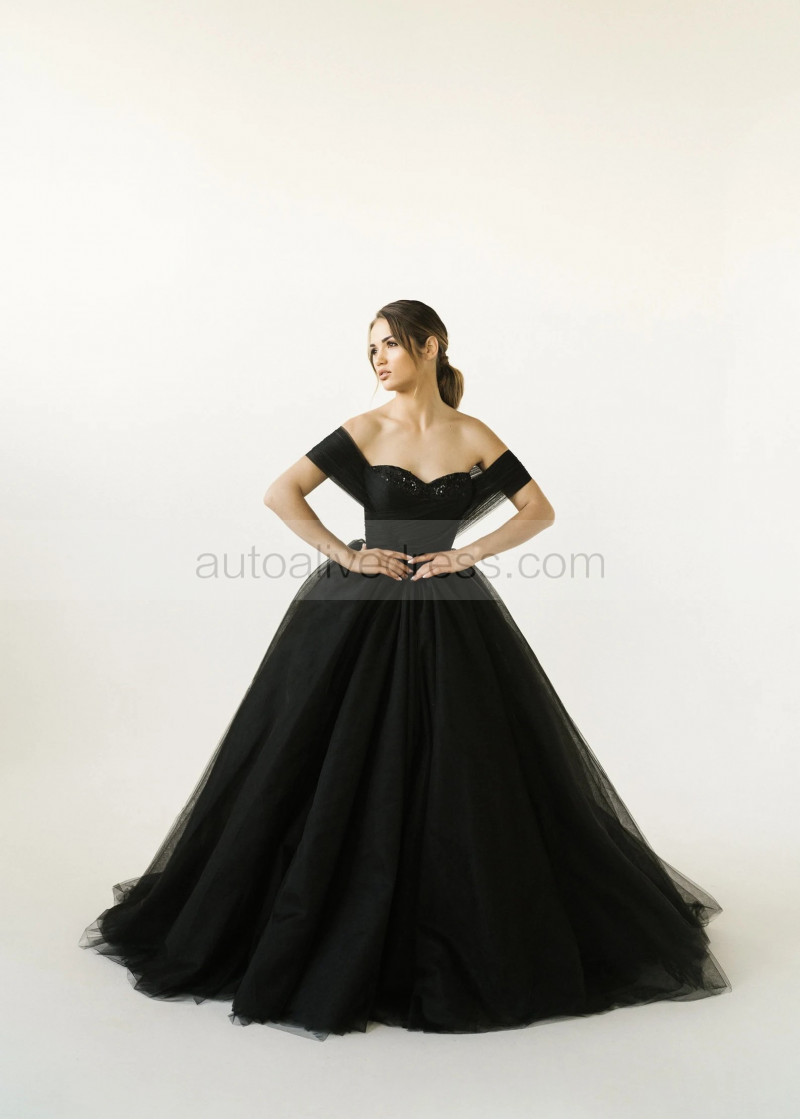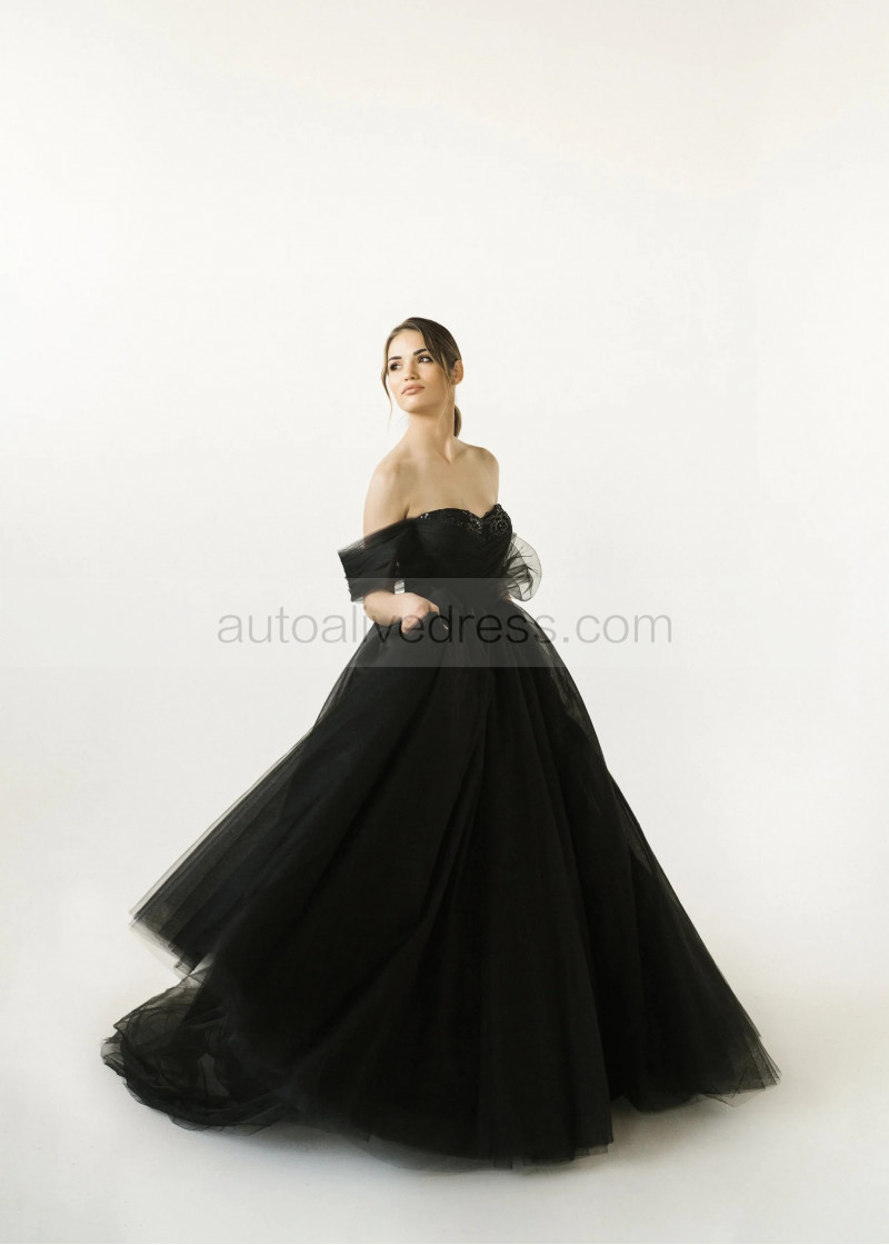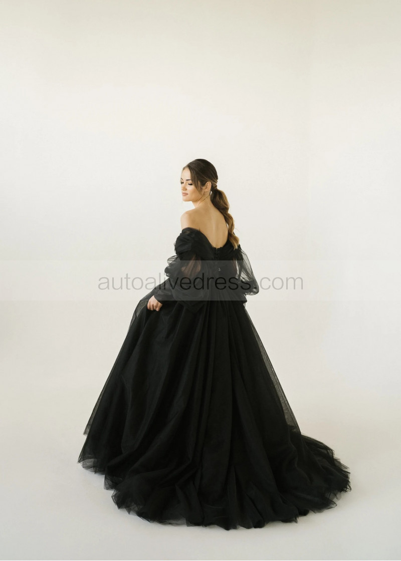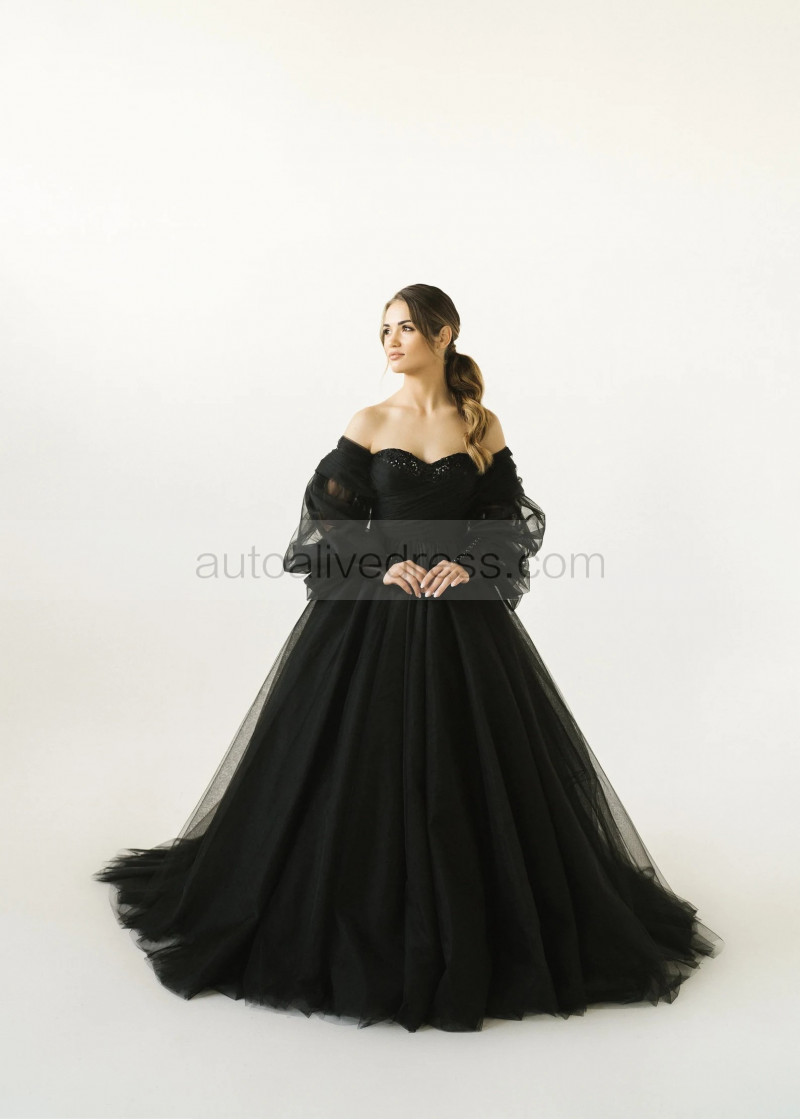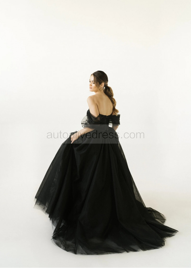 Off Shoulder Black Lace Tulle Evening Dress With Removable Sleeves