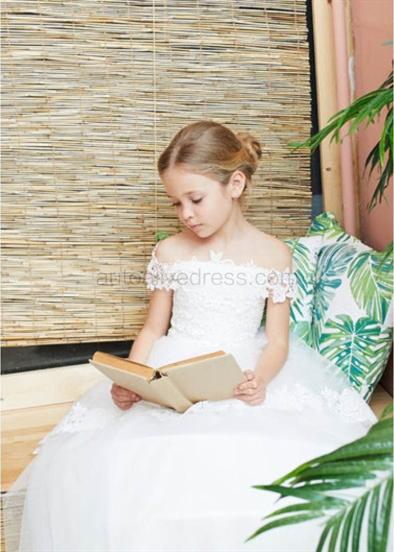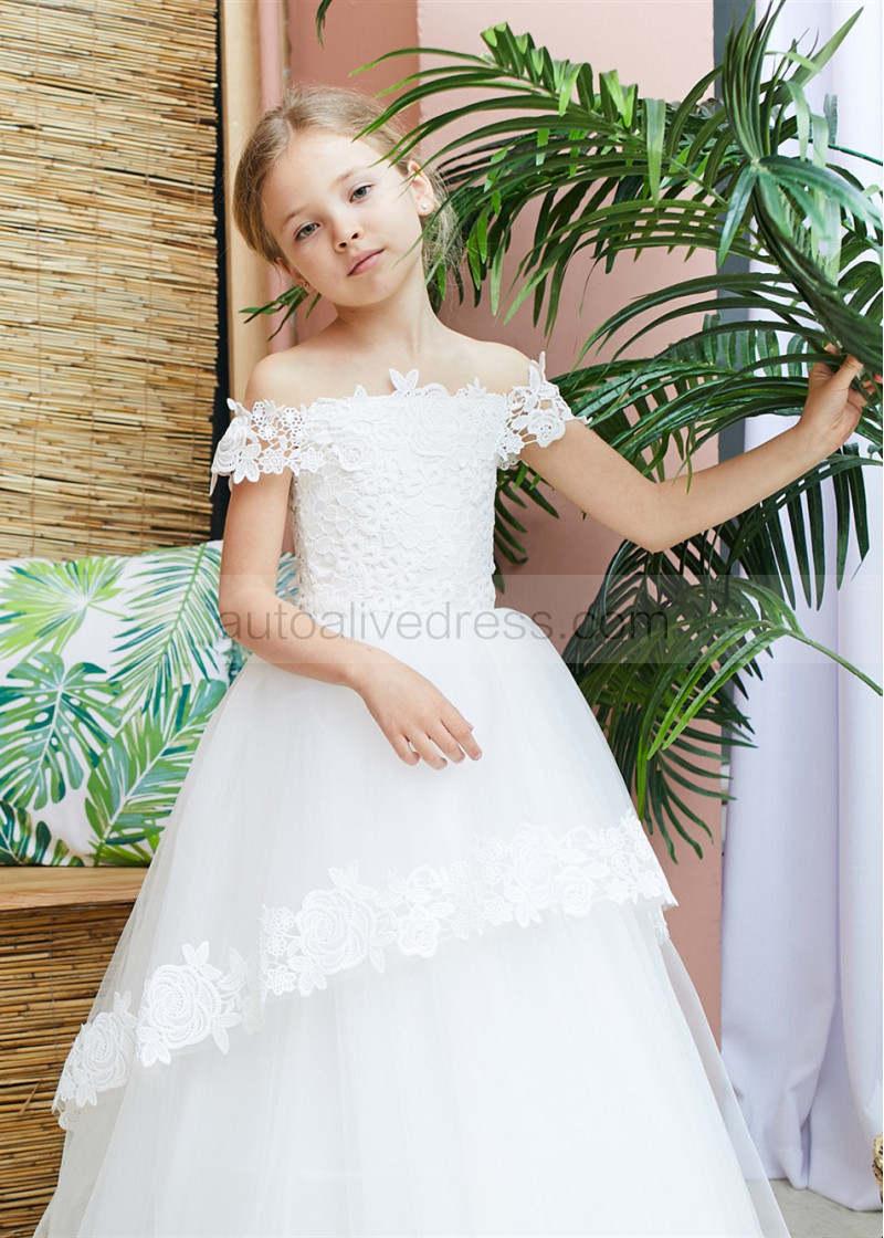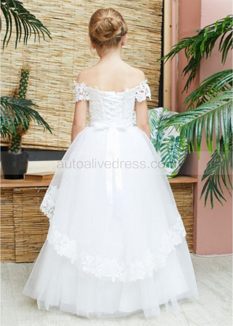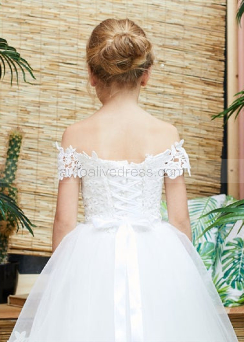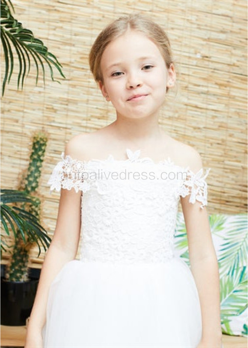 Off Shoulder Ivory Lace Tulle Corset Back Flower Girl Dress
