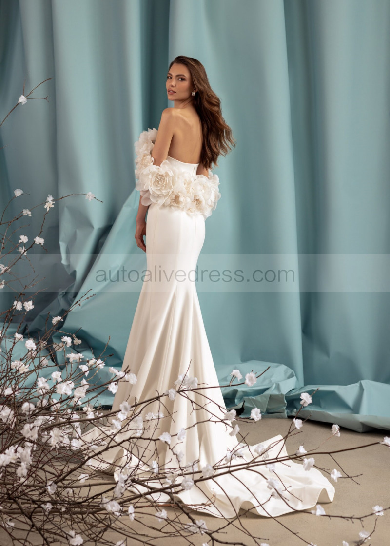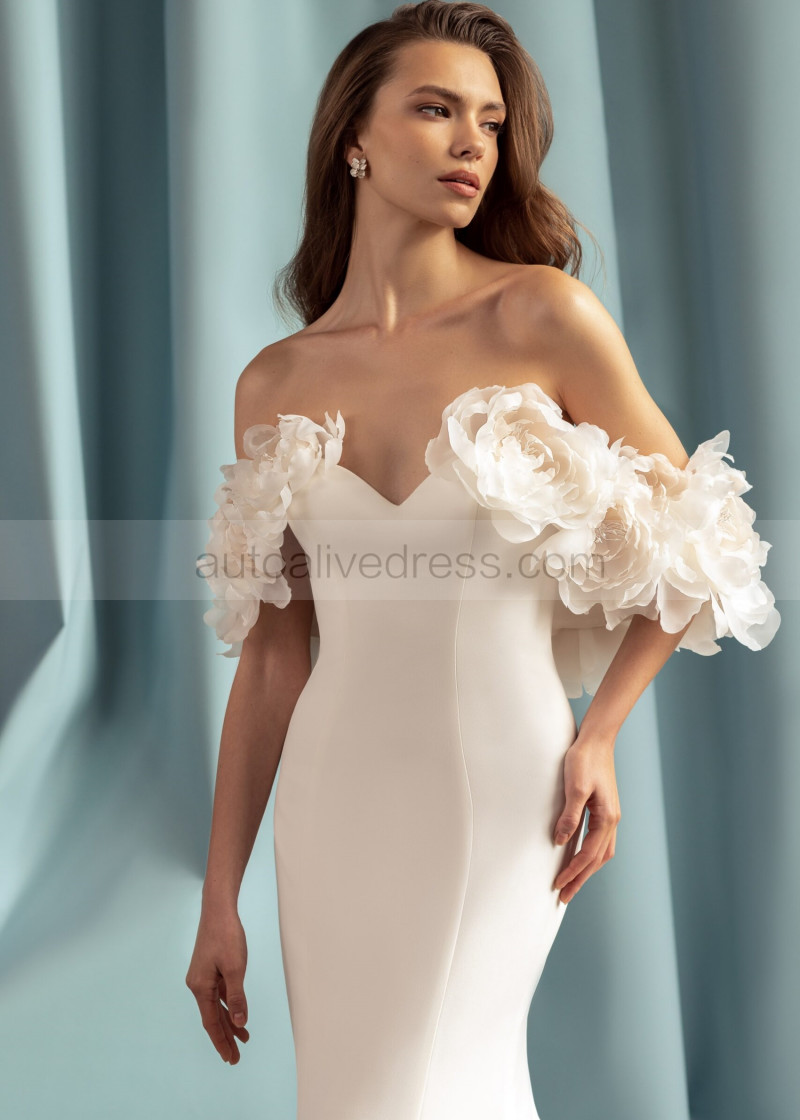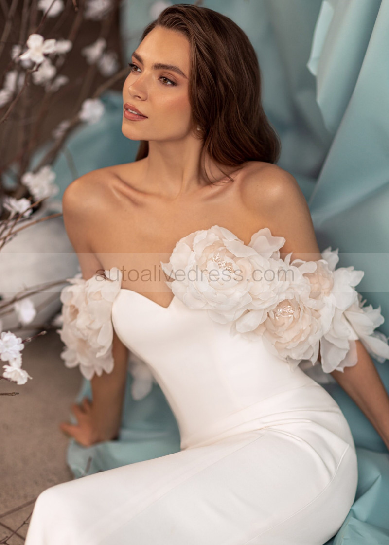 Off Shoulder Ivory Satin Big Flowers Wedding Dress