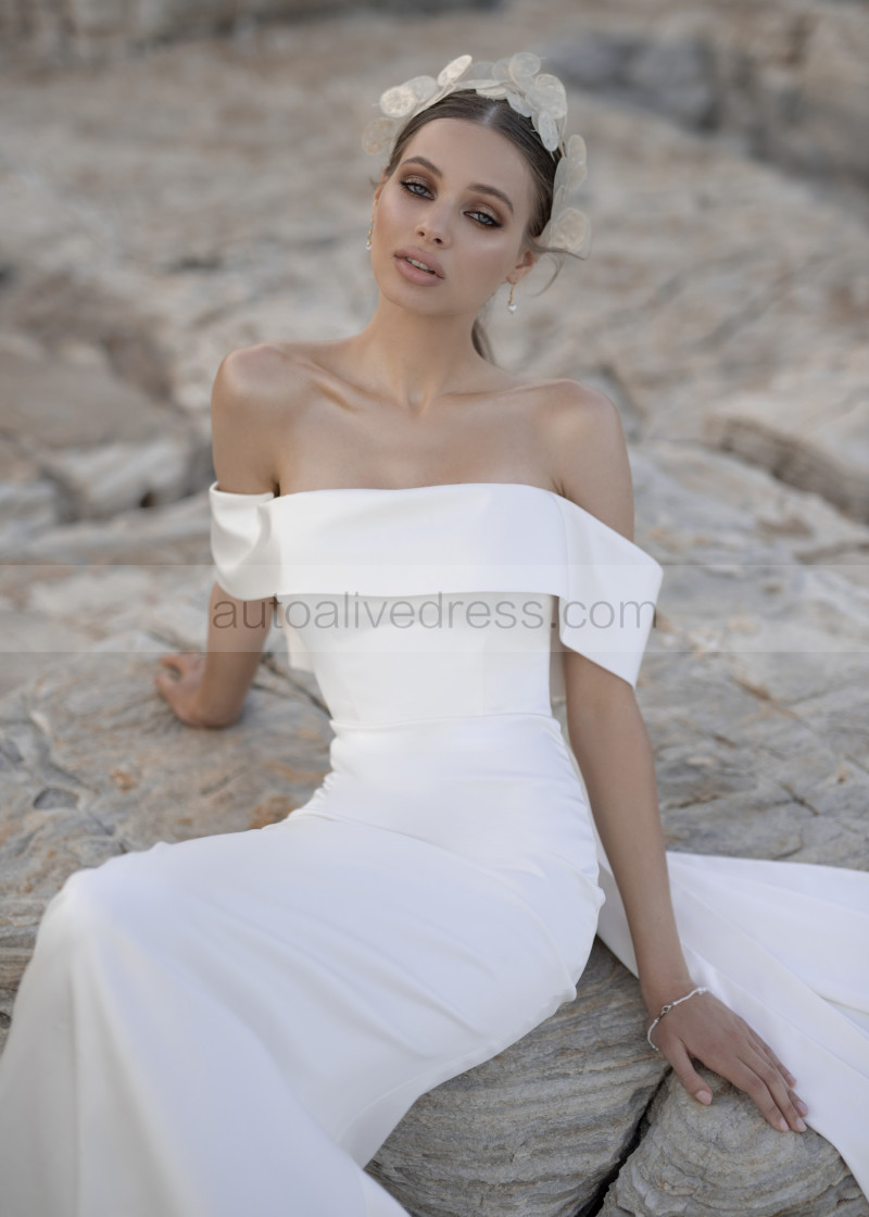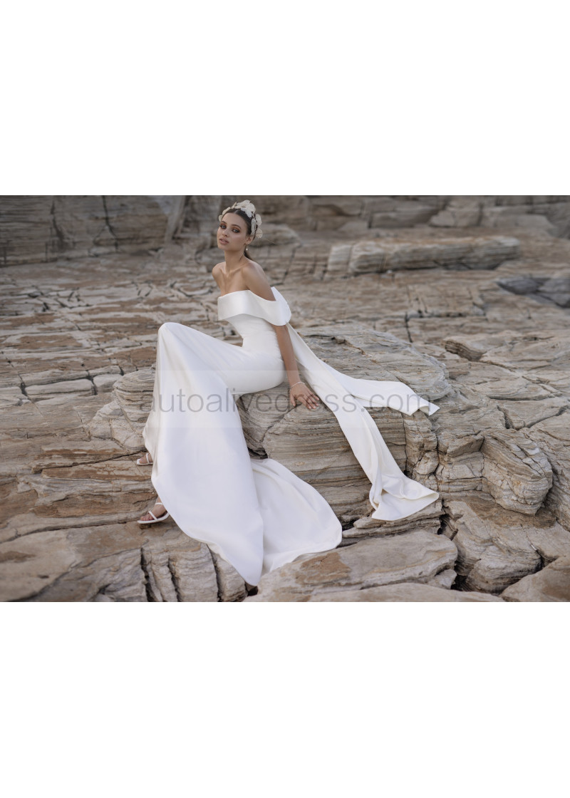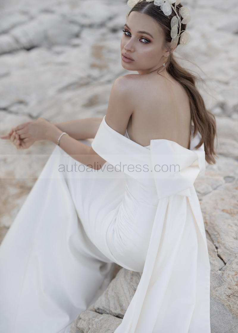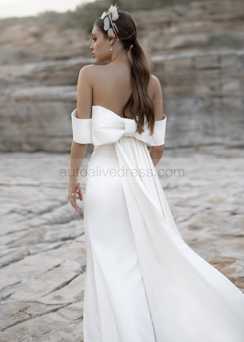 Off Shoulder Ivory Satin Minimalist Wedding Dress With Bow