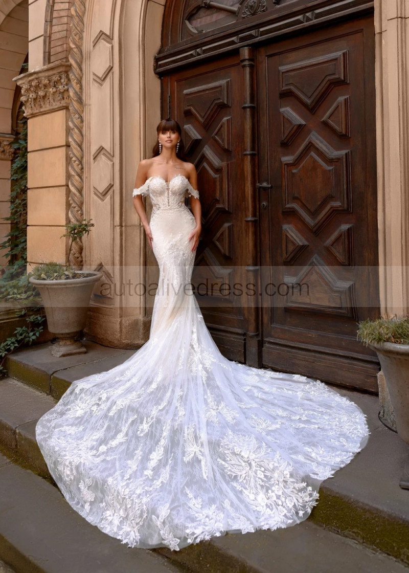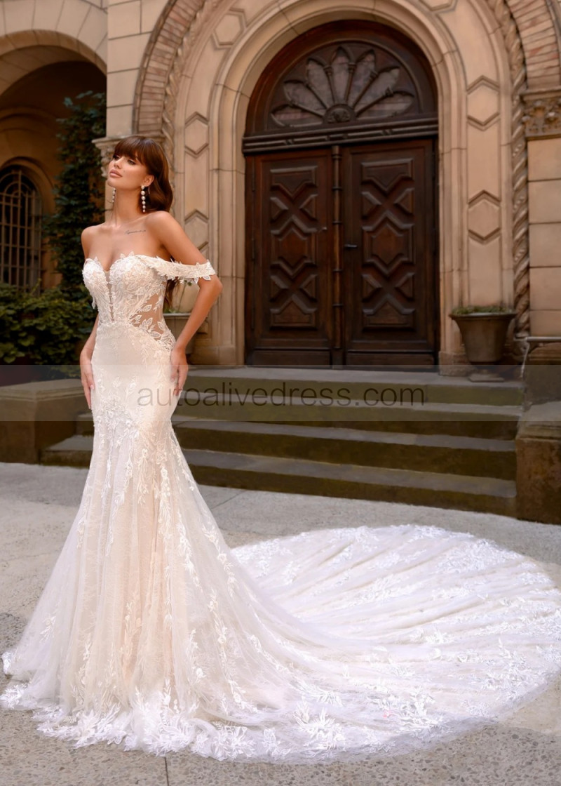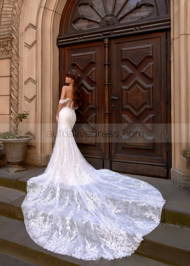 Off Shoulder Lace Tulle Sheer Back Sexy Wedding Dress