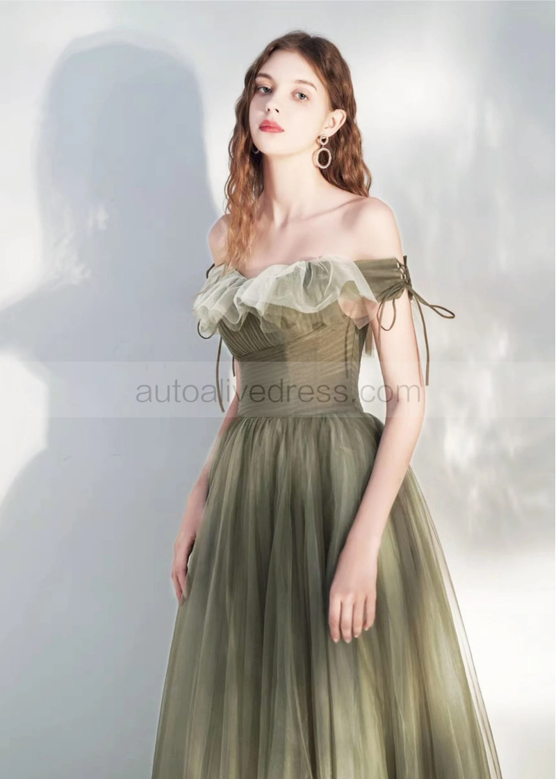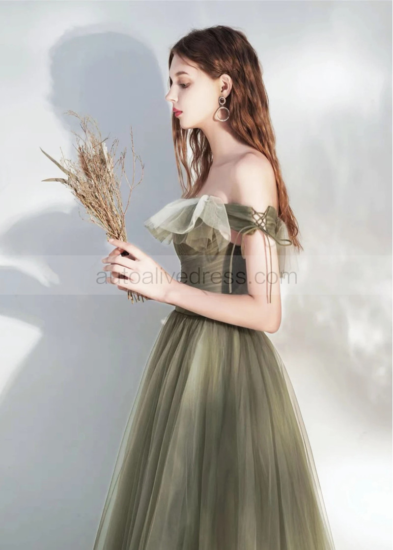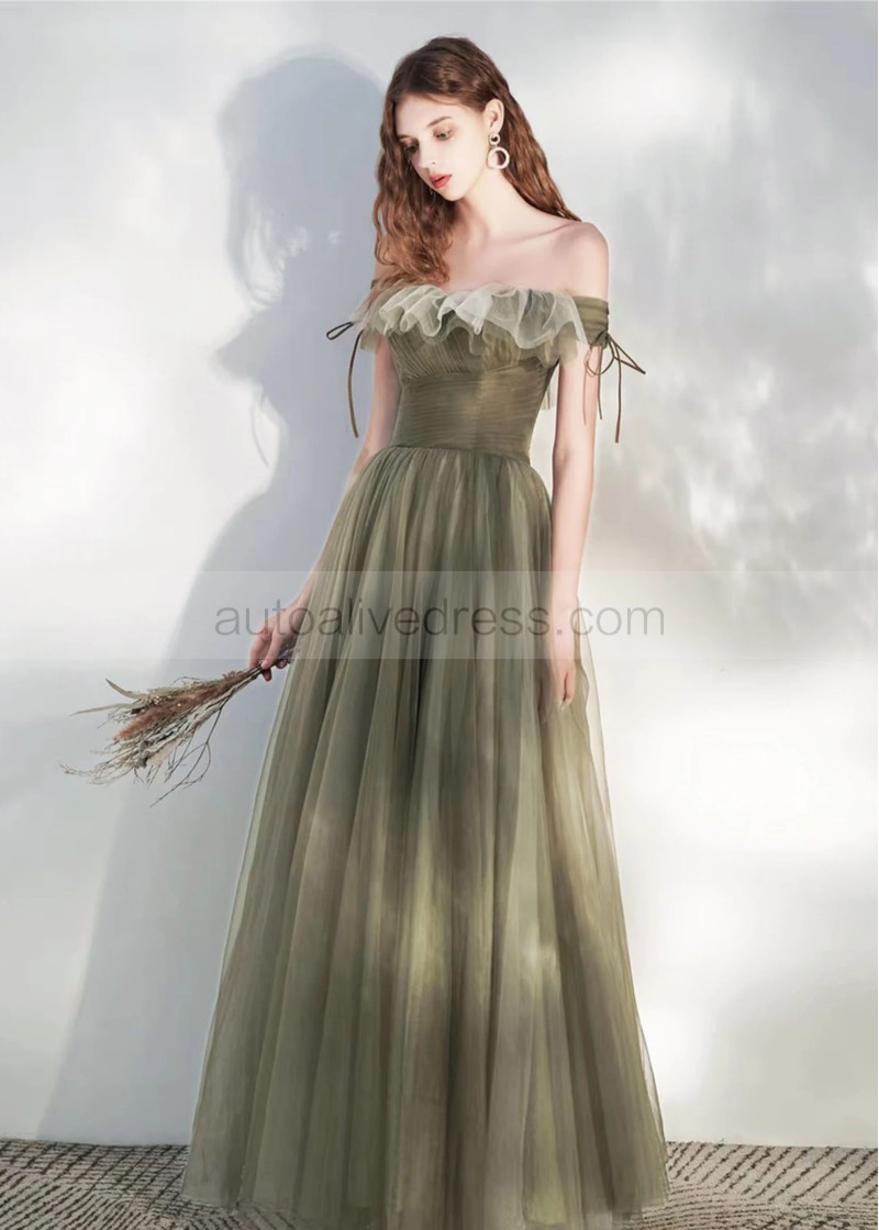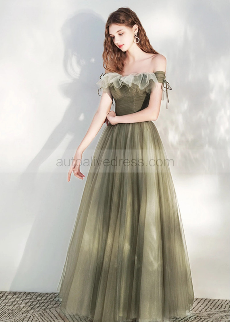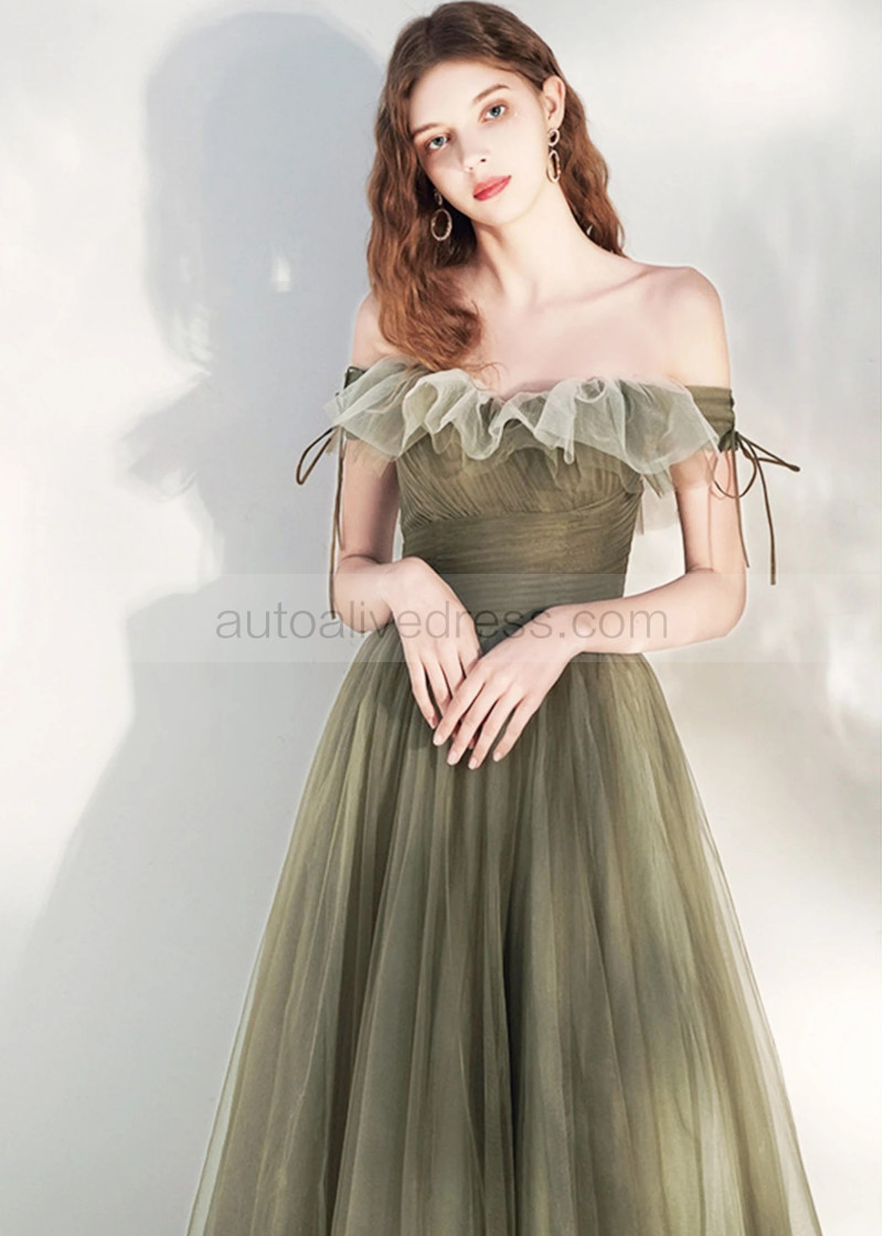 Off Shoulder Olive Tulle Ruched Amazing Prom Dress