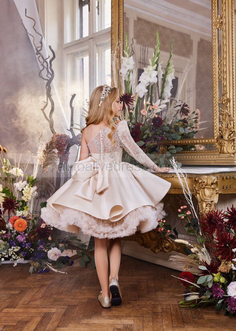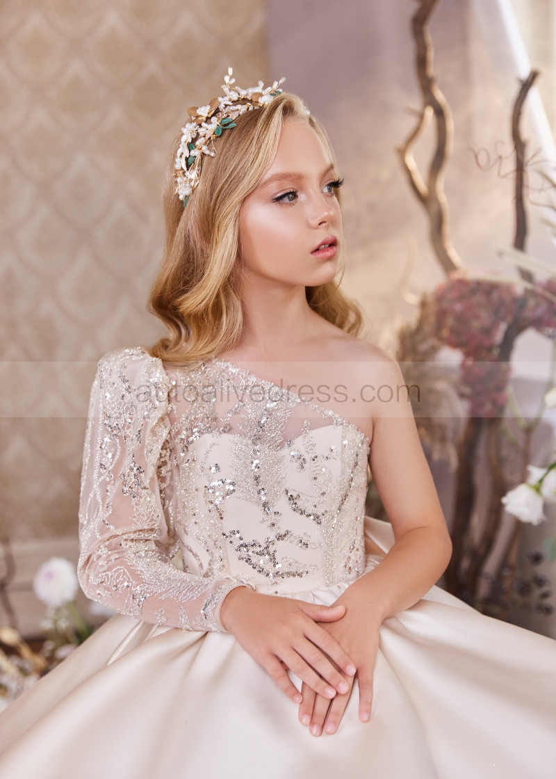 One Shoulder Beaded Champagne Lace Satin Flower Girl Dress