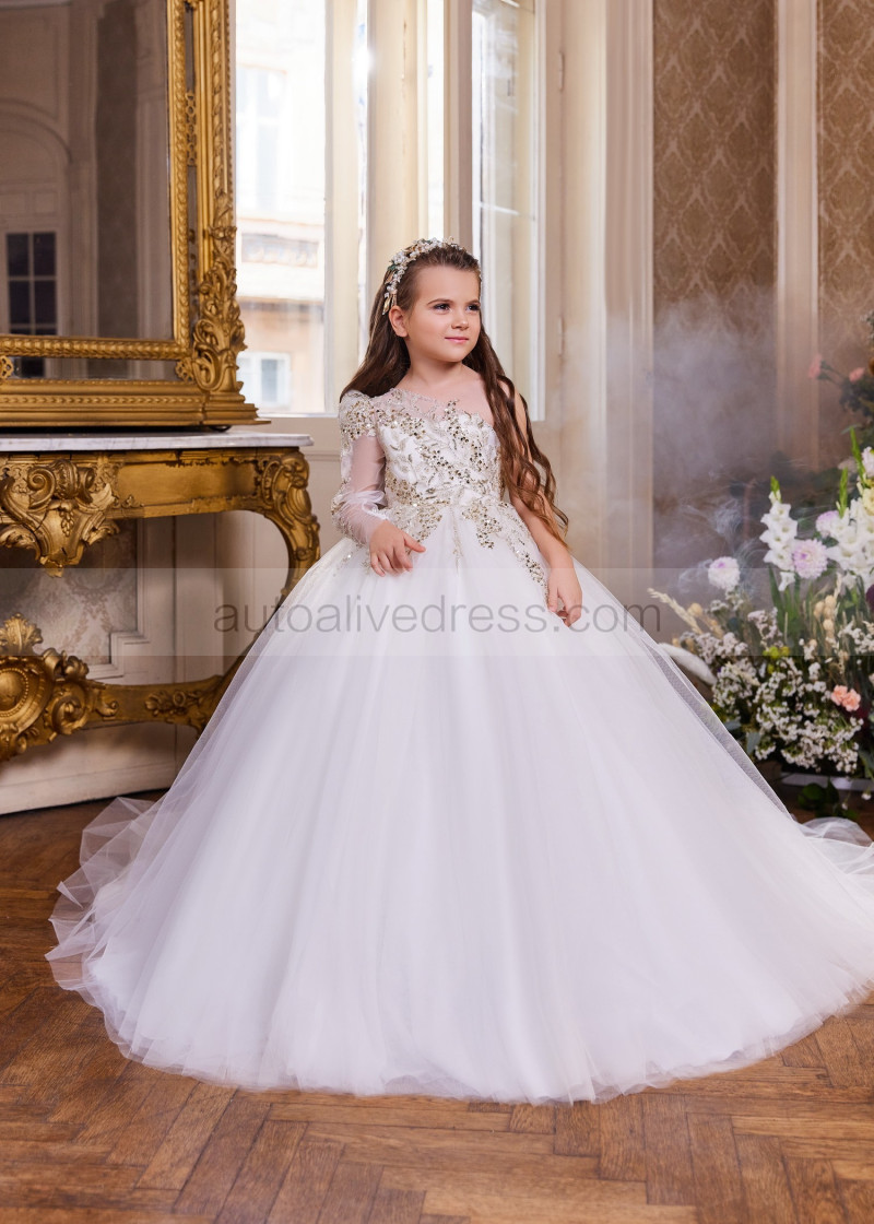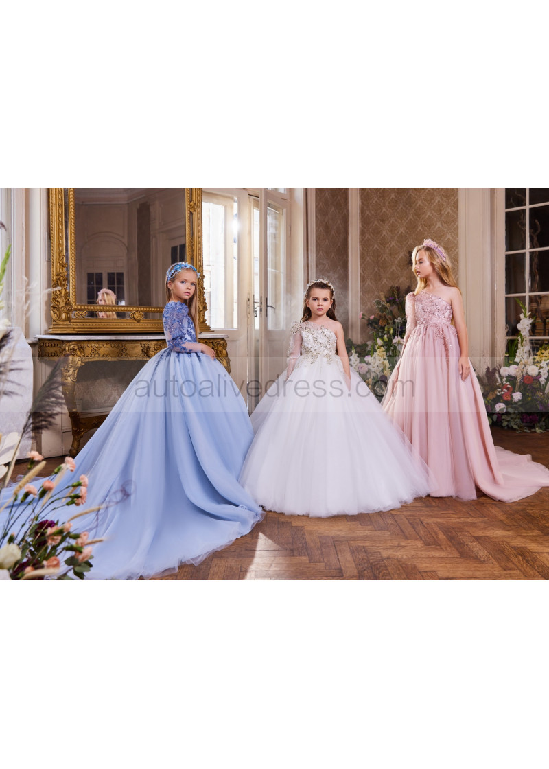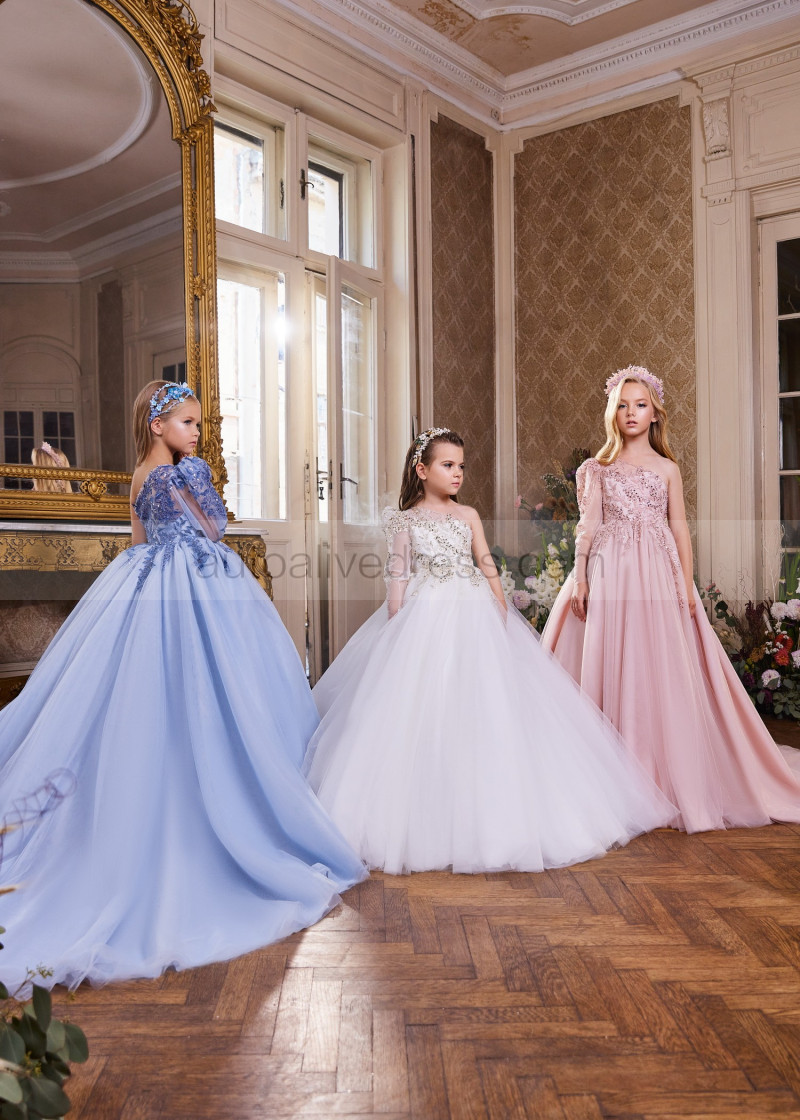 One Shoulder Beaded Lace Tulle Sparkly Flower Girl Dress