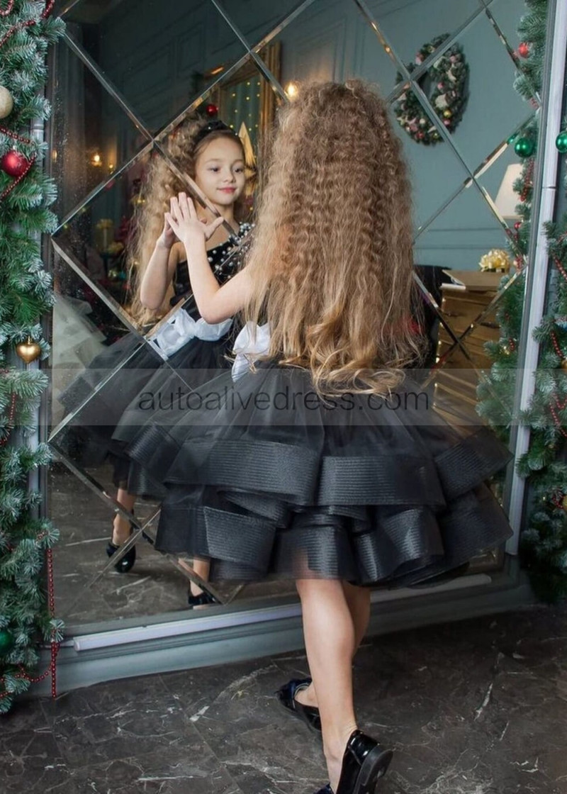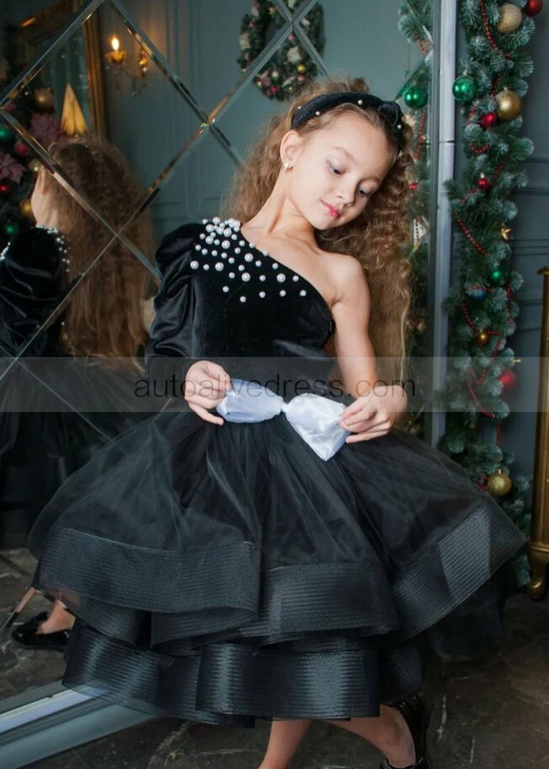 One Shoulder Black Satin Pearls Embellished Flower Girl Dress