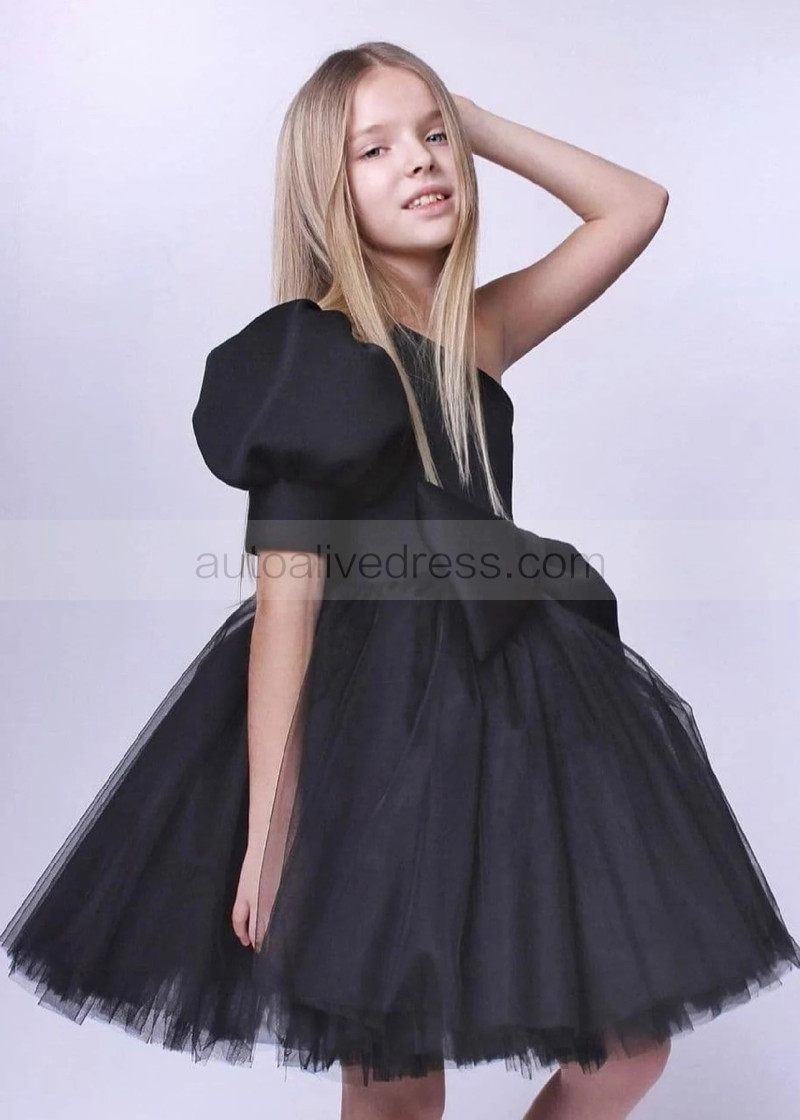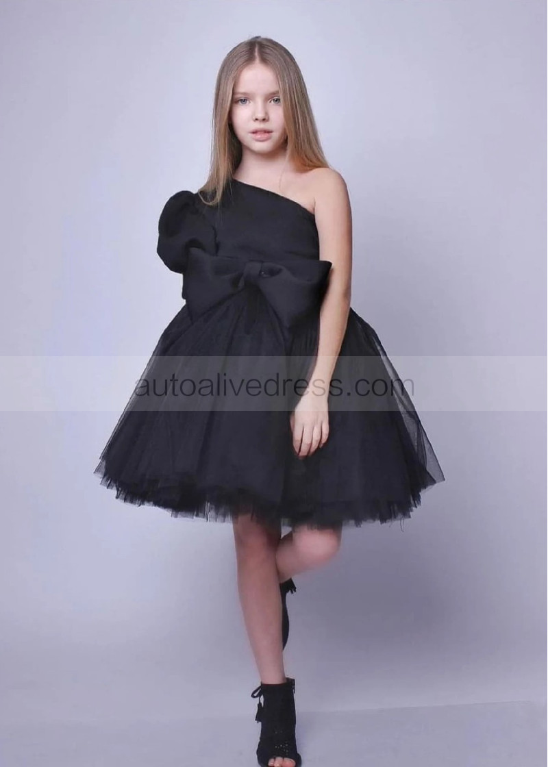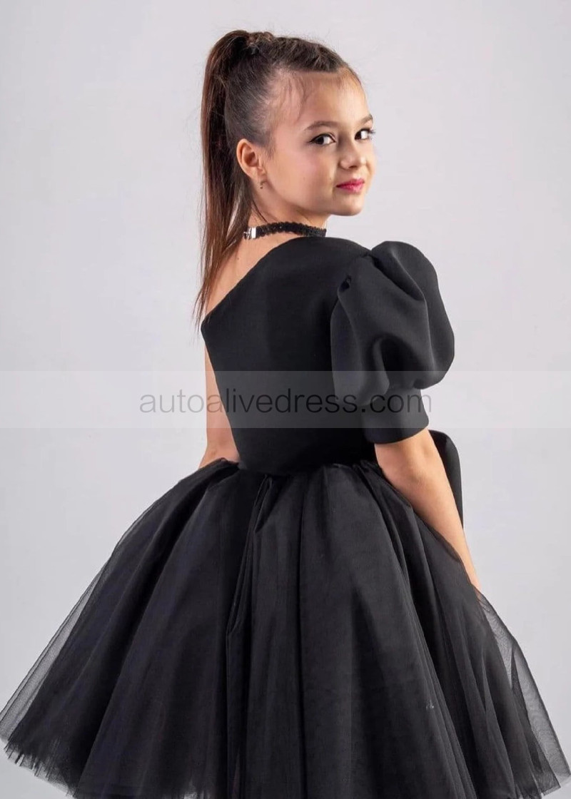 One Shoulder Black Satin Tulle Flower Girl Dress