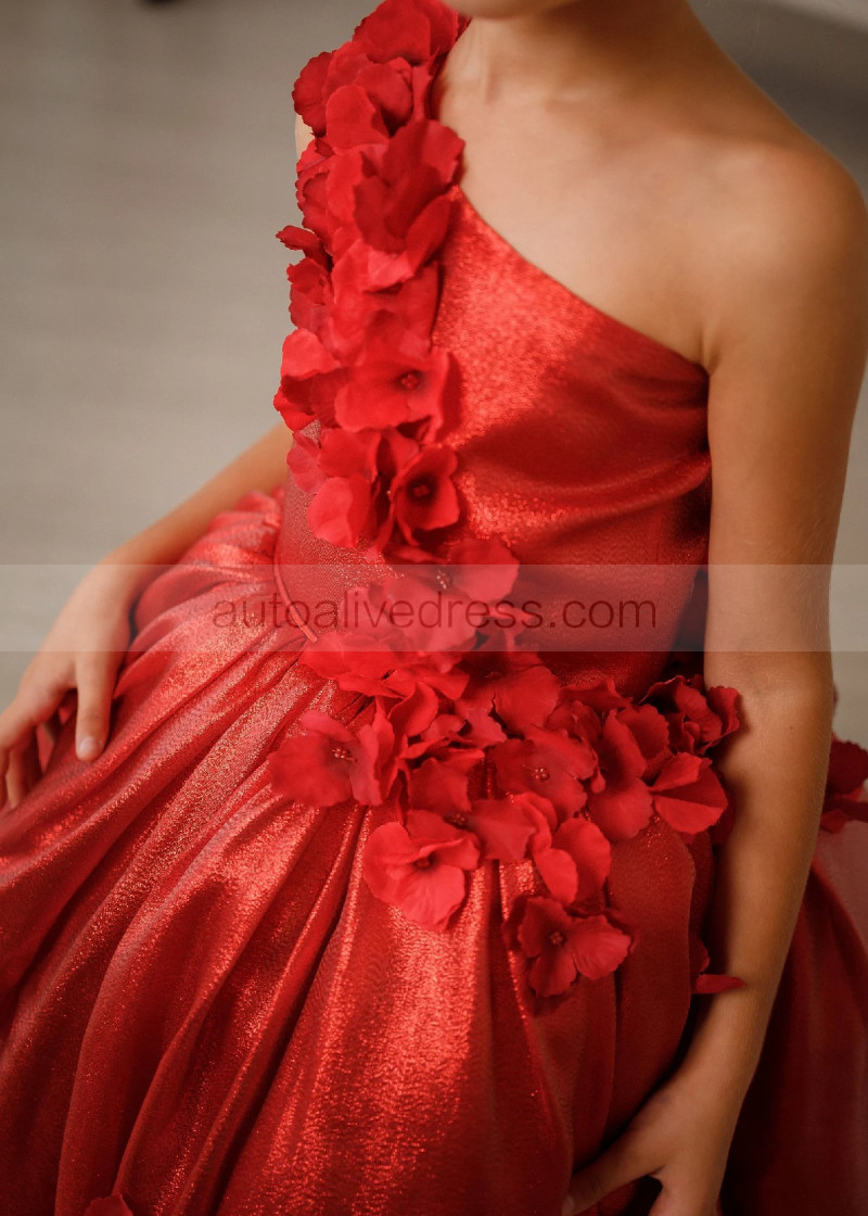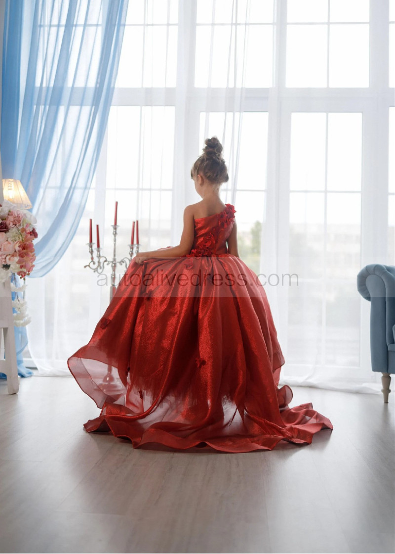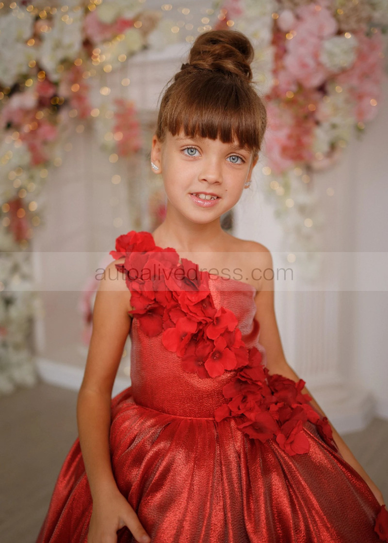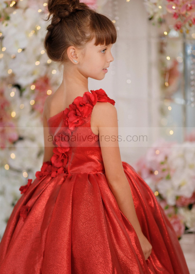 One Shoulder Dark Red 3D Flowers Shiny Organza Flower Girl Dress