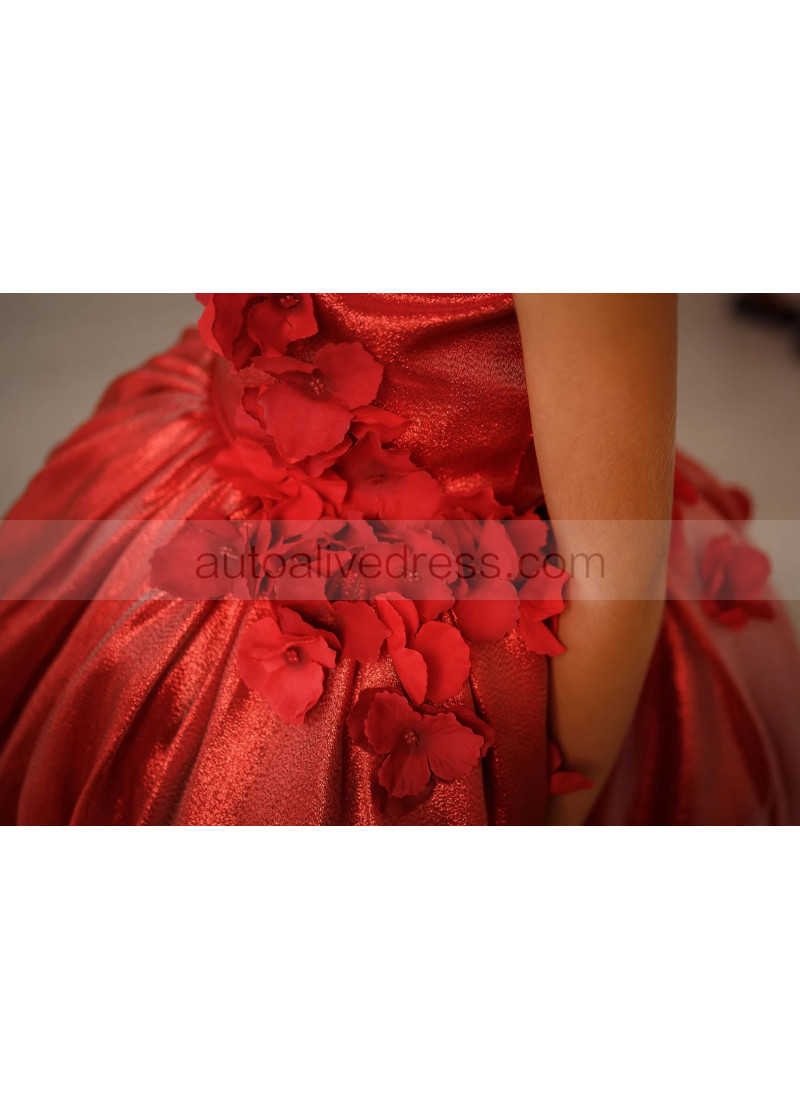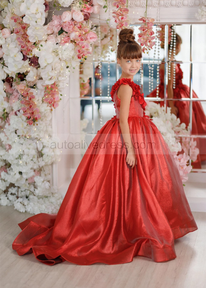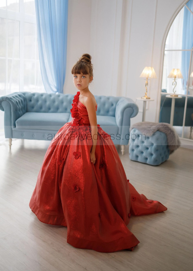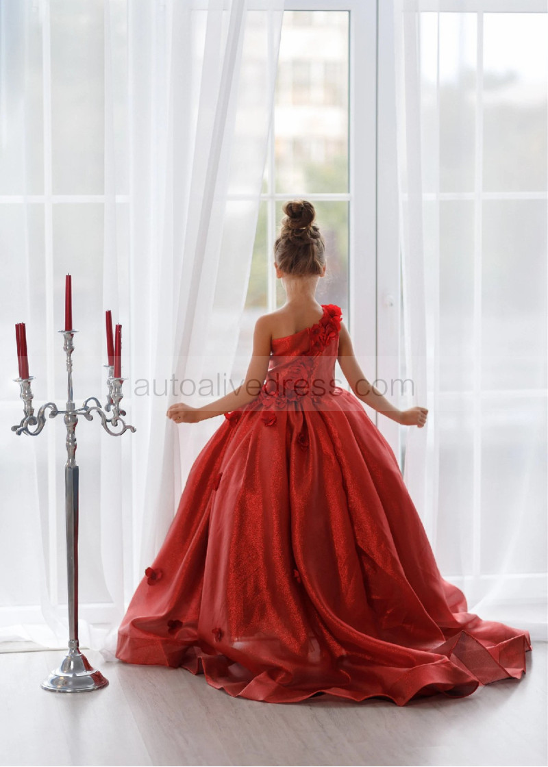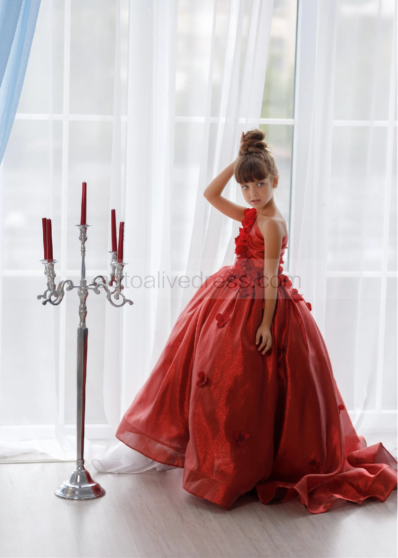 One Shoulder Dark Red 3D Flowers Shiny Organza Flower Girl Dress