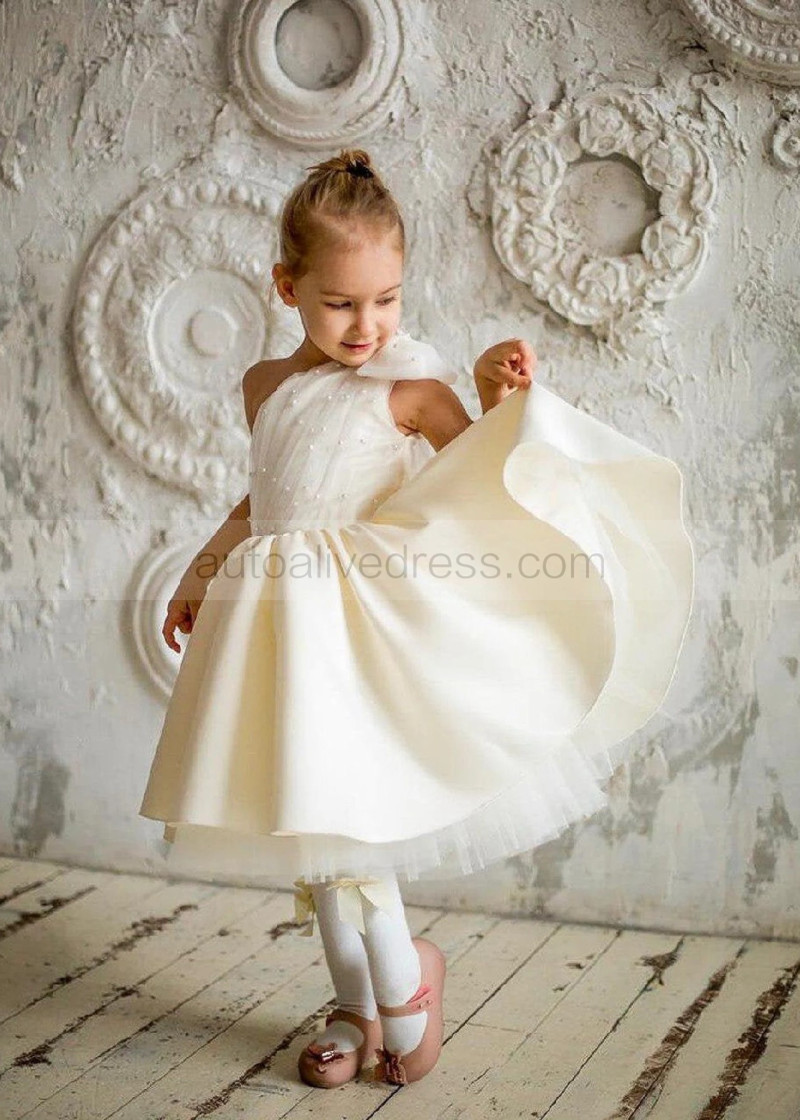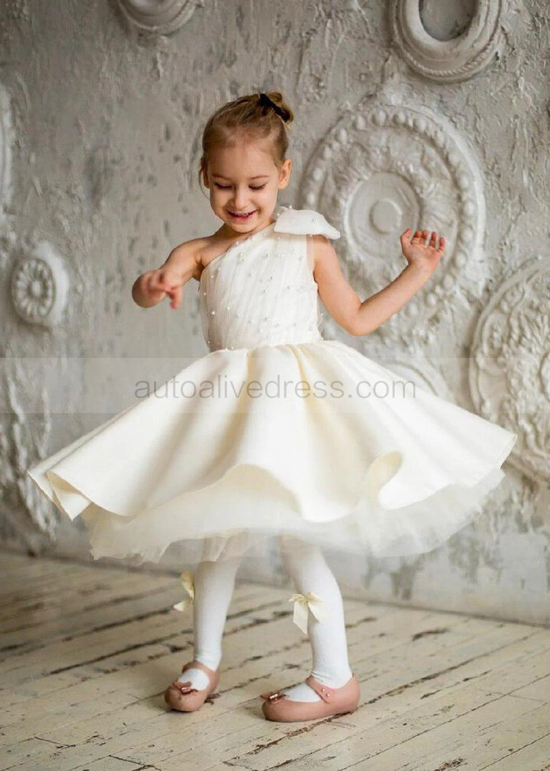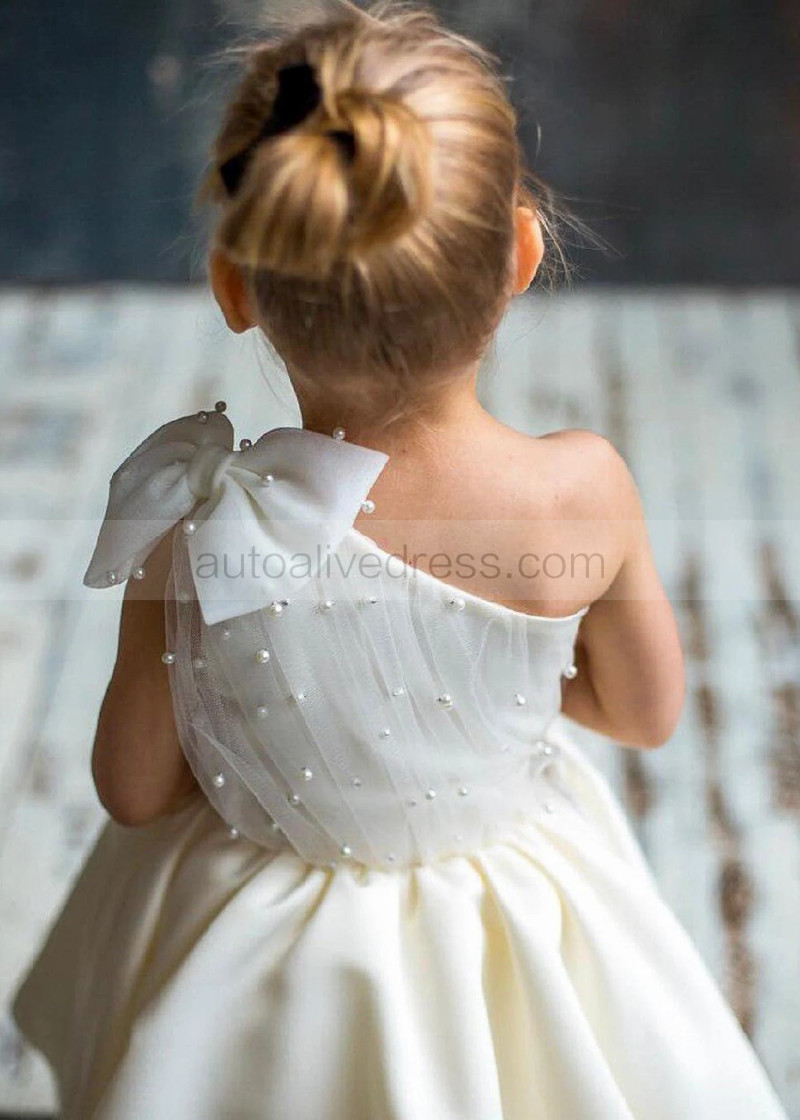 One Shoulder Ivory Pearl Beaded Flower Girl Dress