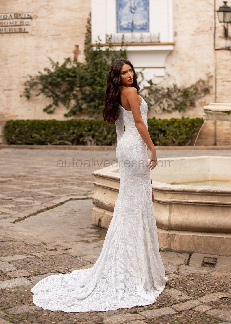 One Shoulder Ivory Sequin Slit Timeless Evening Dress