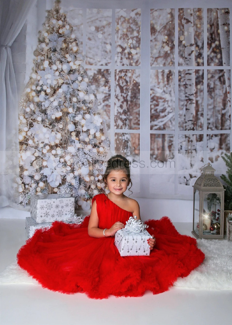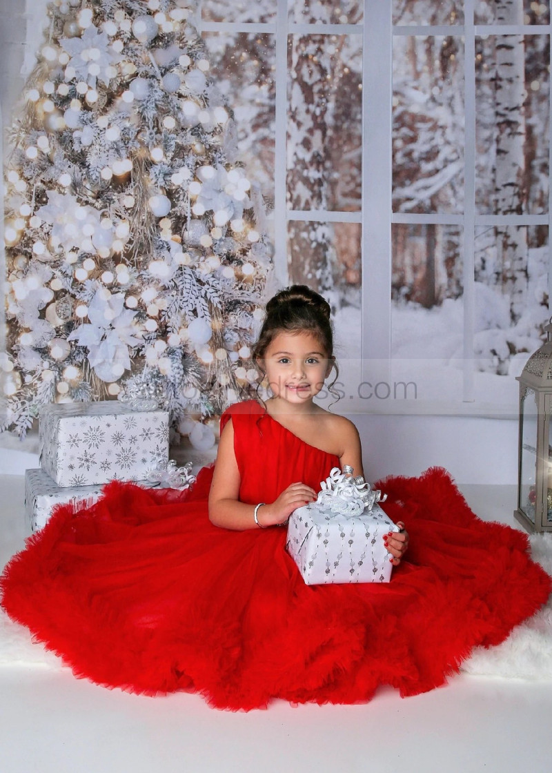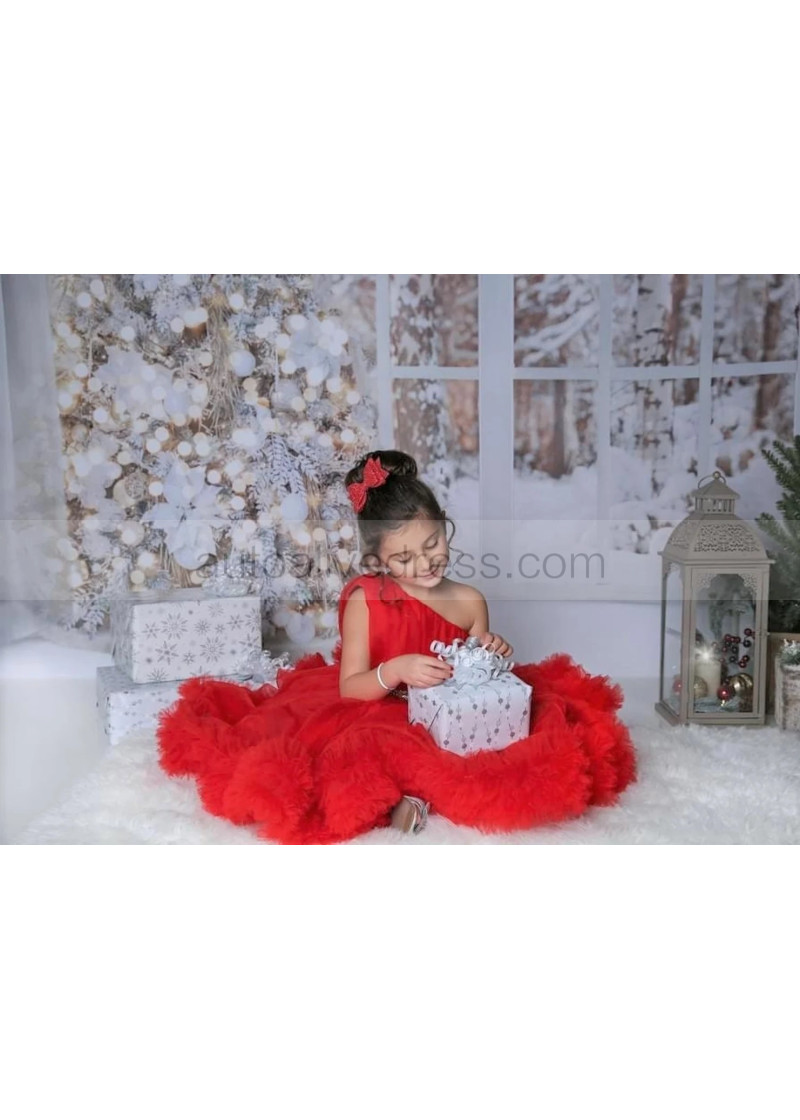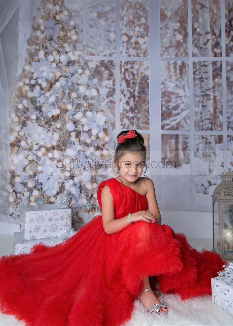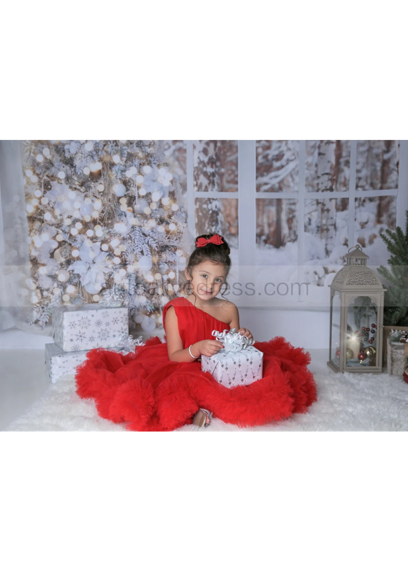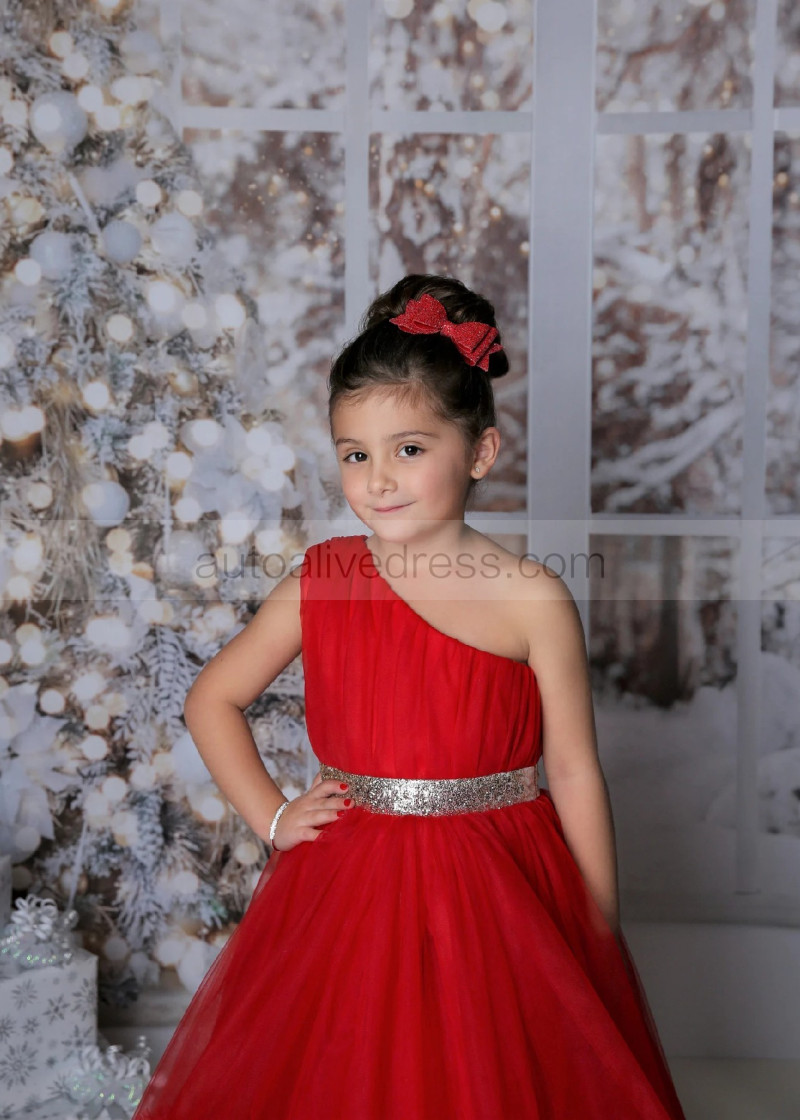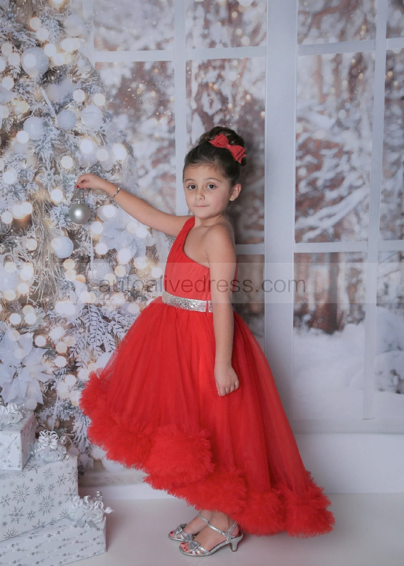 One Shoulder Red Tulle High Low Flower Girl Dress