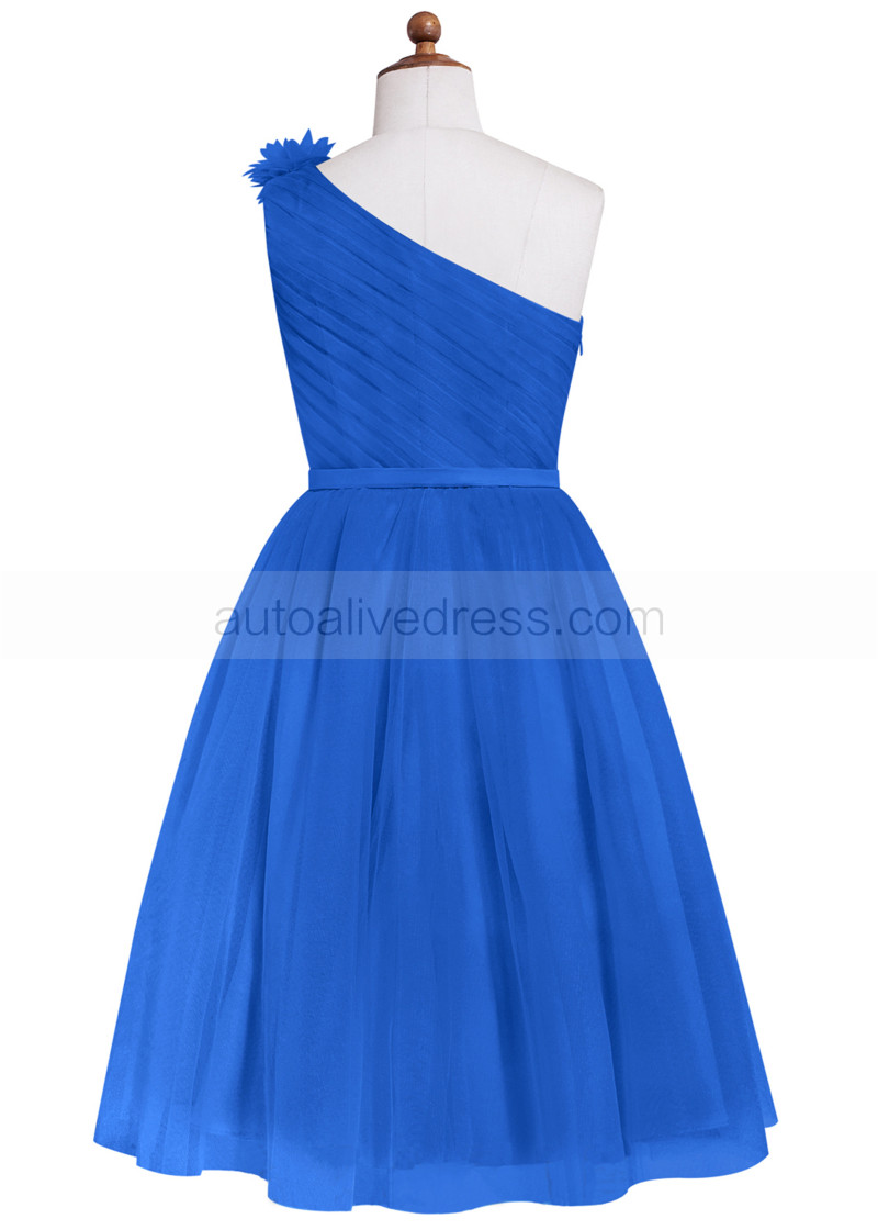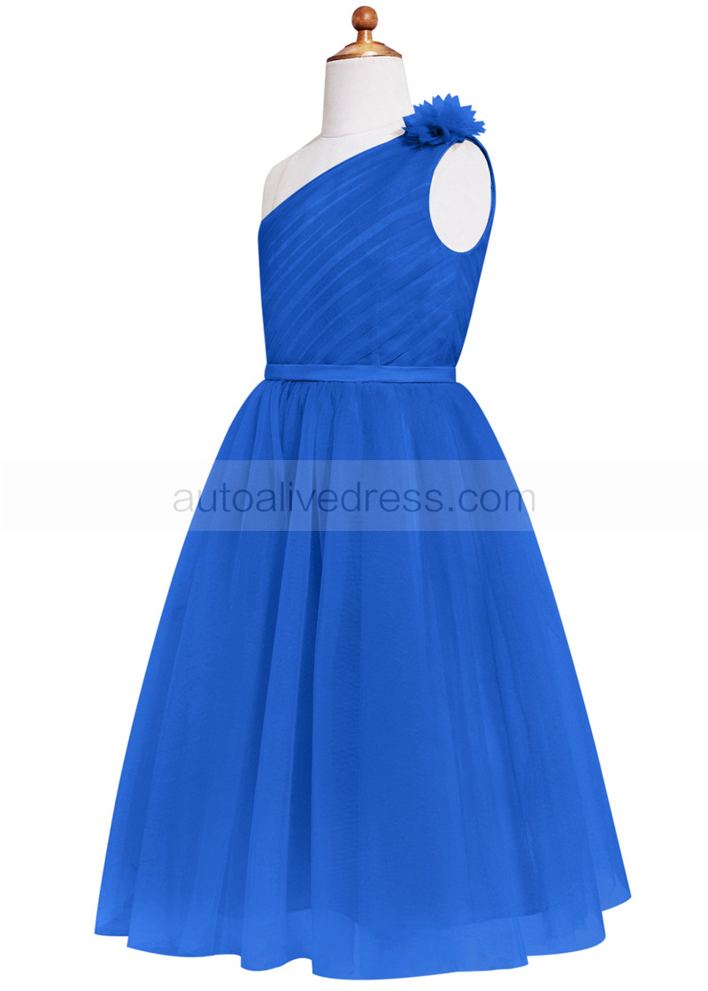 One Shoulder Royal Blue Pleated Tulle Junior Bridesmaid Dress