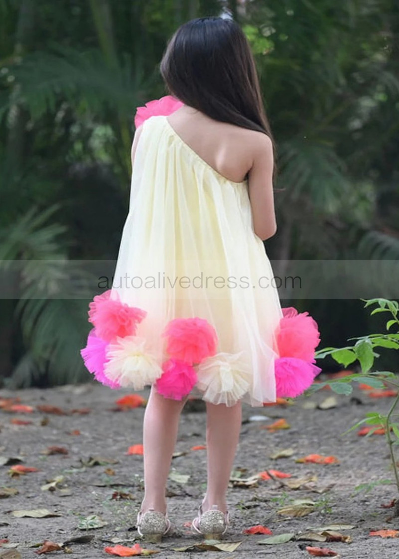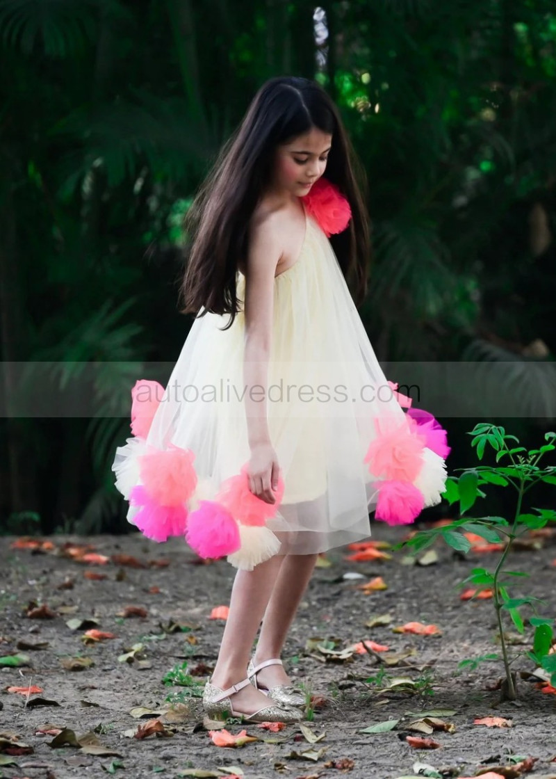 One Shoulder Yellow Pom Pom Tulle Flower Girl Dress
