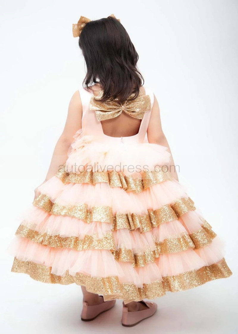 Peach Tulle Gold Sequin Tiered Flower Girl Dress