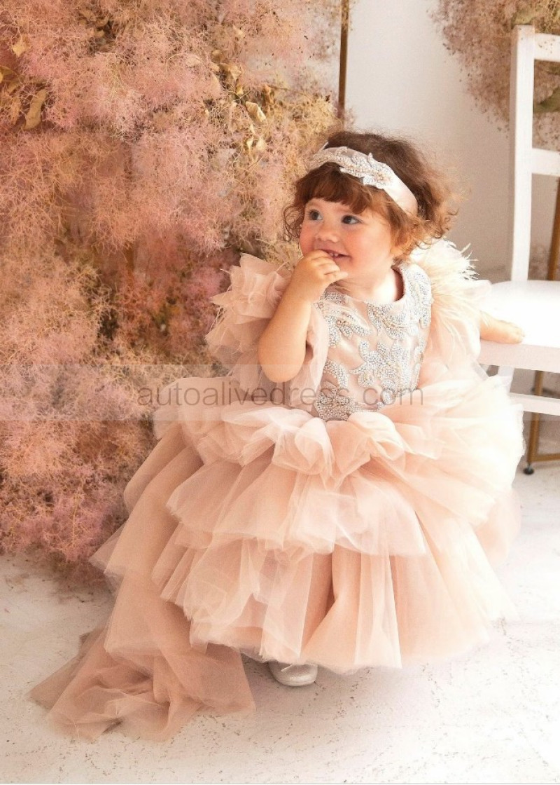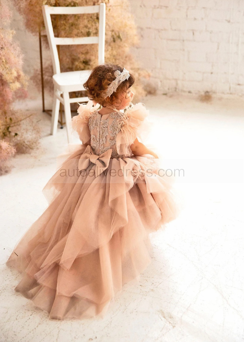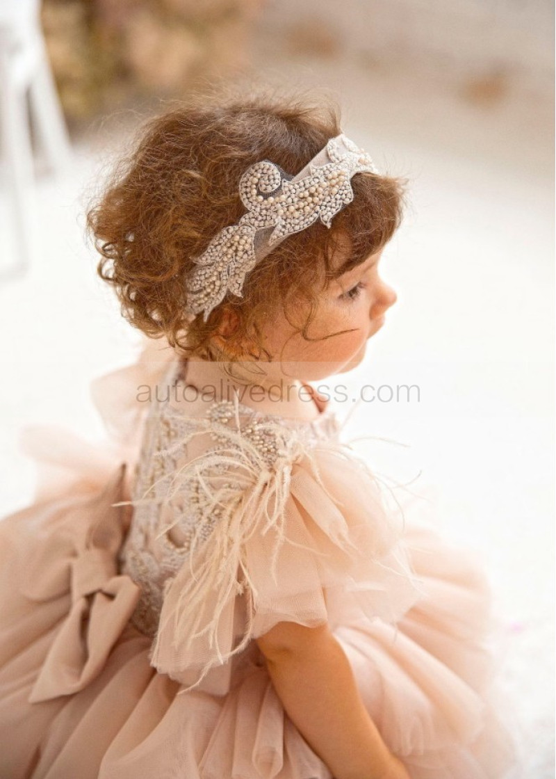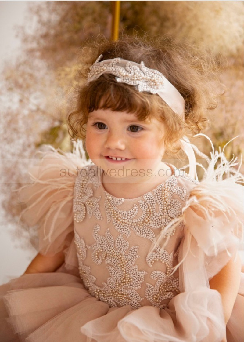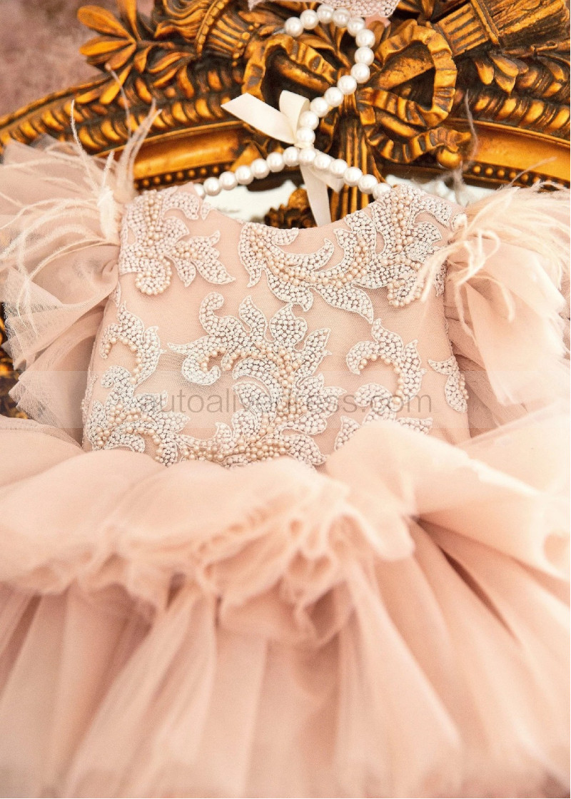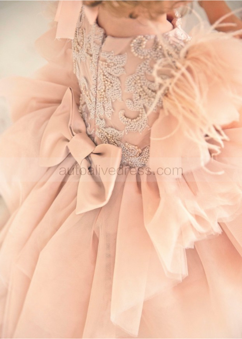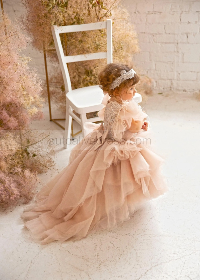 Pearl Beaded Lace Tulle High Low Flower Girl Dress