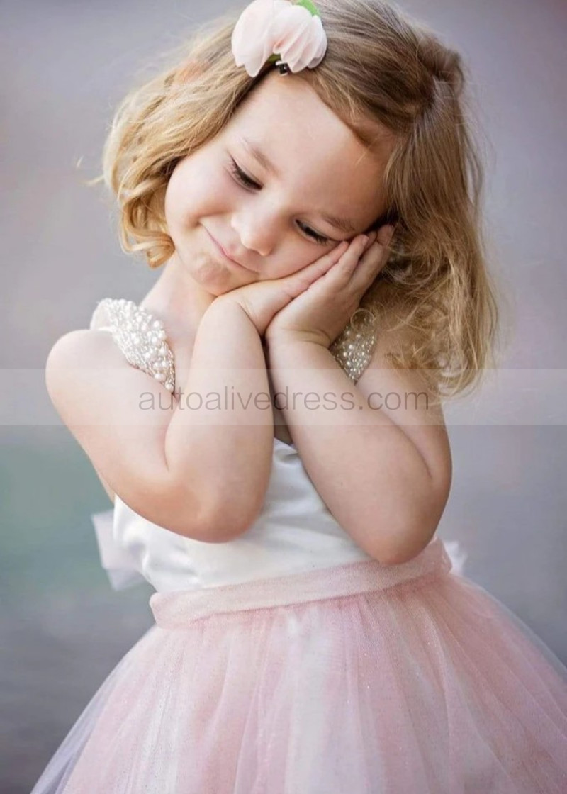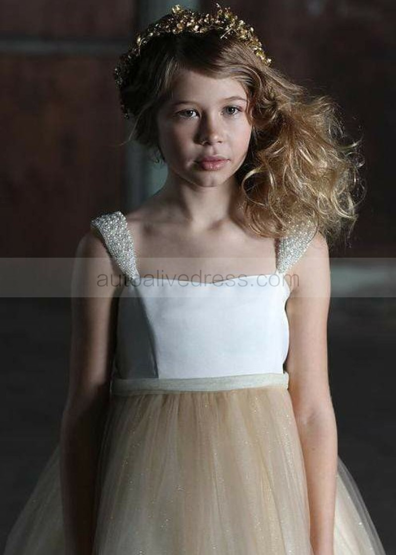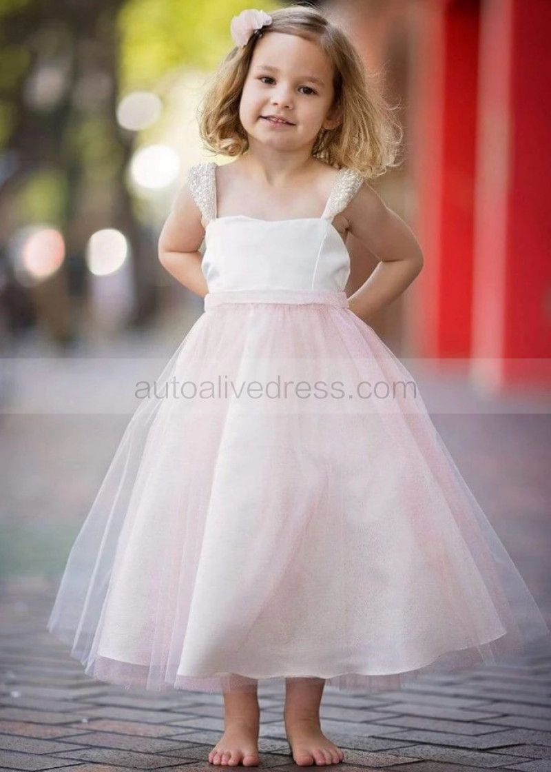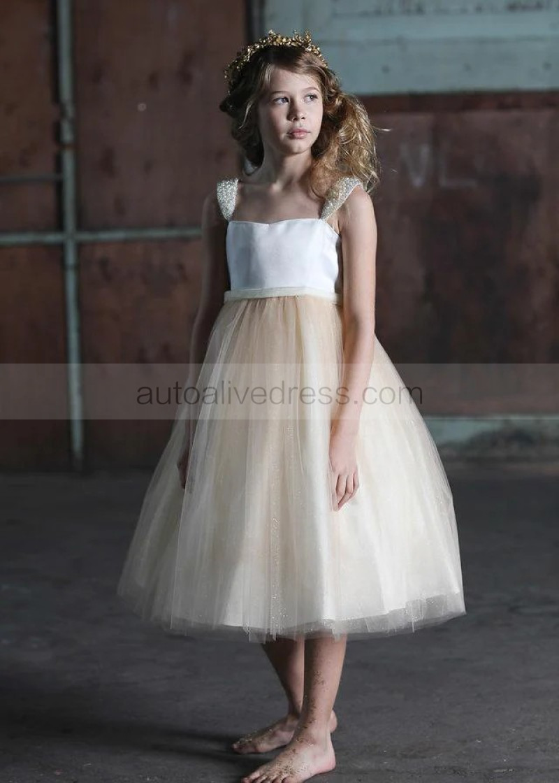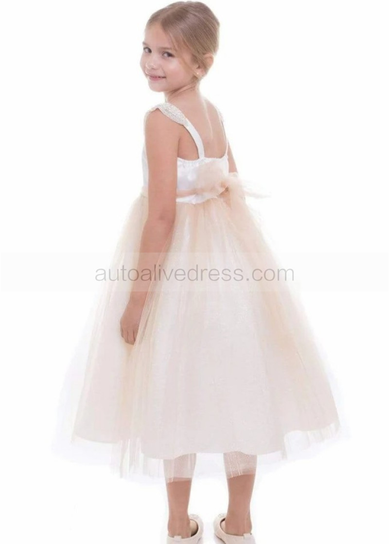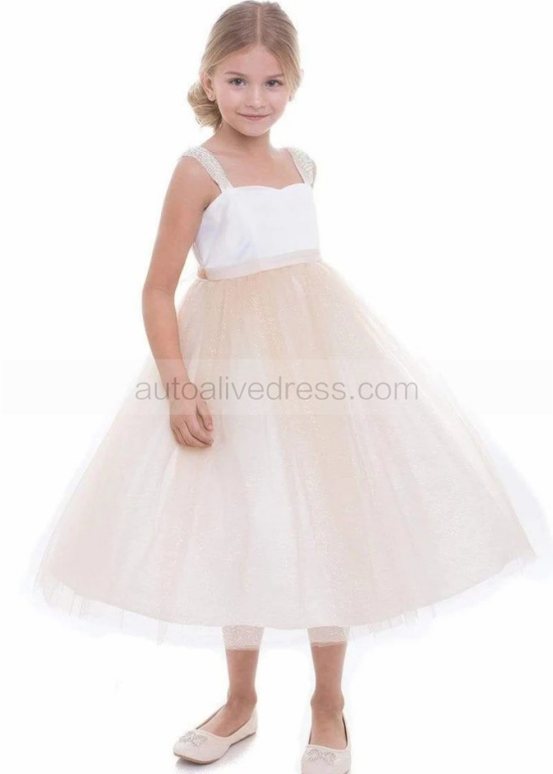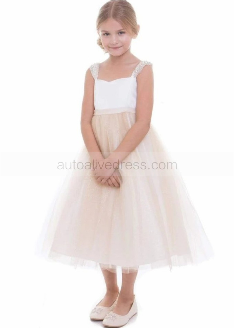 Pearl Straps Shimmering Tulle Tea Length Flower Girl Dress