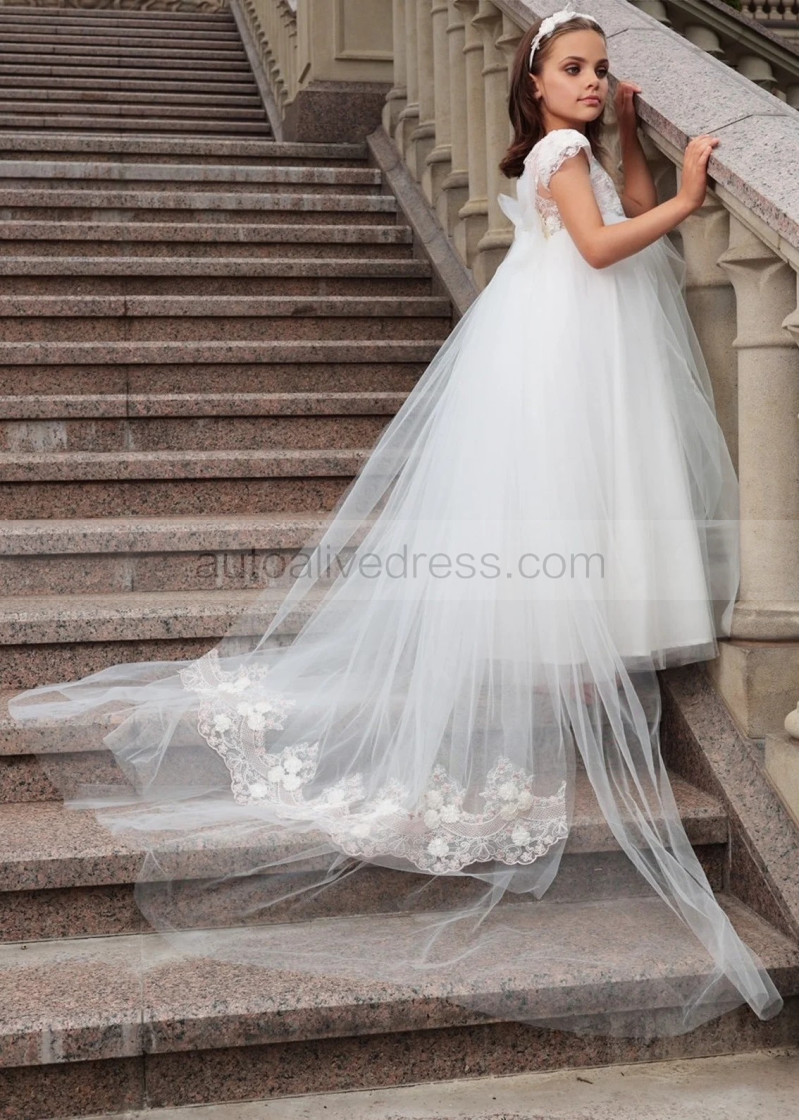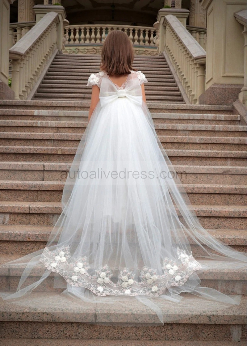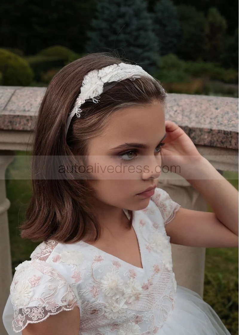 Pink Lace Ivory Tulle Flower Girl Dress With Train