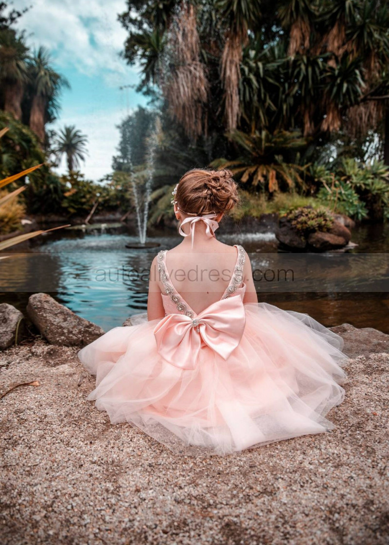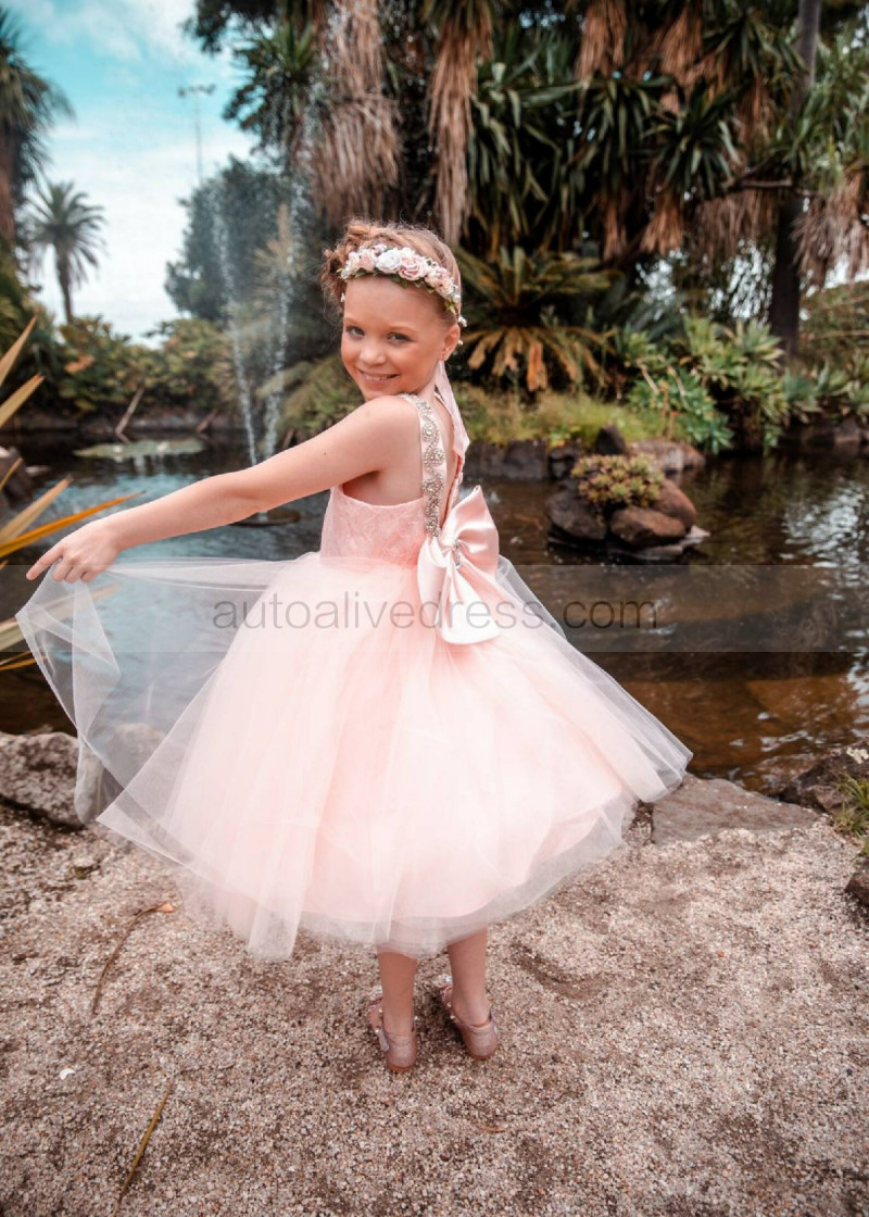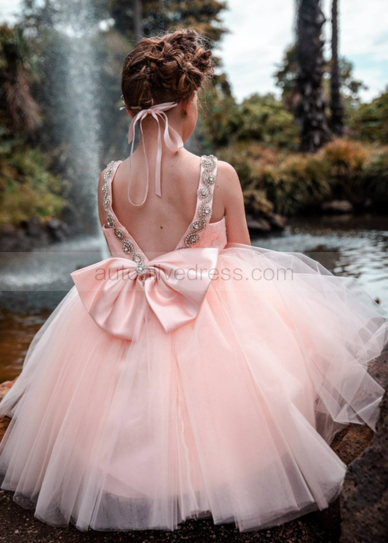 Pink Lace Tulle Beaded V Back Flower Girl Dress