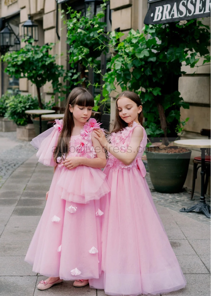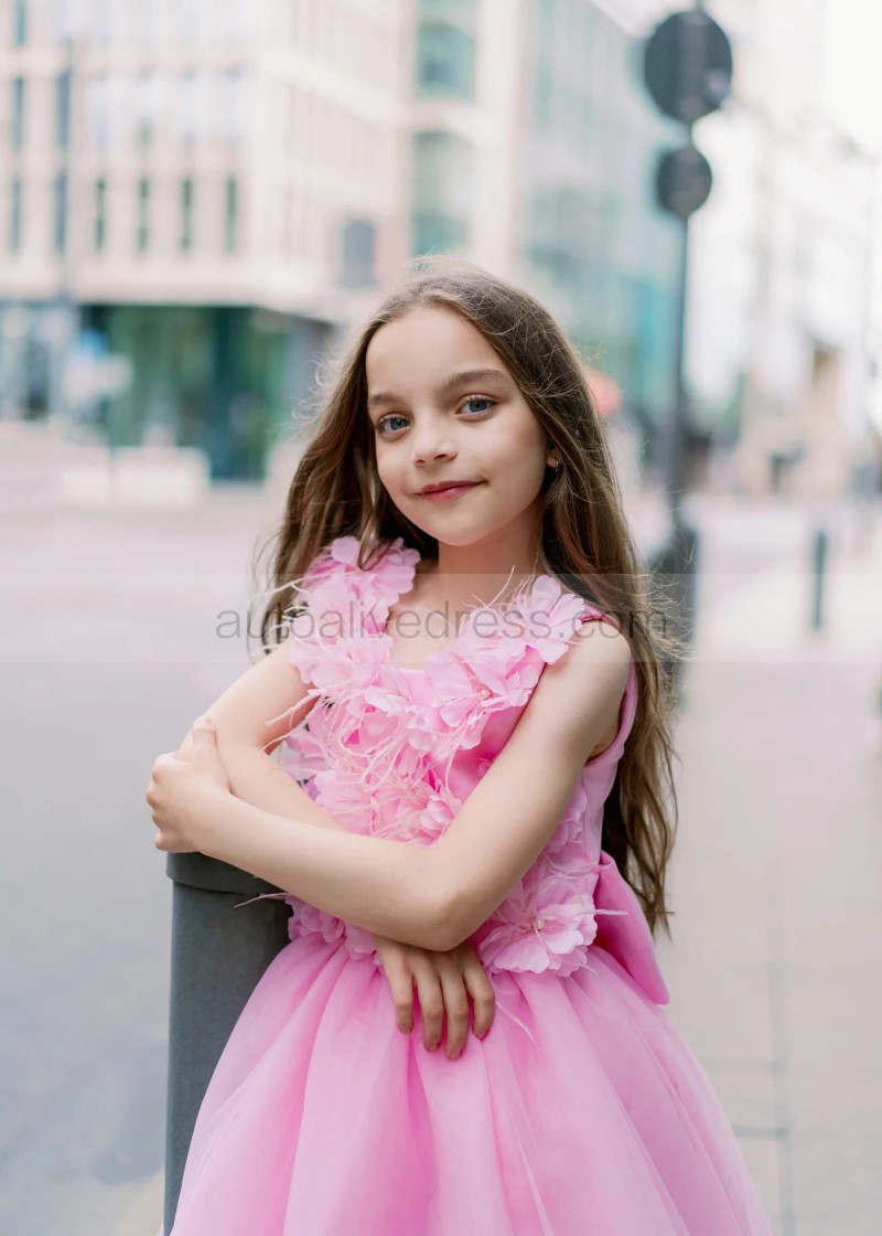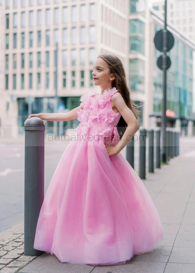 Pink Tulle 3D Flower Appliques Floor Length Flower Girl Dress