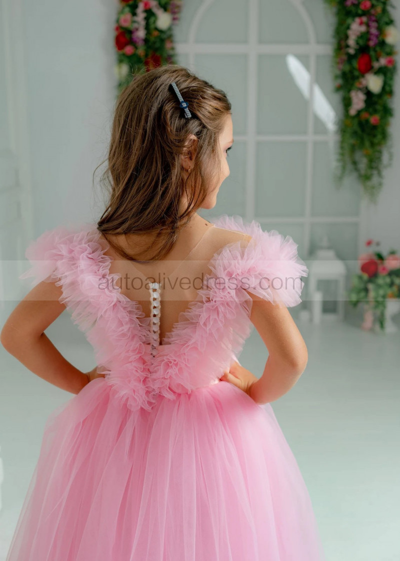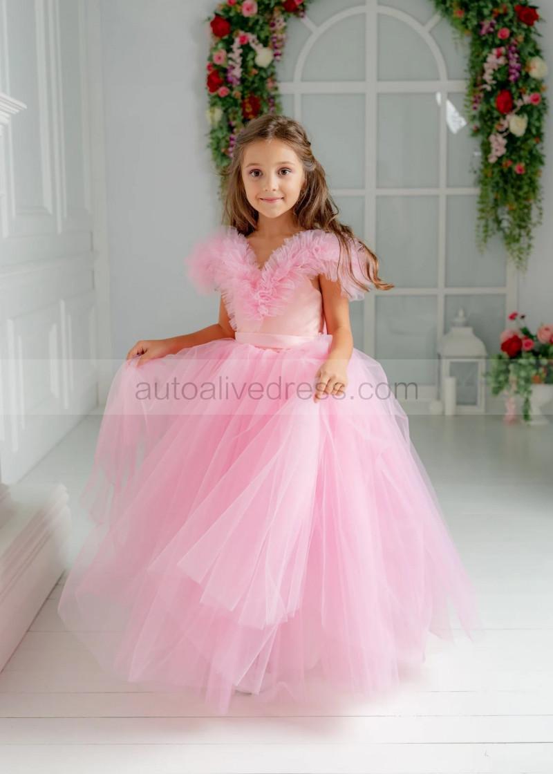 Pink Tulle Ruffle Ankle Length Flower Girl Dress