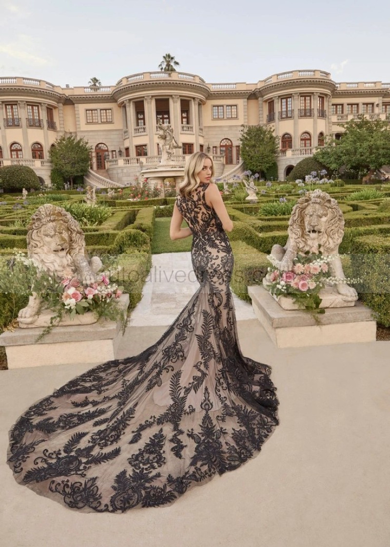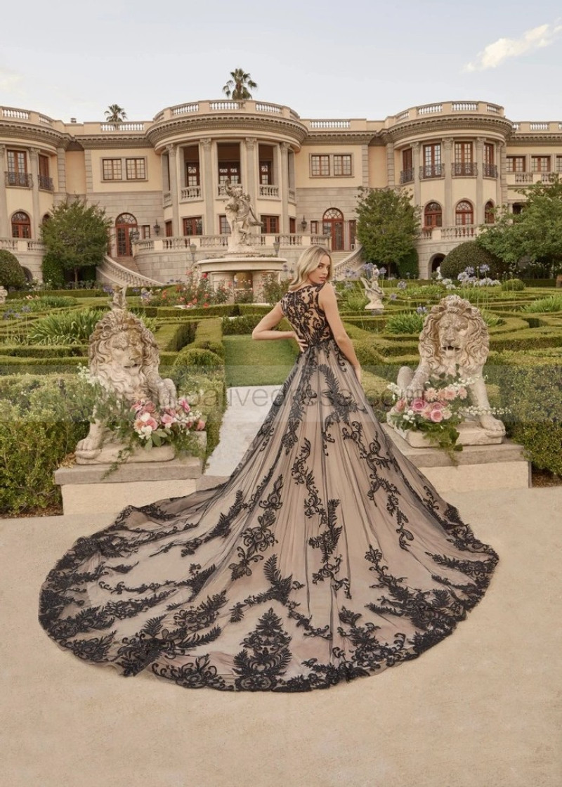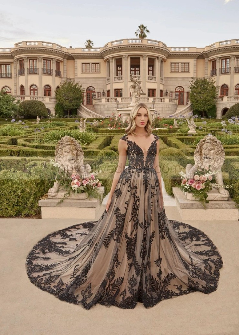 Plunging Neck Black Sequined Lace Tulle Wedding Dress